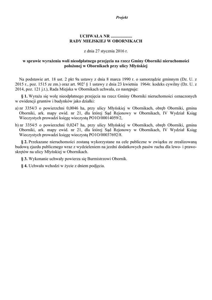 Projekt UCHWAŁA NR .................... RADY MIEJSKIEJ W OBORNIKACH z dnia 27 stycznia 2016 r. w sprawie wyrażenia woli nieodpłatnego przejęcia na rzecz Gminy Oborniki nieruchomości położonej w Obornikach przy ulicy Młyńskiej Na podstawie art. 18 ust. 2 pkt 9a ustawy z dnia 8 marca 1990 r. o samorządzie gminnym (Dz. U. z 2015 r., poz. 1515 ze zm.) oraz art. 9021 § 1 ustawy z dnia 23 kwietnia 1964r. kodeks cywilny (Dz. U. z 2014, poz. 121 j.t.), Rada Miejska w Obornikach uchwala, co następuje: § 1. Wyraża się wolę nieodpłatnego przejęcia na rzecz Gminy Oborniki nieruchomości oznaczonych w ewidencji gruntów i budynków jako działki: a) nr 3354/3 o powierzchni 0,0046 ha, przy ulicy Młyńskiej w Obornikach, obręb Oborniki, gmina Oborniki, ark. mapy ewid. nr 21, dla której Sąd Rejonowy w Obornikach, IV Wydział Ksiąg Wieczystych prowadzi księgę wieczystą PO1O/00014059/2, b) nr 3354/5 o powierzchni 0,0247 ha, przy ulicy Młyńskiej w Obornikach, obręb Oborniki, gmina Oborniki, ark. mapy ewid. nr 21, dla której Sąd Rejonowy w Obornikach, IV Wydział Ksiąg Wieczystych prowadzi księgę wieczystą PO1O/00037692/8. § 2. Przekazane nieruchomości zostaną wykorzystane na cele publiczne w związku ze zrealizowaną budową zjazdu publicznego wraz z wydzieleniem na jezdni dodatkowych pasów ruchu dla lewo- i prawoskrętów na ulicy Młyńskiej w Obornikach. § 3. Wykonanie uchwały powierza się Burmistrzowi Obornik. § 4. Uchwała wchodzi w życie z dniem podjęcia. UZASADNIENIE Nieodpłatne przekazanie przedmiotowych nieruchomości opisanych w § 1 na rzecz Gminy Oborniki jest następstwem umowy o współpracy z dnia 23 lutego 2015r. jaka została zawarta między Gminą Oborniki a Inwestorem obiektu handlowego w sprawie określenia zasad i zakresu współpracy przy przebudowie układu komunikacyjnego na ulicy Młyńskiej w Obornikach. Prywatny Inwestor zobowiązał się do wykonania przebudowy drogi gminnej ulicy Młyńskiej w Obornikach w zakresie budowy zjazdu publicznego wraz z wydzieleniem na jezdni dodatkowych pasów ruchu dla lewo- i prawo-skrętów do nowopowstałych obiektów handlowych i usługowych. Dla kompleksowego zmodernizowania tego odcinka drogi uznano za celowe wykonanie poszerzenia pasa drogowego drogi gminnej w celu wykonania zjazdu z ulicy Młyńskiej w Obornikach (dz. nr 1051 - obręb Oborniki), tak aby zachować bezpieczny i spójny ciąg komunikacyjny (zarówno drogowy jaki i pieszy). Po zrealizowaniu zadania Inwestor zgodnie z zawartą umową o współpracy z dnia 23 lutego 2015r. zdeklarował nieodpłatne przekazanie na rzecz Gminy Oborniki działek, które zostały wydzielone pod drogę (zjazd) oraz pokrycia wszelkich kosztów z tym związanych. Długość przebudowanego odcinka w pasie drogi gminnej – ca 141,0 m. Realizacja zamierzenia inwestycyjnego została zrealizowana na podstawie uzgodnionej przez Gminę Oborniki dokumentacji projektowej (w tym zmiana stałej organizacji ruchu). Wartość nieruchomości będących przedmiotem nieodpłatnego przekazania została określona na podstawie operatu szacunkowego, wynosi 18.000,00 zł, zaś nakłady poniesione na ww. działkach przez Inwestora prywatnego wyniosły 26.481,59 zł (wg kosztorysu powykonawczego). Mając na uwadze powyższe podjęcie przedmiotowej uchwały jest zasadne.