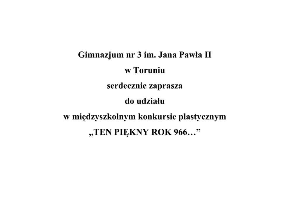 Gimnazjum nr 3 im. Jana Pawła II w Toruniu serdecznie zaprasza do udziału w międzyszkolnym konkursie plastycznym ,,TEN PIĘKNY ROK 966…” Regulamin konkursu I Organizator: Gimnazjum nr 3 im. Jana Pawła II w Toruniu II Cele konkursu: uczczenie 1050 rocznicy chrztu Polski, uświadomienie znaczenia chrztu Polski w 966 roku, rozwój umiejętności plastycznych młodzieży, kształtowanie wyobraźni historycznej uczniów, odwoływanie się do nieprzemijających wartości wychowania w duchu poszanowania historii Polski i tradycji. III Warunki uczestnictwa: udział w konkursie polega na indywidualnym wykonaniu plakatu upamiętniającego 1050 rocznicę chrztu Polski, w konkursie mogą wziąć udział uczniowie gimnazjum, do konkursu może przystąpić dowolna liczba uczniów danej szkoły, format plakatu: A2 lub A1, technika wykonania plakatu – dowolna, nie będą przyjmowane prace zbiorowe. IV Dane uczestnika: imię i nazwisko autora, klasa, szkoła, adres, telefon, - imię i nazwisko nauczyciela/ opiekuna, pod kierunkiem którego uczeń przygotował pracę. IV Kontakt: w razie niejasności związanych z regulaminem prosimy o kontakt telefoniczny z p. Anną Kołodziej- Bielawską tel. 693149933 V Termin i miejsce dostarczanie prac: do 31 maja 2016 roku, na adres: Gimnazjum nr 3, ul. Żwirki i Wigury 49, 87-100 Toruń z dopiskiem: Konkurs plastyczny ,, Ten piękny rok 966…” VI Uwagi dodatkowe: prace przechodzą na własność organizatorów, decyzja jury jest ostateczna (od werdyktu nie przysługuje odwołanie), nagroda główna- tablet multimedialny Galaxy Tab A uroczyste rozdanie nagród odbędzie się w dniu 15 czerwca br. o godz.12.00 w auli Gimnazjum nr 3 w Toruniu przy ul. Żwirki i Wigury 49.