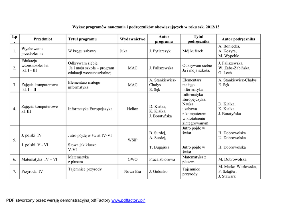 Wykaz programów nauczania i podręczników obowiązujących w roku szk. 2012/13 Lp . 1. 2. 3. 4. Przedmiot Tytuł programu Wydawnictwo W kręgu zabawy Juka Autor programu Tytuł podręcznika Autor podręcznika J. Pytlarczyk Mój kuferek A. Boniecka, A. Kozyra, M. Wypchło MAC J. Faliszewska Odkrywam siebie Ja i moja szkoła. J. Faliszewska, W. Żaba-Żabińska, G. Lech Elementarz małego informatyka MAC A. StankiewiczChałys E. Sęk Zajęcia komputerowe kl. III Informatyka Europejczyka Helion J. polski IV Jutro pójdę w świat IV-VI J. polski V - VI Słowa jak klucze V-VI Wychowanie przedszkolne Edukacja wczesnoszkolna kl. I - III Zajęcia komputerowe kl. I – II Odkrywam siebie. Ja i moja szkoła – program edukacji wczesnoszkolnej 5. WSiP 6. Matematyka IV – VI 7. Przyroda IV Matematyka z plusem Tajemnice przyrody D. Kiałka, K. Kiałka, J. Boratyńska B. Surdej, A. Surdej, T. Bugajska GWO Nowa Era PDF stworzony przez wersję demonstracyjną pdfFactory www.pdffactory.pl/ Praca zbiorowa J. Golonko Elementarz małego informatyka Informatyka Europejczyka. Nauka i zabawa z komputerem w kształceniu zintegrowanym Jutro pójdę w świat A. Stankiewicz-Chałys E. Sęk Jutro pójdę w świat Matematyka z plusem H. Dobrowolska Tajemnice przyrody D. Kiałka, K. Kiałka, J. Boratyńska H. Dobrowolska U. Dobrowolska M. Dobrowolska M. Marko-Worłowska, F. Szlajfer, J. Stawarz 8. Przyroda V - VI Przyroda Wiking E. Dudek i inni Przyroda 5,6 Historia IV Wehikuł czasu. Program nauczania historii i społeczeństwa w szkole podstawowej GWO R. Tocha Historia i społeczeństwo 9. Historia V - VI 10. Zajęcia komputerowe IV 11. Informatyka V – VI 12. Zajęcia techniczne 13. Muzyka 14. Plastyka Podróże w czasie. Program nauczania historii i wiedzy o społeczeństwie w szkole podstawowej Informatyka Europejczyka. Program Nauczania informatyki w szkole podst. kl. IV-VI Informatyka Europejczyka. Program nauczania informatyki w szkole podstawowej Technika. Program nauczania Moja muzyka- program nauczania Plastyka GWO J. Rześniowiecki T. Małkowski Historia i społeczeństwo Informatyka Europejczykapodręcznik do zajęć komputerowych – Kl. IV .Edycja Windows XPzeszyt ćwiczeń Praca zbiorowa T. Małkowski Helion D. Kiałka, K. Kiałka Helion D. Kiałka Informatyka Europejczyka D. Kiałka z zespołem PWN A. Nowak Technika. Projektuję A. Nowak E. Korowajczyk Moja muzyka E. Korowajczyk S.K. Stopczyk Plastyka S.K. Stopczyk Nowa Era WSiP PDF stworzony przez wersję demonstracyjną pdfFactory www.pdffactory.pl/ D. Kiałka, K. Kiałka J. angielski I - III J. angielski IV - VI 15. 16. 17. J. angielski w nauczaniu zintegrowanym. Program nauczania do edukacji wczesnoszkolnej Program nauczania dla klas 4-6 DKW-4014-59/99( stara podstawa ) Program nauczania dla klas 4-6 szkoły podstawowej (nowa podstawa) Zdrowie. Sport. Rekreacja Koncepcja wychowania fizycznego dla wszystkich etapów edukacyjnych. New Sparks Plus 1,2,3 Rob Nolasco Rob Nolasco Oxford M. Ellis, A. Rak WAM, księża jezuici, Kraków 2012 Religia Wychowanie fizyczne M. Szpotowicz, M. SzulcKurpaska IMPULS PDF stworzony przez wersję demonstracyjną pdfFactory www.pdffactory.pl/ New English Zone 1,2,3 podręcznik + ćwiczenia Zaproszeni przez Boga – podręcznik U. Kierczak ---- Komitet pod redakcją ks. Zbigniewa Marka SJ ---