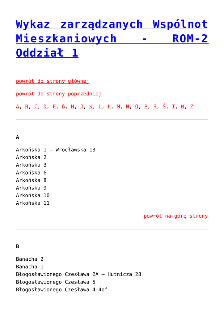 Wykaz zarządzanych Wspólnot Mieszkaniowych ROM-2 Oddział 1 powrót do strony głównej powrót do strony poprzedniej A, B, C, D, F, G, H, J, K, L, Ł, M, N, O, P, S, Ś, T, W, Z A Arkońska Arkońska Arkońska Arkońska Arkońska Arkońska Arkońska Arkońska 1 – Wrocławska 13 2 3 6 8 9 10 11 powrót na górę strony B Banacha 2 Banacha 1 Błogosławionego Czesława 2A – Hutnicza 28 Błogosławionego Czesława 5 Błogosławionego Czesława 4-4of Błogosławionego Błogosławionego Błogosławionego Błogosławionego Błogosławionego Błogosławionego Błogosławionego Błogosławionego Błogosławionego Błogosławionego Błogosławionego Błogosławionego Błogosławionego Bohaterów Getta Bohaterów Getta Czesława 5A Czesława 14 Czesława 24 – Paulińska 1 Czesława 26 Czesława 32-32of Czesława 44 Czesława 48-48of Czesława 50-50of Czesława 58-60 Czesława 66 Czesława 68-70 Czesława 72-74-76 Czesława 78-80-82 Warszawskiego 2 Warszawskiego 3 Bohaterów Getta Warszawskiego 17 Bohaterów Getta Warszawskiego 17A Bohaterów Getta Warszawskiego 19 powrót na górę strony C Cecylii 3 – Franciszkańska 23 Cecylii 4 – Franciszkańska 22 Częstochowska 2A Częstochowska 4 Częstochowska 5 Częstochowska 6 Częstochowska 9 Częstochowska 12-12of Częstochowska 16 Częstochowska 25 Częstochowska 27 powrót na górę strony D Dubois 4 Dubois 6-6of powrót na górę strony F Franciszkańska 17 Franciszkańska 19-19of powrót na górę strony G Gorzołki 11-11of Gorzołki 17-17a powrót na górę strony H Hutnicza Hutnicza Hutnicza Hutnicza 1 5-5A 7-7aof-7bof 26 powrót na górę strony J Jagiellońska 3A – Mitręgi 1 Jagiellońska 21-21of Jagiellońska 23-23A Jagiellońska 27-27of Jagiellońska 27A Jagiellońska 31-31of Jagiellońska 34-36 Jagiellońska 42 Jagiellońska 46 powrót na górę strony K Kaszubska 2 Kaszubska 7 Kaszubska 15 Kłodnicka 11-11of Kłodnicka 13 Konarskiego 2 – Zimnej Wody 1 Konarskiego 3 Konarskiego 5 Królewskiej Tamy 33-35-37-39 Królewskiej Tamy 41-43-45-47 Królewskiej Tamy 49-51-53-55 Królewskiej Tamy 73-75-77-79 Królewskiej Tamy 81-83-85-87 Królewskiej Tamy 89-91 Królowej Jadwigi 1 – Zabrska 16-18 Królowej Jadwigi 2 Królowej Jadwigi 4 Królowej Jadwigi 7 – Krzywa 2 – Zabrska 24 Królowej Jadwigi 8 Królowej Jadwigi 10 – Krzywa 4-6-8 Krzywa 3-5 Krzywa 7 Krzywa 7A Krzywa 7B Krzywa 9 Krzywa 9A-9B Krzywa 10 Krzywa 11-13 Krzywa 12 Krzywa 14 Krzywa 15 Krzywa 17 powrót na górę strony L Lutycka 3 Lutycka 5 Lutycka 11-13 Lutycka 15 Lutycka 21 Lutycka 25 Lutycka 27 Lutycka 29 powrót na górę strony Ł Łużycka 6 Łużycka 8 Łużycka 12 Łużycka 14-14of powrót na górę strony M Moniuszki 5 Moniuszki 7 Moniuszki 9 Moniuszki 14 Moniuszki 16 Moniuszki 18 Moniuszki 18A Moniuszki 20-20of Moniuszki 22 powrót na górę strony N Na Piasku 4 Na Piasku 5-7 Nasyp 4-4of powrót na górę strony O Okopowa 1 Okopowa 8 powrót na górę strony P Paulińska 3 Paulińska 5 Paulińska 9-9of Paulińska 11 Piwna 2 Piwna 3-5 Piwna 4 Piwna 7 Piwna 9 Piwna 13 Plac Piastów 2 Pszczyńska 1-1of Pszczyńska 3 Pszczyńska 5 Pszczyńska 9a Pszczyńska 9fr Pszczyńska 11 Pszczyńska 19 Pszczyńska 23-23of Pszczyńska 25 Pszczyńska 29 Pszczyńska Pszczyńska Pszczyńska Pszczyńska Pszczyńska 33 133-135 137-147 149-159 173-179 powrót na górę strony S Skłodowskiej 2 – Pszczyńska 67 Sportowa 1 Sportowa 3-4 Sportowa 5-6 Sportowa 7-8 Sportowa 9-10 Sportowa 11-12 Sportowa 13-14 Sportowa 15-16 Sportowa 22 Strzody 3 Szara 3 Szara 12-12A-12B powrót na górę strony Ś Świętej Katarzyny 4-4A powrót na górę strony T Toszecka 27 powrót na górę strony W Wrocławska 11-11of Wrocławska Wrocławska Wrocławska Wrocławska Wrocławska Wrocławska Wrocławska 15 16-16of 18 19 20 22-24-26 28 powrót na górę strony Z Zabrska 1-1A Zabrska 11 Zabrska 22-22of Zabrska 28 Zabrska 30 Zimnej Wody 4 Zimnej Wody 5 Zimnej Wody 6 Zwycięstwa 61A Zwycięstwa 63-63of powrót na górę strony