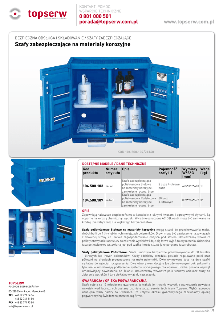 KONTAKT, POMOC, WSPARCIE TECHNICZNE 0 801 000 501 [email protected] www.topserw.com.pl BEZPIECZNA OBSŁUGA I SKŁADOWANIE / SZAFY ZABEZPIECZAJĄCE Szafy zabezpieczające na materiały korozyjne KOD 104.500.107/24160 DOSTĘPNE MODELE / DANE TECHNICZNE Kod produktu Numer Opis artykułu 104.500.103 24040 104.500.107 24160 Szafa zabezpieczająca polietylenowa Stołowa na materiały korozyjne, zamknięcie ręczne, blue Szafa zabezpieczająca polietylenowa Podstołowa na materiały korozyjne, zamknięcie ręczne, blue Pojemność szafy (l) Wymiary Waga W*S*G (kg) (mm) 2 duże 4-litrowe 495*362*413 10 butle 30 butli 1-litrowych 889*914*597 36 OPIS Zapewniają najwyższe bezpieczeństwo w kontakcie z silnymi kwasami i agresywnymi płynami. Są odporne na korozję chemiczną i wycieki. Wyraźnie oznaczone ACID (kwas) i mogą być zamykane na kłódkę (nie załączona) dla większego bezpieczeństwa. Szafy polietylenowe Stołowe na materiały korozyjne mogą służyć do przechowywania maks. dwóch butli po 4 litry lub innych mniejszych pojemników. Drzwi mogą być zawieszone na zawiasach z dowolnej strony, co ułatwia zagospodarowanie miejsca pod stołem. Umieszczony wewnątrz polietylenowy ociekacz służy do zbierania wycieków i daje się łatwo wyjąć do czyszczenia. Oddzielna taca polietylenowa wstawiana jest pod szafkę i może służyć jako poręczna taca robocza. Szafy polietylenowe Podstołowe. Szafa umożliwia bezpieczne przechowywanie do 30 butelek 1-litrowych lub innych pojemników. Każdy oddzielny przedział posiada regulowane półki oraz półeczki na drzwiach przeznaczone na małe pojemniki. Dwie wyjmowane tace na dnie szafki są łatwe do wyjęcia i oczyszczenia. Dwa otwory wentylacyjne (ze zdejmowanymi pokrywkami) z tyłu szafki umożliwiają podłączenie systemu wyciągowego dla oparów. Szafka posiada osprzęt umożliwiający powieszenie na ścianie. Umieszczony wewnątrz polietylenowy ociekacz służy do zbierania wycieków i daje się łatwo wyjąć do czyszczenia. TOPSERW POCZUCIE BEZPIECZEŃSTWA 05-220 Zielonka, ul. Marecka 66 TEL +48 22 771 04 56 +48 22 761 11 80 FAX +48 22 771 93 80 [email protected] GWARANCJA / OPIEKA POGWARANCYJNA Szafy objęte są 12 miesięczną gwarancją. W trakcie jej trwania wszystkie uszkodzenia powstałe wskutek wad fabrycznych zostaną usunięte przez serwis techniczny Topserw. Wybór sposobu usunięcia wady należy do Gwaranta. Po upływie okresu gwarancyjnego zapewniamy opiekę pogwarancyjną świadczoną przez naszą firmę. KOD 0400488/24160 str. 1/1