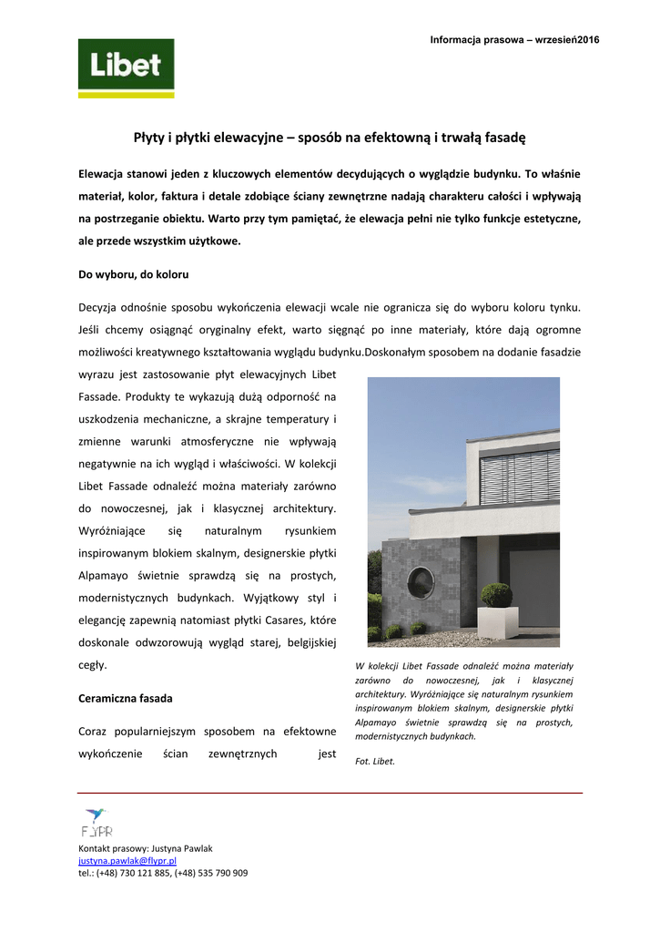 Informacja prasowa – wrzesień2016 Płyty i płytki elewacyjne – sposób na efektowną i trwałą fasadę Elewacja stanowi jeden z kluczowych elementów decydujących o wyglądzie budynku. To właśnie materiał, kolor, faktura i detale zdobiące ściany zewnętrzne nadają charakteru całości i wpływają na postrzeganie obiektu. Warto przy tym pamiętad, że elewacja pełni nie tylko funkcje estetyczne, ale przede wszystkim użytkowe. Do wyboru, do koloru Decyzja odnośnie sposobu wykooczenia elewacji wcale nie ogranicza się do wyboru koloru tynku. Jeśli chcemy osiągnąd oryginalny efekt, warto sięgnąd po inne materiały, które dają ogromne możliwości kreatywnego kształtowania wyglądu budynku.Doskonałym sposobem na dodanie fasadzie wyrazu jest zastosowanie płyt elewacyjnych Libet Fassade. Produkty te wykazują dużą odpornośd na uszkodzenia mechaniczne, a skrajne temperatury i zmienne warunki atmosferyczne nie wpływają negatywnie na ich wygląd i właściwości. W kolekcji Libet Fassade odnaleźd można materiały zarówno do nowoczesnej, jak i klasycznej architektury. Wyróżniające się naturalnym rysunkiem inspirowanym blokiem skalnym, designerskie płytki Alpamayo świetnie sprawdzą się na prostych, modernistycznych budynkach. Wyjątkowy styl i elegancję zapewnią natomiast płytki Casares, które doskonale odwzorowują wygląd starej, belgijskiej cegły. Ceramiczna fasada Coraz popularniejszym sposobem na efektowne wykooczenie ścian zewnętrznych Kontakt prasowy: Justyna Pawlak [email protected] tel.: (+48) 730 121 885, (+48) 535 790 909 jest W kolekcji Libet Fassade odnaleźd można materiały zarówno do nowoczesnej, jak i klasycznej architektury. Wyróżniające się naturalnym rysunkiem inspirowanym blokiem skalnym, designerskie płytki Alpamayo świetnie sprawdzą się na prostych, modernistycznych budynkach. Fot. Libet. Informacja prasowa – wrzesień2016 technologiatzw. elewacji wentylowanej, która skutecznie łączy niepowtarzalny wygląd z walorami praktycznymi.W zestawieniu z odpowiednimi materiałami wykooczeniowymi rozwiązanie to, wyróżniające się specjalną szczeliną wentylacyjną, umożliwiającą odpowiednią cyrkulację powietrza, wpływa pozytywnie na trwałośd ścian, chroni budynek przed przedostawaniem się wody deszczowej i lodu, zwiększa jego właściwości termoizolacyjne oraz izolację akustyczną. Aby wykorzystad w pełni zalety tej technologii, warto wybrad wysokiej jakości okładzinę. Znakomicie w tej roli sprawdzą się gresy porcelanowe Libet Ceramic. Odporne na oddziaływanie takich czynników, jak promieniowanie UV, woda, mróz, zmienne temperatury, sól, kwasy oraz inne substancje chemiczne, oferują jednocześnie szeroką paletę wzorów i kolorów. Wśród pięknych płyt z włoskiego gresu porcelanowego znaleźd można różnorodne interpretacje kamienia, drewna i betonu. Wzorem dla produktów Ardesie, Esprit, Norr, Quarziti 2.0, Stones 2.0, Tribeca oraz najnowszego Na.me były różne rodzaje skał. Z kolei Signature, Nau i Sundeck to wiarygodne odwzorowanie rysunku drewna, aMashup, Officine i Lab 21 nawiązują do wyglądu betonu. Więcej informacji na temat produktów firmy Libet znaleźd można na stronachwww.ceramic.libet.pl oraz www.libet.pl. Kontakt prasowy: Justyna Pawlak [email protected] tel.: (+48) 730 121 885, (+48) 535 790 909