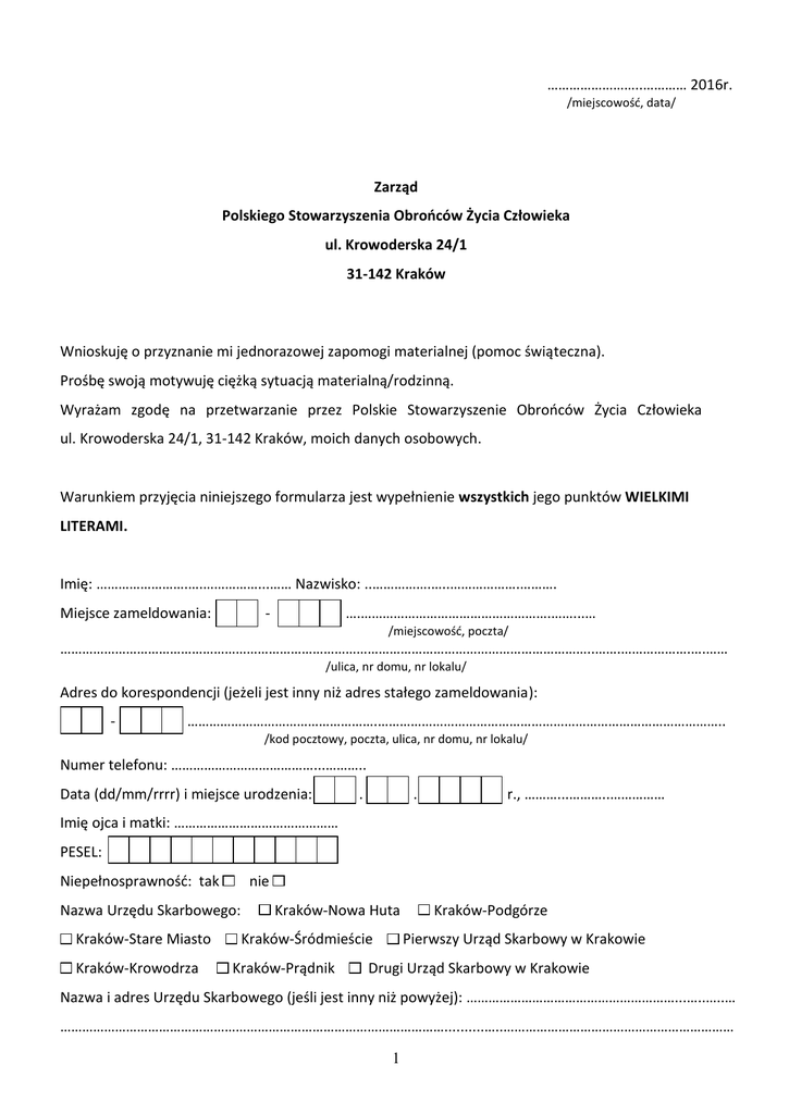 ……………………..………… 2016r. /miejscowość, data/ Zarząd Polskiego Stowarzyszenia Obrońców Życia Człowieka ul. Krowoderska 24/1 31-142 Kraków Wnioskuję o przyznanie mi jednorazowej zapomogi materialnej (pomoc świąteczna). Prośbę swoją motywuję ciężką sytuacją materialną/rodzinną. Wyrażam zgodę na przetwarzanie przez Polskie Stowarzyszenie Obrońców Życia Człowieka ul. Krowoderska 24/1, 31-142 Kraków, moich danych osobowych. Warunkiem przyjęcia niniejszego formularza jest wypełnienie wszystkich jego punktów WIELKIMI LITERAMI. Imię: …………………….….……………...…… Nazwisko: ..…………….…..……………….………. Miejsce zameldowania: - ….…………………………………………….……...… /miejscowość, poczta/ ………………………………………………………………………………………………………………………………..…….……………….….…… /ulica, nr domu, nr lokalu/ Adres do korespondencji (jeżeli jest inny niż adres stałego zameldowania): - …………………………………………….………………………………………………………………………………….. /kod pocztowy, poczta, ulica, nr domu, nr lokalu/ Numer telefonu: …………………………………...……….. Data (dd/mm/rrrr) i miejsce urodzenia: . . r., ………...………..…………… Imię ojca i matki: ……………………………………… PESEL: Niepełnosprawność: tak nie Nazwa Urzędu Skarbowego: Kraków-Stare Miasto Kraków-Krowodrza Kraków-Nowa Huta Kraków-Śródmieście Kraków-Prądnik Kraków-Podgórze Pierwszy Urząd Skarbowy w Krakowie Drugi Urząd Skarbowy w Krakowie Nazwa i adres Urzędu Skarbowego (jeśli jest inny niż powyżej): …………………………………………………...…..…..… ……………………………………………………………………………………………..........…..……………………………………………………… 1 1. W skład rodziny wchodzą (osoby ubiegającej się o pomoc, proszę nie wpisywać, jest wpisana na str. 1): Imię i nazwisko Stopień pokrewieństwa Data urodzenia Niepełno- (dzień–miesiąc–rok) sprawność 1 2 3 4 5 6 7 8 9 2. Pomoc świadczona z MOPS, Urzędu Miasta/Gminy oraz innych instytucji: Na kogo jest przyznana pomoc Zasiłek rodzinny Dodatek z tyt. samotnego wychowywania dziecka Dodatek z tyt. wychowywania dziecka w rodzinie wielodzietnej 500 + Zasiłek i świadczenia pielęgnacyjne Stypendium dla uczniów Alimenty (również z funduszu alimentacyjnego) Inne: ………………………………………. Dochód za 2015 r. (wypełnia Pracownik Stowarzyszenia na podstawie zaświadczenia z US) 2 Kwota Do wniosku dołączam (dotyczy tylko tych osób, które nie dostarczyły wcześniej poniższych dokumentów): 1) Akty urodzenia dzieci do 18 r. życia – do wglądu lub ksero. 2) Aktualne zaświadczenie o uczęszczaniu dziecka w wieku powyżej 18 lat do szkoły – I semestr (dotyczy uczniów/ studentów uczących się w trybie dziennym). 3) Aktualne orzeczenie o niepełnosprawności albo orzeczenie o umiarkowanym lub znacznym stopniu niepełnosprawności – jeżeli członek rodziny jest osobą niepełnosprawną. 4) Zaświadczenie o zarobkach za 2015 r. z Urzędu Skarbowego (wydawane bezpłatnie) wszystkich osób od 18 roku życia. W przypadku dzieci uczących się w trybie dziennym wystarczy zaświadczenie ze szkoły/ uczelni (pkt. 2). 5) Aktualne decyzje z MOPS i Urzędu Miasta dotyczące dodatku z tytułu samotnego wychowywania dziecka, alimentów z funduszu alimentacyjnego, zasiłku rodzinnego, pielęgnacyjnego itp. 6) Kopia odpisu prawomocnego wyroku sądu zasądzającego alimenty na rzecz osób w rodzinie lub kopia odpisu protokołu zawierającego treść ugody sądowej. 7) Dowód potwierdzający samotne wychowywanie dziecka (jeśli nie dostarczono decyzji z pkt. 5) tzn.: ◦ aktualne zaświadczenie o stanie cywilnym - brak aktu małżeństwa w przypadku panny lub kawalera, ◦ odpis aktu zgonu małżonka w przypadku wdowy lub wdowca, ◦ orzeczenie sądu w przypadku osoby rozwiedzionej lub pozostającej w separacji, ◦ kserokopia zupełnego aktu urodzenia dziecka – w przypadku, gdy ojciec dziecka jest nieznany, Oświadczam, że zapoznałem/-łam się z art. 272 Kodeksu Karnego i jestem świadomy/-ma odpowiedzialności karnej grożącej za: złożenie oświadczenia zawierającego nieprawdę (poświadczenie nieprawdy) oraz zatajenie prawdy. Złożenie podania i dokumentów nie gwarantuje otrzymania pomocy. Zarząd Stowarzyszenia nie upoważnia pracowników do wyjaśnień z tego tytułu. ………..……………….. /czytelny podpis/ Potwierdzam prawdziwość powyższych informacji i przychylam się do prośby p. ………………………………………………………………………………………………………... należącej/należącego do parafii …………………………………………..……………………………………………………………………………………………………………….…… …………….………………………………………….. /pieczęć i podpis Księdza Proboszcza/ Adnotacje Pracownika przyjmującego formularz: …………………………………………………………………………………… 3