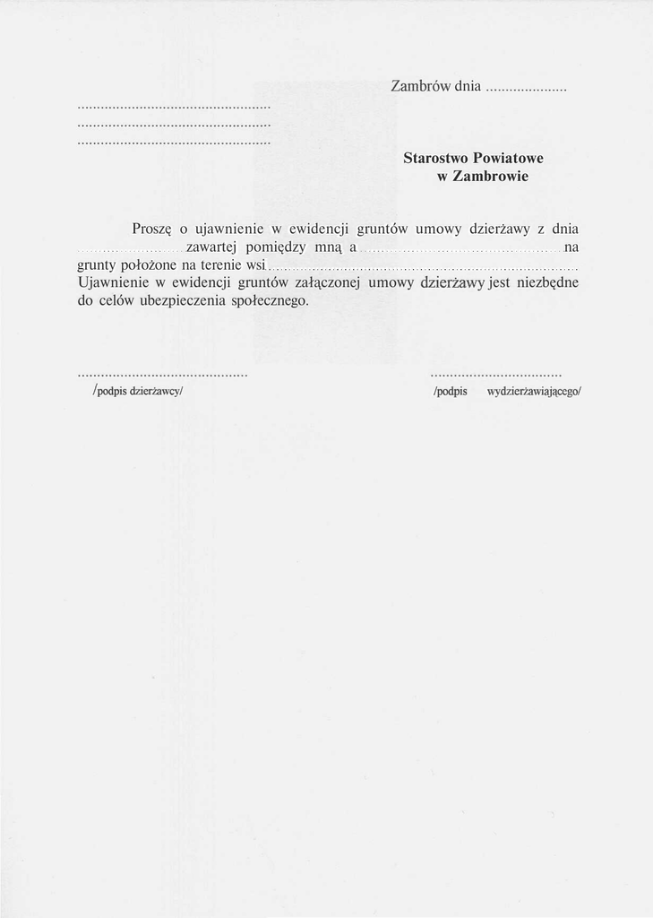 Zambrów dnia Starostwo Powiatowe w Zambrowie Proszę o ujawnienie w ewidencji gruntów umowy dzierżawy z dnia zawartej pomiędzy mną a na grunty położone na terenie wsi Ujawnienie w ewidencji gruntów załączonej umowy dzierżaw}' jest niezbędne do celów ubezpieczenia społecznego. /podpis dzierżawcy/ /podpis wydzierżawiąjącego/