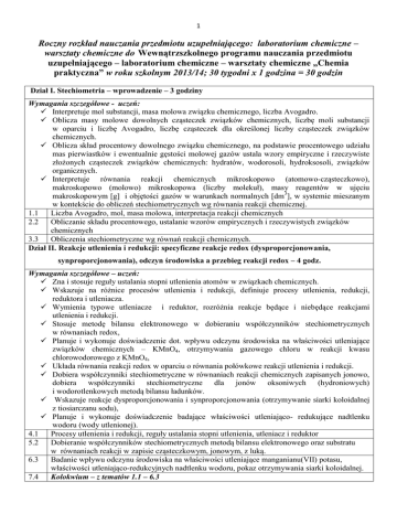 1 Roczny rozkład nauczania przedmiotu uzupełniającego: laboratorium chemiczne – warsztaty chemiczne do Wewnątrzszkolnego programu nauczania przedmiotu uzupełniającego – laboratorium chemiczne – warsztaty chemiczne „Chemia praktyczna” w roku szkolnym 2013/14; 30 tygodni x 1 godzina = 30 godzin Dział I. Stechiometria – wprowadzenie – 3 godziny Wymagania szczegółowe - uczeń: Interpretuje mol substancji, masa molowa związku chemicznego, liczba Avogadro. Oblicza masy molowe dowolnych cząsteczek związków chemicznych, liczbę moli substancji w oparciu i liczbę Avogadro, liczbę cząsteczek dla określonej liczby cząsteczek związków chemicznych. Oblicza skład procentowy dowolnego związku chemicznego, na podstawie procentowego udziału mas pierwiastków i ewentualnie gęstości molowej gazów ustala wzory empiryczne i rzeczywiste złożonych cząsteczek związków chemicznych: hydratów, wodorosoli, hydroksosoli, związków organicznych. Interpretuje równania reakcji chemicznych mikroskopowo (atomowo-cząsteczkowo), makroskopowo (molowo) mikroskopowa (liczby molekuł), masy reagentów w ujęciu makroskopowym [g] i objętości gazów w warunkach normalnych [dm3], w systemie mieszanym w kontekście do obliczeń stechiometrycznych wg równania reakcji chemicznej. 1.1 Liczba Avogadro, mol, masa molowa, interpretacja reakcji chemicznych 2.2 Obliczanie składu procentowego, ustalanie wzorów empirycznych i rzeczywistych związków chemicznych 3.3 Obliczenia stechiometryczne wg równań reakcji chemicznych. Dział II. Reakcje utlenienia i redukcji: specyficzne reakcje redox (dysproporcjonowania, synproporcjonowania), odczyn środowiska a przebieg reakcji redox – 4 godz. Wymagania szczegółowe – uczeń: Zna i stosuje reguły ustalania stopni utlenienia atomów w związkach chemicznych. Wskazuje na różnice procesów utlenienia i redukcji, definiuje procesy utlenienia, redukcji, reduktora i utleniacza. Wymienia typowe utleniacze i reduktor, rozróżnia reakcje będące i niebędące reakcjami utlenienia i redukcji. Stosuje metodę bilansu elektronowego w dobieraniu współczynników stechiometrycznych w równaniach redox, Planuje i wykonuje doświadczenie dot. wpływu odczynu środowiska na właściwości utleniające związków chemicznych – KMnO4, otrzymywania gazowego chloru w reakcji kwasu chlorowodorowego z KMnO4, Układa równania reakcji redox w oparciu o równania połówkowe reakcji utlenienia i redukcji. Dobiera współczynniki stechiometryczne w równaniach reakcji chemicznych zapisanych jonowo, dobiera współczynniki stechiometryczne dla jonów oksoniwych (hydroniowych) i wodorotlenkowych metodą bilansu ładunków. Wskazuje reakcje dysproporcjonowania i synproporcjonowania (otrzymywanie siarki koloidalnej z tiosiarczanu sodu), Planuje i wykonuje doświadczenie badające właściwości utleniająco- redukujące nadtlenku wodoru (wody utlenionej). 4.1 Procesy utlenienia i redukcji, reguły ustalania stopni utlenienia, utleniacz i reduktor 5.2 Dobieranie współczynników stechiometrycznych metodą bilansu elektronowego oraz substratu w równaniach reakcji w zapisie cząsteczkowym, jonowym, z luką. 6.3 Badanie wpływu odczynu środowiska na właściwości utleniające manganianu(VII) potasu, właściwości utleniająco-redukcyjnych nadtlenku wodoru, pokaz otrzymywania siarki koloidalnej. 7.4 Kolokwium – z tematów 1.1 – 6.3 2 Dział III. Elektrochemia: ogniwa galwaniczne, elektroliza, korozja elektrochemiczna metali – 6 godzin Wymagania szczegółowe – uczeń: Definiuje pojęcia: ogniwo, półogniwo, elektroda. Wyjaśnia budowę ogniwa Daniela, Volty, akumulatora ołowiowego. Zapisze reakcje połówkowe zachodzące na elektrodach. Wskaże kierunek przepływ jonów w ogniwie Daniela, Zapisuje schematy półogniw i ogniw zgodnie z konwencją Sztokholmską, W oparciu o potencjały standardowe półogniw oblicza siłę elektromotoryczną (SEM) ogniwa. Planuje i konstruuje ogniowo Daniela i Wolty. Stosuje wzór Nersta i oblicza SEM ogniwa zbudowanego i ogniw stężeniowych. Wyjaśni budowę elektrolizera, zapisze równania elektrodowe w procesie elektrolizy: wody, kwasu tlenowego, kwasu beztlenowego, stopionych tlenków, wodorotlenków i soli kwasów beztlenowych, wodnych roztworów soli metali o potencjale wyższym i niższym od potencjału glinu. Planuje i wykonuje elektrolizę wody, kwasu chlorowodorowego, elektrolizę wodnego roztworu CusSO4 z użyciem elektrod miedzianych. Obliczy masę/objętość wydzielonych produktów na elektrodach w trakcie elektrolizy Wyjaśni przebieg procesów elektrodowych w trakcie elektrolizy wodnych roztworów soli kwasów karboksylowych (reakcje Kolbego). Zbada wpływ odczynu środowiska na szybkość korozji elektrochemicznej wyrobów stalowych, określi wpływ innych metali na proces korozji elektrochemicznej. 8.1 Budowa ogniwa galwanicznego Daniela, ogniowo Volty, akumulator ołowiowy, potencjały standardowe półogniw 9.2 Zapisywanie schematów ogniw i obliczanie SEM 10.3 Ćwiczenie – budowa ogniwa Daniela i Volty 11.4 Procesy elektrodowe w procesach elektrolizy – obliczanie masy/objętości produktów elektrolizy 12.5 Ćwiczenie – elektroliza wodnego roztworu HCl i wody, reakcje Kolbego 13.6 Kolokwium z tematów 8.1 – 12.5 Dział IV. Reakcje w roztworach – miareczkowanie, iloczyn rozpuszczalności substancji trudno rozpuszczalnych – 5 godzin Wymagania szczegółowe – uczeń: Dokona przeliczeń roztworów molowych i procentowych. Sporządzi roztwory mianowane molowe/procentowe o określonym stężeniu zasady, kwasu lub soli. Dokona przeliczeń w celu rozcieńczenia lub zatężenia roztworu. Dokona miareczkowania roztworu o nieznanym stężeniu roztworem mianowanym i określi stężenie roztworu miareczkowanego. Dobierze odczynniki i przeprowadzi doświadczenie strącenia określonego związku chemicznego (wodorotlenku, soli) Zapisze wzór na Kso dla wskazanego związku chemicznego, w oparciu o 