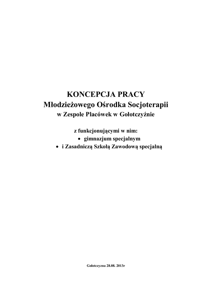 KONCEPCJA PRACY Młodzieżowego Ośrodka Socjoterapii w Zespole Placówek w Gołotczyźnie z funkcjonującymi w nim: gimnazjum specjalnym i Zasadniczą Szkołą Zawodową specjalną Gołotczyzna 28.08. 2013r I. STATUS PRAWNY Młodzieżowy Ośrodek Socjoterapii w Zespole Placówek w Gołotczyźnie działa na podstawie: o Aktu założycielskiego Młodzieżowego Ośrodka Socjoterapii w Gołotczyźnie (Uchwała nr 6/09 Sejmiku Województwa Mazowieckiego z dnia 9 lutego 2009r. Zał. nr 3); o na podstawie Uchwały nr 111/10 Sejmiku Województwa Mazowieckiego z dnia 5 lipca 2010r w sprawie utworzenia Gimnazjum specjalnego w Młodzieżowym Ośrodku Socjoterapii w Gołotczyźnie; o na podstawie Uchwały nr 111/13 Sejmiku Województwa Mazowieckiego z dnia 20 maja 2013r w sprawie utworzenia Zasadniczej Szkoły Zawodowej specjalnej w Młodzieżowym Ośrodku Socjoterapii w Gołotczyźnie wraz z załącznikami i aktem założycielskim ZSZ specjalnej; o Ustawy z dnia 7 września 1991 r. o systemie oświaty (Dz.U. z 2004 r. Nr 256, poz. 2572 z późn. zm.); o Ustawy z dnia 26 października 1982r o postępowaniu w sprawach nieletnich ( Dz. U. z 2010 r. Nr 33, poz. 178, z póżn. zm.); o Ustawy z dnia 9 czerwca 2011r o wspieraniu rodziny i systemie pieczy zastępczej (Dz. U. Nr 149, poz. 887); o Rozporządzenia Ministra Edukacji Narodowej z dnia 12 maja 2011r. w sprawie rodzajów i szczegółowych zasad działania placówek publicznych, warunków pobytu dzieci i młodzieży w tych placówkach oraz wysokości i zasad odpłatności wnoszonej przez rodziców za pobyt dzieci w tych placówkach (Dz. U. Nr 109, poz. 631); o Rozporządzenia Ministra Edukacji Narodowej i Sportu z dnia 7 marca 2005 r. w sprawie ramowych statutów placówek publicznych (Dz. U. Nr 52, poz. 466) o Rozporządzenia Ministra Edukacji Narodowej i Sportu z dnia 21 maja 2001 r. w sprawie ramowych statutów publicznego przedszkola oraz publicznych szkół (Dz. U. Nr 61, poz. 624, z późn. zm); o Rozporządzenia Ministra Edukacji Narodowej i Sportu z dnia 17 listopada 2010r. w sprawie warunków organizowania kształcenia, wychowania i opieki dla dzieci i młodzieży niepełnosprawnych oraz niedostosowanych społecznie w specjalnych przedszkolach, szkołach i oddziałach oraz w ośrodkach ( Dz. U. Nr 228, poz. 1489, z późn zm.) o Rozporządzenia Ministra Edukacji Narodowej i Sportu z dnia 26 lipca 2004 w sprawie szczegółowych zasad kierowania, przyjmowania, przenoszenia, zwalniania i pobytu nieletnich w młodzieżowym ośrodku wychowawczym oraz młodzieżowym ośrodku socjoterapii ( Dz. U. Nr 178, poz.1833, z późn. zm. ) o Rozporządzenia Ministra Edukacji Narodowej i Sportu z dnia 19 lutego 2002r. w sprawie sposobu prowadzenia przez publiczne przedszkola, szkoły i placówki dokumentacji przebiegu nauczania, działalności wychowawczej i opiekuńczej oraz rodzajów tej dokumentacji (Dz. U. Nr 23, poz. 225, z późn. zm.); o Rozporządzenia Ministra Edukacji Narodowej z dnia 30 kwietnia 2013r.r. w sprawie zasad udzielania i organizacji pomocy psychologiczno-pedagogicznej w publicznych przedszkolach, szkołach i placówkach (Dz. U. z dnia 13 maja 2013r, poz. 532); 2 Organem prowadzącym Zespół Placówek w Gołotczyźnie jest Samorząd Województwa Mazowieckiego, nadzór pedagogiczny sprawuje Mazowiecki Kurator Oświaty. Młodzieżowy Ośrodek Socjoterapii działa w strukturach Zespołu Placówek w Gołotczyźnie od dnia 1.09.2009r , a funkcjonują w nim: - gimnazjum specjalne; - Zasadnicza Szkoła Zawodowa specjalna, kształcąca w zawodzie – kucharz (powołana od dnia 1.09.2013r.). Koncepcja pracy Młodzieżowego Ośrodka Socjoterapii jest ogólnym planem działania Ośrodka określa kierunki pracy i rozwoju, wizję oraz powiązane z nimi podstawowe cele i zadania, stawiane do realizacji, funkcjonującym w nim gimnazjum i zasadniczej szkole zawodowej. Organizuje przyszłość placówki i pełni rolę drogowskazu, wytyczającego wszystkim członkom społeczności szkolnej ten sam kierunek działania. Koncepcja pracy Młodzieżowego Ośrodka Socjoterapii ujęta jest w sposób szczegółowy w następujących aktach prawnych i dokumentach szkolnych: Statut Zespołu Placówek; Statut Młodzieżowego Ośrodka Socjoterapii; Wieloletni Plan Rozwoju Zespołu Placówek na lata szkolne 2010-2014; Program Wychowawczy Młodzieżowego Ośrodka Socjoterapii; Program Profilaktyki dla Uczniów/Wychowanków Młodzieżowego Ośrodka Socjoterapii; Regulamin Młodzieżowego Ośrodka Socjoterapii; Arkusz organizacji Młodzieżowego Ośrodka Socjoterapii; Plan Pracy i kalendarz Młodzieżowego Ośrodka Socjoterapii na dany rok szkolny; Plan doskonalenia zawodowego w Młodzieżowym Ośrodku Socjoterapii (na dany rok szkolny); Plan nadzoru pedagogicznego Młodzieżowego Ośrodka Socjoterapii; innych, przyjętych do realizacji. II. KOMPETENCJE Organami Młodzieżowego Ośrodka Socjoterapii są: o dyrektor Młodzieżowego Ośrodka Socjoterapii, który jest jednocześnie dyrektorem Zespołu Placówek, i przewodniczącym rady pedagogicznej Młodzieżowego Ośrodka Socjoterapii; o Rada pedagogiczna Młodzieżowego Ośrodka Socjoterapii; o Samorząd Wychowanków Młodzieżowego Ośrodka Socjoterapii; Organizacja pracy dla Młodzieżowego Ośrodka Socjoterapii uwzględnia działanie: o klasowych zespołów nauczycielskich; o Zespołów ds. organizacji i udzielania pomocy psychologiczno-pedagogicznej; 3 nauczycielskich zespołów zadaniowych, stałych i powoływanych według bieżących potrzeb; o zespołu wychowawców; o psychologa; o pedagoga; o bibliotekarza; o pielęgniarki; o sekretariatu placówki; Zadania organów Młodzieżowego Ośrodka Socjoterapii określa Statut. Rada pedagogiczna Młodzieżowego Ośrodka Socjoterapii, Samorząd Wychowanków i pozostałe podmioty biorące udział w organizacji pracy ośrodka, uchwalają w razie potrzeby regulaminy swojej działalności, które nie mogą być sprzeczne z przepisami prawa oświatowego i statutem placówk