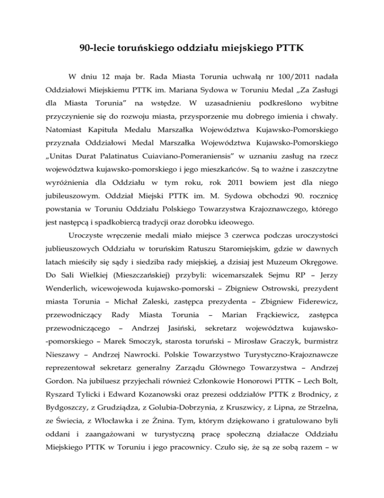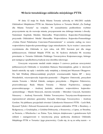 90-lecie toruńskiego oddziału miejskiego PTTK W dniu 12 maja br. Rada Miasta Torunia uchwałą nr 100/2011 nadała Oddziałowi Miejskiemu PTTK im. Mariana Sydowa w Toruniu Medal „Za Zasługi dla Miasta Torunia” na wstędze. W uzasadnieniu podkreślono wybitne przyczynienie się do rozwoju miasta, przysporzenie mu dobrego imienia i chwały. Natomiast Kapituła Medalu Marszałka Województwa Kujawsko-Pomorskiego przyznała Oddziałowi Medal Marszałka Województwa Kujawsko-Pomorskiego „Unitas Durat Palatinatus Cuiaviano-Pomeraniensis” w uznaniu zasług na rzecz województwa kujawsko-pomorskiego i jego mieszkańców. Są to ważne i zaszczytne wyróżnienia dla Oddziału w tym roku, rok 2011 bowiem jest dla niego jubileuszowym. Oddział Miejski PTTK im. M. Sydowa obchodzi 90. rocznicę powstania w Toruniu Oddziału Polskiego Towarzystwa Krajoznawczego, którego jest następcą i spadkobiercą tradycji oraz dorobku ideowego. Uroczyste wręczenie medali miało miejsce 3 czerwca podczas uroczystości jublieuszowych Oddziału w toruńskim Ratuszu Staromiejskim, gdzie w dawnych latach mieściły się sądy i siedziba rady miejskiej, a dzisiaj jest Muzeum Okręgowe. Do Sali Wielkiej (Mieszczańskiej) przybyli: wicemarszałek Sejmu RP – Jerzy Wenderlich, wicewojewoda kujawsko-pomorski – Zbigniew Ostrowski, prezydent miasta Torunia – Michał Zaleski, zastępca prezydenta – Zbigniew Fiderewicz, przewodniczący przewodniczącego Rady – Miasta Andrzej Torunia Jasiński, – Marian sekretarz Frąckiewicz, województwa zastępca kujawsko- -pomorskiego – Marek Smoczyk, starosta toruński – Mirosław Graczyk, burmistrz Nieszawy – Andrzej Nawrocki. Polskie Towarzystwo Turystyczno-Krajoznawcze reprezentował sekretarz generalny Zarządu Głównego Towarzystwa – Andrzej Gordon. Na jubiluesz przyjechali również Członkowie Honorowi PTTK – Lech Bolt, Ryszard Tylicki i Edward Kozanowski oraz prezesi oddziałów PTTK z Brodnicy, z Bydgoszczy, z Grudziądza, z Golubia-Dobrzynia, z Kruszwicy, z Lipna, ze Strzelna, ze Świecia, z Włocławka i ze Żnina. Tym, którym dziękowano i gratulowano byli oddani i zaangażowani w turystyczną pracę społeczną działacze Oddziału Miejskiego PTTK w Toruniu i jego pracownicy. Czuło się, że są ze sobą razem – w działalności oraz na turystycznych i życiowych ścieżkach. Zauważalna była łącząca ich serdeczna więź. Uroczystość prowadził wieloletni prezes Zarządu Oddziału Miejskiego PTTK im. Mariana Sydowa w Toruniu Henryk Miłoszewski, któremu prezydent Torunia wręczył Medal Honorowy „Thorunium” za zasługi dla miasta, a Medal Marszałka Województwa Kujawsko-Pomorskiego „Unitas Durat Palatinatus Cuiaviano-Pomeraniensis” – za wybitną działalność na rzecz województwa kujawsko-pomorskiego i jego mieszkańców – przewodniczący Kapituły Medalu Marszałka Województwa Kujawsko-Pomorskiego. Za wspaniałą pracę, pełną zaangażowania i pasji, zwłaszcza na rzecz dzieci i młodzieży, za zachęcanie do poznawania Torunia, ziemi toruńskiej i Polski zasłużeni członkowie Oddziału otrzymali odznaczenia państwowe, resortowe i organizacyjne – Złoty Krzyż Zasługi i Srebrny Krzyż Zasługi, Odznakę Honorową „Za zasługi dla turystyki”, Medal Komisji Edukacji Narodowej oraz Złotą Honorową Odznakę PTTK. Były też listy gratulacyjne oraz wyróżnienia przyznane przez Zarząd Główny PTTK, wicemarszałka Sejmu RP, marszałka województwa kujawsko-pomorskiego, prezydenta miasta Torunia oraz starostę toruńskiego. Gościom zaś wręczono specjalnie na tę okazję zaprojektowany przez Józefa Kołcza Medal 90-lecia Oddziału Miejskiego PTTK z popiersiem wybitnego toruńskiego działacza społecznego i krajoznawcy Polskiego Towarzystwa Krajoznawczego w dwudziestoleciu międzywojennym Franciszka Rękosiewicza (1885-1970), pamiątkowe statuetki i monografię historyczną autorstwa Henryka Miłoszewskiego zatytułowaną „Oddział Miejski Polskiego Towarzystwa Turystyczno-Krajoznawczego imienia Mariana Sydowa w Toruniu. Historia działalności w latach 1921–2010”. Piękna w swej prostocie Sala Wielka Ratusza Staromiejskiego nadała powagi i dostojności uroczystości, a przy tym była ciepła i serdeczna atmosfera. Wyrazy uznania dla wyróżnionych i odznaczonych oraz wszystkich z Oddziału Miejskiego PTTK w Toruniu za wspaniałą pracę na rzecz rozwoju turystyki, oświaty i wychowania, dla miasta i kraju w Polskim Towarzystwie Turystyczno-Krajoznawczym składa redakcja „Gościńca PTTK”. Życzymy dobrej energii do pracy oraz nowych wspaniałych inspiracji do działania, wędrowania i przeżywania, odkrywania wielu radości na życiowych i turystycznych szlakach. Elżbieta Matusiak-Gordon