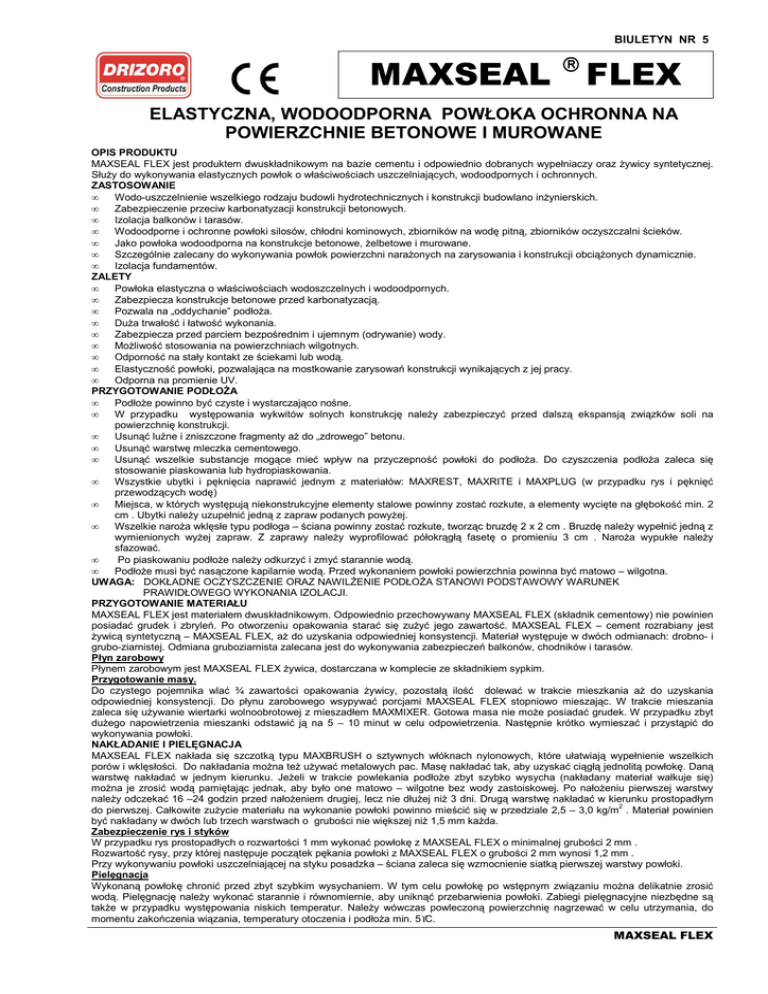 BIULETYN NR 5 MAXSEAL FLEX ELASTYCZNA, WODOODPORNA POWŁOKA OCHRONNA NA POWIERZCHNIE BETONOWE I MUROWANE OPIS PRODUKTU MAXSEAL FLEX jest produktem dwuskładnikowym na bazie cementu i odpowiednio dobranych wypełniaczy oraz Ŝywicy syntetycznej. SłuŜy do wykonywania elastycznych powłok o właściwościach uszczelniających, wodoodpornych i ochronnych. ZASTOSOWANIE • Wodo-uszczelnienie wszelkiego rodzaju budowli hydrotechnicznych i konstrukcji budowlano inŜynierskich. • Zabezpieczenie przeciw karbonatyzacji konstrukcji betonowych. • Izolacja balkonów i tarasów. • Wodoodporne i ochronne powłoki silosów, chłodni kominowych, zbiorników na wodę pitną, zbiorników oczyszczalni ścieków. • Jako powłoka wodoodporna na konstrukcje betonowe, Ŝelbetowe i murowane. • Szczególnie zalecany do wykonywania powłok powierzchni naraŜonych na zarysowania i konstrukcji obciąŜonych dynamicznie. • Izolacja fundamentów. ZALETY • Powłoka elastyczna o właściwościach wodoszczelnych i wodoodpornych. • Zabezpiecza konstrukcje betonowe przed karbonatyzacją. • Pozwala na „oddychanie” podłoŜa. • DuŜa trwałość i łatwość wykonania. • Zabezpiecza przed parciem bezpośrednim i ujemnym (odrywanie) wody. • MoŜliwość stosowania na powierzchniach wilgotnych. • Odporność na stały kontakt ze ściekami lub wodą. • Elastyczność powłoki, pozwalająca na mostkowanie zarysowań konstrukcji wynikających z jej pracy. • Odporna na promienie UV. PRZYGOTOWANIE PODŁOśA • PodłoŜe powinno być czyste i wystarczająco nośne. • W przypadku występowania wykwitów solnych konstrukcję naleŜy zabezpieczyć przed dalszą ekspansją związków soli na powierzchnię konstrukcji. • Usunąć luźne i zniszczone fragmenty aŜ do „zdrowego” betonu. • Usunąć warstwę mleczka cementowego. • Usunąć wszelkie substancje mogące mieć wpływ na przyczepność powłoki do podłoŜa. Do czyszczenia podłoŜa zaleca się stosowanie piaskowania lub hydropiaskowania. • Wszystkie ubytki i pęknięcia naprawić jednym z materiałów: MAXREST, MAXRITE i MAXPLUG (w przypadku rys i pęknięć przewodzących wodę) • Miejsca, w których występują niekonstrukcyjne elementy stalowe powinny zostać rozkute, a elementy wycięte na głębokość min. 2 cm . Ubytki naleŜy uzupełnić jedną z zapraw podanych powyŜej. • Wszelkie naroŜa wklęsłe typu podłoga – ściana powinny zostać rozkute, tworząc bruzdę 2 x 2 cm . Bruzdę naleŜy wypełnić jedną z wymienionych wyŜej zapraw. Z zaprawy naleŜy wyprofilować półokrągłą fasetę o promieniu 3 cm . NaroŜa wypukłe naleŜy sfazować. • Po piaskowaniu podłoŜe naleŜy odkurzyć i zmyć starannie wodą. • PodłoŜe musi być nasączone kapilarnie wodą. Przed wykonaniem powłoki powierzchnia powinna być matowo – wilgotna. UWAGA: DOKŁADNE OCZYSZCZENIE ORAZ NAWILśENIE PODŁOśA STANOWI PODSTAWOWY WARUNEK PRAWIDŁOWEGO WYKONANIA IZOLACJI. PRZYGOTOWANIE MATERIAŁU MAXSEAL FLEX jest materiałem dwuskładnikowym. Odpowiednio przechowywany MAXSEAL FLEX (składnik cementowy) nie powinien posiadać grudek i zbryleń. Po otworzeniu opakowania starać się zuŜyć jego zawartość. MAXSEAL FLEX – cement rozrabiany jest Ŝywicą syntetyczną – MAXSEAL FLEX, aŜ do uzyskania odpowiedniej konsystencji. Materiał występuje w dwóch odmianach: drobno- i grubo-ziarnistej. Odmiana gruboziarnista zalecana jest do wykonywania zabezpieczeń balkonów, chodników i tarasów. Płyn zarobowy Płynem zarobowym jest MAXSEAL FLEX Ŝywica, dostarczana w komplecie ze składnikiem sypkim. Przygotowanie masy. Do czystego pojemnika wlać ¾ zawartości opakowania Ŝywicy, pozostałą ilość dolewać w trakcie mieszkania aŜ do uzyskania odpowiedniej konsystencji. Do płynu zarobowego wsypywać porcjami MAXSEAL FLEX stopniowo mieszając. W trakcie mieszania zaleca się uŜywanie wiertarki wolnoobrotowej z mieszadłem MAXMIXER. Gotowa masa nie moŜe posiadać grudek. W przypadku zbyt duŜego napowietrzenia mieszanki odstawić ją na 5 – 10 minut w celu odpowietrzenia. Następnie krótko wymieszać i przystąpić do wykonywania powłoki. NAKŁADANIE I PIELĘGNACJA MAXSEAL FLEX nakłada się szczotką typu MAXBRUSH o sztywnych włóknach nylonowych, które ułatwiają wypełnienie wszelkich porów i wklęsłości. Do nakładania moŜna teŜ uŜywać metalowych pac. Masę nakładać tak, aby uzyskać ciągłą jednolitą powłokę. Daną warstwę nakładać w jednym kierunku. JeŜeli w trakcie powlekania podłoŜe zbyt szybko wysycha (nakładany materiał wałkuje się) moŜna je zrosić wodą pamiętając jednak, aby było one matowo – wilgotne bez wody zastoiskowej. Po nałoŜeniu pierwszej warstwy naleŜy odczekać 16 –24 godzin przed nałoŜeniem drugiej, lecz nie dłuŜej niŜ 3 dni. Drugą warstwę nakładać w kierunku prostopadłym do pierwszej. Całkowite zuŜycie materiału na wykonanie powłoki powinno mieścić się w przedziale 2,5 – 3,0 kg/m2 . Materiał powinien być nakładany w dwóch lub trzech warstwach o grubości nie większej niŜ 1,5 mm kaŜda. Zabezpieczenie rys i styków W przypadku rys prostopadłych o rozwartości 1 mm wykonać powłokę z MAXSEAL FLEX o minimalnej grubości 2 mm . Rozwartość rysy, przy której następuje początek pękania powłoki z MAXSEAL FLEX o grubości 2 mm wynosi 1,2 mm . Przy wykonywaniu powłoki uszczelniającej na styku posadzka – ściana zaleca się wzmocnienie siatką pierwszej warstwy powłoki. Pielęgnacja Wykonaną powłokę chronić przed zbyt szybkim wysychaniem. W tym celu powłokę po wstępnym związaniu moŜna delikatnie zrosić wodą. Pielęgnację naleŜy wykonać starannie i równomiernie, aby uniknąć przebarwienia powłoki. Zabiegi pielęgnacyjne niezbędne są takŜe w przypadku występowania niskich temperatur. NaleŜy wówczas powleczoną powierzchnię nagrzewać w celu utrzymania, do momentu zakończenia wiązania, temperatury otoczenia 