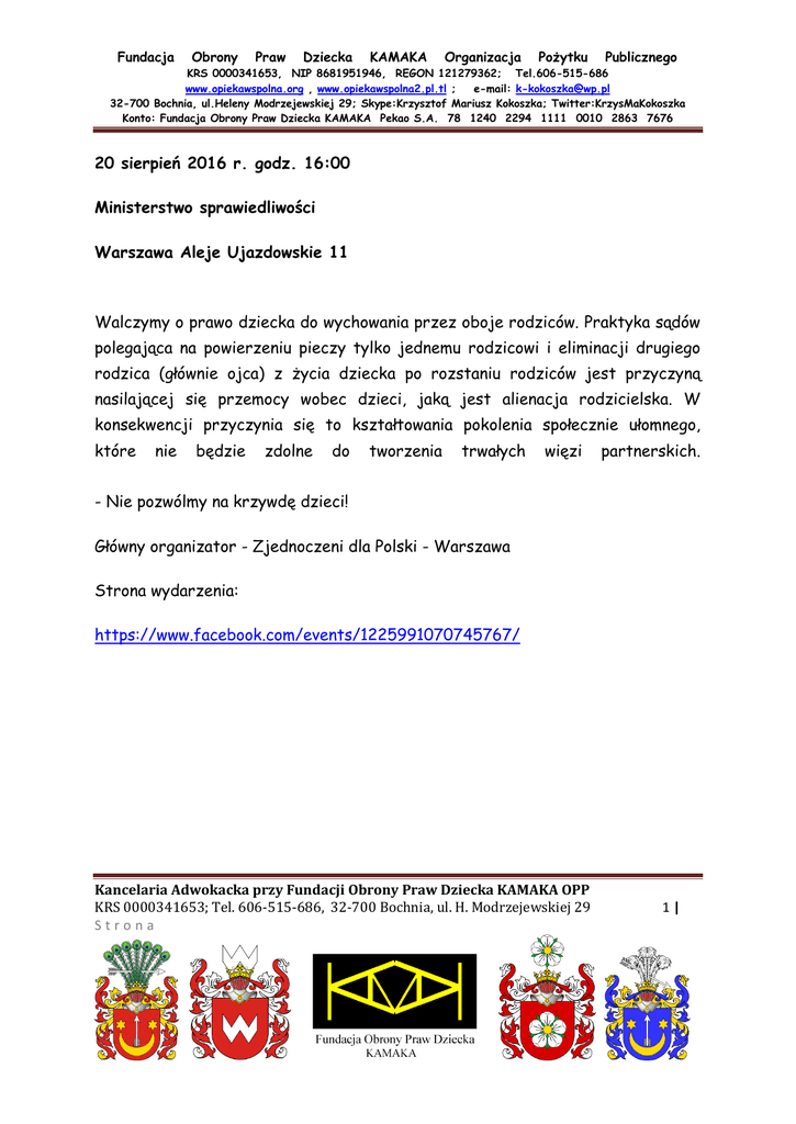 Fundacja Obrony Praw Dziecka KAMAKA Organizacja Pożytku Publicznego KRS 0000341653, NIP 8681951946, REGON 121279362; Tel.606-515-686 www.opiekawspolna.org , www.opiekawspolna2.pl.tl ; e-mail: [email protected] 32-700 Bochnia, ul.Heleny Modrzejewskiej 29; Skype:Krzysztof Mariusz Kokoszka; Twitter:KrzysMaKokoszka Konto: Fundacja Obrony Praw Dziecka KAMAKA Pekao S.A. 78 1240 2294 1111 0010 2863 7676 20 sierpień 2016 r. godz. 16:00 Ministerstwo sprawiedliwości Warszawa Aleje Ujazdowskie 11 Walczymy o prawo dziecka do wychowania przez oboje rodziców. Praktyka sądów polegająca na powierzeniu pieczy tylko jednemu rodzicowi i eliminacji drugiego rodzica (głównie ojca) z życia dziecka po rozstaniu rodziców jest przyczyną nasilającej się przemocy wobec dzieci, jaką jest alienacja rodzicielska. W konsekwencji przyczynia się to kształtowania pokolenia społecznie ułomnego, które nie będzie zdolne do tworzenia trwałych więzi partnerskich. - Nie pozwólmy na krzywdę dzieci! Główny organizator - Zjednoczeni dla Polski - Warszawa Strona wydarzenia: https://www.facebook.com/events/1225991070745767/ Kancelaria Adwokacka przy Fundacji Obrony Praw Dziecka KAMAKA OPP KRS 0000341653; Tel. 606-515-686, 32-700 Bochnia, ul. H. Modrzejewskiej 29 Strona 1| Fundacja Obrony Praw Dziecka KAMAKA Organizacja Pożytku Publicznego KRS 0000341653, NIP 8681951946, REGON 121279362; Tel.606-515-686 www.opiekawspolna.org , www.opiekawspolna2.pl.tl ; e-mail: [email protected] 32-700 Bochnia, ul.Heleny Modrzejewskiej 29; Skype:Krzysztof Mariusz Kokoszka; Twitter:KrzysMaKokoszka Konto: Fundacja Obrony Praw Dziecka KAMAKA Pekao S.A. 78 1240 2294 1111 0010 2863 7676 Fundacja Obrony Praw Dziecka KAMAKA Organizacja Pożytku Publicznego KRS 0000341653, NIP 8681951946, REGON 121279362 Tel. 606-515-686 www.opiekawspolna.org, www.opiekawspolna2.pl.tl Siedziba: 32-700 Bochnia, ul. H. Modrzejewskiej 29 Oddziały krajowe, między innymi, w: Suchej Beskidzkiej, Krakowie, Wrocławiu, Trzebnicy, Bydgoszczy, Toruniu, Zielonej Górze, Kancelaria Adwokacka przy Fundacji Obrony Praw Dziecka KAMAKA OPP KRS 0000341653; Tel. 606-515-686, 32-700 Bochnia, ul. H. Modrzejewskiej 29 Strona 2| Fundacja Obrony Praw Dziecka KAMAKA Organizacja Pożytku Publicznego KRS 0000341653, NIP 8681951946, REGON 121279362; Tel.606-515-686 www.opiekawspolna.org , www.opiekawspolna2.pl.tl ; e-mail: [email protected] 32-700 Bochnia, ul.Heleny Modrzejewskiej 29; Skype:Krzysztof Mariusz Kokoszka; Twitter:KrzysMaKokoszka Konto: Fundacja Obrony Praw Dziecka KAMAKA Pekao S.A. 78 1240 2294 1111 0010 2863 7676 Gorzowie Wielkopolskim, Opolu, Białymstoku, Katowicach, Kielcach, Krośnie, Olsztynie, Poznaniu, Częstochowie, Żywcu. Oddziały zagraniczne: Los Angeles - Silicon Valley (USA), Londyn, Lancaster (Wielka Brytania), Wenecja, Punta Sabioni, Trepporti (Włochy), Agadir (Maroko) Przy Fundacji OPD KAMAKA OPP działają: 1. Centrum Mediacji i Negocjacji Sądowych; 2. Opiniodawczy Zespół Specjalistów Sądowych, wydający opinie dla sądów, zgodnie z koncepcją równości, niedyskryminacji, opieki wspólnej i dobra dziecka - opinie oparte na wynikach badań naukowych, między innymi, Uniwersytetu Jagiellońskiego w Krakowie i zgodne z dwudziestoletnim doświadczeniem biegłych Fundacji Obrony Praw Dziecka w przeciwdziałaniu alienacji rodzicielskiej. Jest to JEDYNY w skali nie tylko ogólnopolskiej, ale również europejskiej, instytut naukowy dysponujący garniturem AUTORSKICH testów i innych narzędzi diagnozujących zjawisko alienacji rodzicielskiej, jego natężenie oraz intensywność. A także powiązane ze zjawiskiem alienacji rodzicielskiej elementy, tj. ZDA, ZA”M”, ZAT, PAS, ZAB, ZAD, ZAC, SStr, DPU i inne. 3. Kancelarie adwokackie. Z Fundacją OPD KAMAKA OPP współpracuje kilkuset adwokatów i aplikantów adwokackich w całej Polsce. 4. Kancelarie radców prawnych. Z Fundacją OPD KAMAKA OPP współpracuje, w całej Polsce, kilkuset radców prawnych i ich aplikantów. 5. Kancelarie mediatorów sądowych zrzeszonych Sądowych przy Fundacji OPD KAMAKA OPP. w Centrum Mediacji i Negocjacji 6. Telefon Zaufania dla Ofiar Przemocy na tle alienacji rodzicielskiej (dla dzieci i dorosłych) 606-515-686, którego personel specjalizuje się w przeciwdziałaniu alienacji i przemocy rodzicielskiej, ale podejmuje się też rozwiązywania innych problemów, zgłaszanych przez osoby dzwoniące, w ich aspektach prawnych, psychologicznych i socjalnych. - Całodobowy. Jeśli jest, z jakiś ważnych powodów wyłączony, prosimy zadzwonić po pewnym czasie. 7. Teatr KAMAKA, który rozpowszechnia w społeczeństwie wiedzę na temat patologii ZjAR poprzez siłę artystycznego przekazu. Obecnie, w Łodzi, przygotowujemy spektakl, z którym chcemy objechać całą Polskę i Europę, opisany w obszernym artykule, w Kancelaria Adwokacka przy Fundacji Obrony Praw Dziecka KAMAKA OPP KRS 0000341653; Tel. 606-515-686, 32-700 Bochnia, ul. H. Modrzejewskiej 29 Strona 3| Fundacja Obrony Praw Dziecka KAMAKA Organizacja Pożytku Publicznego KRS 0000341653, NIP 8681951946, REGON 121279362; Tel.606-515-686 www.opiekawspolna.org , www.opiekawspolna2.pl.tl ; e-mail: [email protected] 32-700 Bochnia, ul.Heleny Modrzejewskiej 29; Skype:Krzysztof Mariusz Kokoszka; Twitter:KrzysMaKokoszka Konto: Fundacja Obrony Praw Dziecka KAMAKA Pekao S.A. 78 1240 2294 1111 0010 2863 7676 tygodniu „Fakty i Mity”, w numerze z 20 września 2012 r., o destrukcyjnym wpływie bycia alienowanym w dzieciństwie na życie dorosłe. Aktorka występująca w tym przedstawieniu występuje jednocześnie w trzech rolach: „matki” alienującej, sędzi „rodzinnej” i „Matki” Boskiej, zupełnie nie dostrzegając, jak bardzo uszkadza psychicznie swoje dziecko, które alienuje od ojca, drugiej babci, drugiego dziadka itd. Cały czas będąc przekonaną, że działa dla „dobra dziecka” w rozumieniu polskiego Kodeksu Rodzinnego i Opiekuńczego. „Polskiego”, bo kodeksy rodzinne państw bardzi