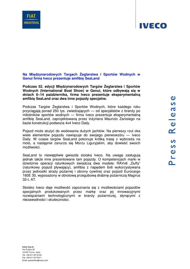 Na Międzynarodowych Targach Żeglarstwa i Sportów Wodnych w Genui firma Iveco prezentuje amfibię SeaLand Podczas 52. edycji Międzynarodowych Targów Żeglarstwa i Sportów Wodnych (International Boat Show) w Genui, które odbywają się w dniach 6–14 października, firma Iveco prezentuje eksperymentalną amfibię SeaLand oraz dwa inne pojazdy specjalne. Podczas Targów Żeglarstwa i Sportów Wodnych, które każdego roku przyciągają ponad 250 tys. zwiedzających — od specjalistów z branży po miłośników sportów wodnych — firma Iveco prezentuje eksperymentalną amfibię SeaLand, zaprojektowaną przez inżyniera Maurizio Zanisiego na bazie konstrukcji podwozia 4x4 Iveco Daily. Pojazd może służyć do wodowania dużych jachtów. Na pierwszy rzut oka wiele elementów pojazdu nawiązuje do swojego pierwowzóru — Iveco Daily. W czasie targów SeaLand pokonuje krótką trasę z wybrzeża na molo, a następnie zanurza się Morzu Liguryjskim, aby dowieść swoich możliwości. SeaLand to niewątpliwie gwiazda stoiska Iveco. Na uwagę zasługują jednak także inne prezentowane tam pojazdy. O kompetencjach marki w dziedzinie operacji ratunkowych świadczą dwa modele: RAVx6 „Duffy” (ratunkowy pojazd pływający), amfibia z napędem 6x6 wykorzystywana przez jednostki straży pożarnej i obrony cywilnej oraz pojazd Eurocargo 160E 30, wyposażony w obrotową przegubową drabinę pożarniczą Magirus 32-L AT. Stoisko Iveco daje możliwość zapoznania się z możliwościami pojazdów specjalnych produkowanych przez markę oraz jej innowacyjnymi rozwiązaniami technologicznymi w branży pożarniczej, słynącymi z niezawodności i skuteczności. Iveco S.p.A. Via Puglia 35 10156 Torino, Italia Tel. +39 011 00.72122 Fax +39 011 00.74411 Email: [email protected] Informacje techniczne na temat pojazdów SeaLand — niezawodny i bezpieczny pojazd do użytkowania w wodzie i na lądzie Ten eksperymentalny pojazd powstał na bazie konstrukcji Iveco Daily 4x4. Zachowano wszystkie części mechaniczne, co potwierdza wyjątkową moc i jakość słynnego modelu lekkiej ciężarówki Iveco. Wprowadzono natomiast wiele modyfikacji, aby dostosować SeaLand do warunków wodnych — przede wszystkim zmieniono dolną część podwozia, specjalnie zaprojektowaną tak, aby uzyskać efekt wodoodporności. Podwozie ma kształt przypominający kadłub statku. Pojazd charakteryzuje się napędem strumieniowym i jest wyposażony w potężny trzylitrowy silnik wysokoprężny, a dodatkowe zbiorniki mieszczące nawet 300 l paliwa gwarantują maksymalną niezależność. SeaLand zdążył już sprawdzić się w kilku misjach, m.in. 14-godzinnej przeprawie przez Kanał Korsykański, kiedy pokonał odległość 75 mil morskich, tj. około 140 km. RAVx6 „Duffy” — gotowy na każdą operację ratunkową Pojazd pływający RAVx6 „Duffy” został zaprojektowany i zbudowany z myślą o niezawodnym i trwałym działaniu w nagłych sytuacjach, m.in. podczas powodzi. Doskonale sprawdza się zarówno podczas manewrowania w wodzie, jak i na drogach i bezdrożach, także w niedostępnym i podmokłym terenie. Dyferencjały osi przedniej, środkowej i tylnej umożliwiają jazdę nawet w najtrudniejszych warunkach. Model Iveco Magirus „Duffy” jest oparty 15-tonowe podwozie 6x6 z trzema osiami. Dzięki silnikowi N60 ENT, wyprodukowanym przez FPT Industrial z automatyczną skrzynią biegów Allison i niezależnym zawieszeniem hydrauliczno-pneumatycznym, pojazd osiąga na drodze prędkość 85 km/godz. Amfibia jest także wyposażona w system ratunkowy, który w przypadku awarii głównego silnika umożliwia nawigację w wodzie z prędkością dwóch węzłów przy pełnym obciążeniu. W hermetycznej kabinie wykonanej z lekkiego stopu metalu, zamontowano dwoje bocznych drzwi. Poza miejscem dla kierowcy znajdują się w niej również miejsca dla dwóch członków załogi. Drabina pożarnicza Na stoisku Iveco można także obejrzeć drabinę pożarniczą Magirus — najpopularniejszą drabinę przegubową firmy. W obrotową drabinę z łamanym przegubem 32 L AT wyposażono pojazd Eurocargo 160E30 o rozstawie osi 4815 mm i z kabiną 1+2 ML. Korpus drabiny składa się z ramienia podzielonego na pięć przęseł i teleskopowego wysięgnika o długości 4,7 m. Zamontowany system komputerowy zapewnia skuteczne tłumienie drgań. Samochód doskonale utrzymuje stabilność dzięki bezpiecznemu systemowi podpierania Vario. Drabina, której wysokość robocza wynosi 32 m, jest wyposażona w kosz ratowniczy o ładowności 300 kg, a także instalację doprowadzającą wodę. Specjalny uchwyt umożliwia transport ładunków o masie do 400 kg. Iveco Iveco – spółka należąca do Grupy Fiat Industrial – projektuje, produkuje i sprzedaje szeroką gamę pojazdów we wszystkich segmentach rynku: od pojazdów lekkich, poprzez pojazdy średnie, aż po ciężkie pojazdy dostawcze, ciężarówki terenowe, autobusy do przewozów miejskich i międzymiastowych oraz autokary, a także pojazdy do zadań specjalnych, takie jak wozy straży pożarnej, pojazdy do zadań terenowych oraz do obrony cywilnej. Zatrudniająca około 25 000 pracowników firma Iveco produkuje w 11 krajach na całym świecie, wykorzystując najlepsze technologie. Oprócz Europy, prowadzi również działalność w Chinach, Rosji, Australii i Ameryce Łacińskiej. Około 5000 punktów sprzedaży oraz serwisowych w ponad 160 krajach gwarantuje pomoc techniczną, niezależnie od tego, w którym miejscu na świecie eksploatowany jest pojazd Iveco. Turyn, 9 października 2012 r.