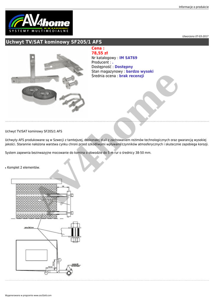 Informacje o produkcie Utworzono 07-03-2017 Uchwyt TV/SAT kominowy SF205/1 AFS Cena : 78,55 zł Uchwyt TV/SAT kominowy SF205/1 AFS om e Nr katalogowy : IM SAT69 Producent : . Dostępność : Dostępny Stan magazynowy : bardzo wysoki Średnia ocena : brak recenzji 4h Uchwyty AFS produkowane są w Szwecji z tamtejszej, doskonałej stali z zachowaniem reżimów technologicznych oraz gwarancją wysokiej jakości. Starannie nałożona warstwa cynku chroni przed szkodliwymi wpływami czynników atmosferycznych i skutecznie zapobiega korozji. System zapewnia bezinwazyjne mocowanie do komina o obwodzie do 5 m rur o średnicy 38-50 mm. Komplet 2 elementów. AV ● Wygenerowano w programie www.oscGold.com