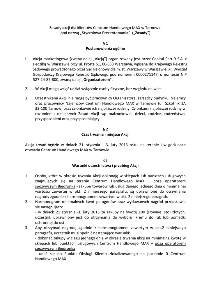 Zasady akcji dla klientów Centrum Handlowego MAX w Tarnowie pod nazwą „Styczniowa Prezentomania” („Zasady”) §1 Postanowienia ogólne 1. Akcja marketingowa (zwany dalej „Akcją”) organizowany jest przez Capital Part 9 S.A. z siedzibą w Warszawie przy ul. Prosta 51, 00-838 Warszawa, wpisaną do Krajowego Rejestru Sądowego prowadzonego przez Sąd Rejonowy dla m. st. Warszawy w Warszawie, XII Wydział Gospodarczy Krajowego Rejestru Sądowego pod numerem 0000271147, o numerze NIP 527-24-87-800, zwaną dalej „Organizatorem”. 2. W Akcji mogą wziąć udział wyłącznie osoby fizyczne, bez względu na wiek. 3. Uczestnikami Akcji nie mogą być pracownicy Organizatora, zarządcy budynku, Najemcy oraz pracownicy Najemców Centrum Handlowego MAX w Tarnowie (ul. Szkotnik 1A 33-100 Tarnów) oraz członkowie ich najbliższej rodziny. Członkami najbliższej rodziny w rozumieniu niniejszych Zasad Akcji są: małżonkowie, dzieci, rodzice, rodzeństwo, przysposobieni oraz przysposabiający. §2 Czas trwania i miejsce Akcji Akcja trwać będzie w dniach 21. stycznia – 3. luty 2013 roku, na terenie i w godzinach otwarcia Centrum Handlowego MAX w Tarnowie. §3 Warunki uczestnictwa i przebieg Akcji 1. 2. 3. Osoby, które w okresie trwania Akcji dokonają w sklepach lub punktach usługowych znajdujących się na terenie Centrum Handlowego MAX – poza operatorem spożywczym Biedronka - zakupu towarów lub usług danego jednego dnia o minimalnej wartości zawartej w pkt. 2 niniejszego paragrafu, są uprawnione do otrzymania nagrody zgodnie z harmonogramem zawartym w pkt. 2 niniejszego paragrafu Harmonogram minimalnych kwot paragonów oraz wydawanych nagród przedstawia się następująco: - w dniach 21 stycznia.-3. luty 2013 za zakupy na kwotę 100 (słownie: sto) złotych, uczestnik uprawniony jest do otrzymania do wyboru: kremu do rak lub pomadki ochronnej do ust Aby otrzymać nagrodę zgodnie z harmonogramem zawartym w pkt.2 niniejszego paragrafu, uczestnik musi spełnić następujące warunki: - dokonać zakupy w ciągu jednego dnia w okresie trwania akcji na minimalną kwotę w sklepach lub punktach usługowych Centrum Handlowego MAX – poza operatorem spożywczym Biedronka - udać się do Punktu Obsługi Klienta zlokalizowanego na poziomie 0 Centrum Handlowego MAX - przedstawić paragon/paragony hostessie w Punkcie Obsługi Klienta – paragony zostaną zaewidencjonowane oraz podstemplowane przez hostessę w Punkcie Obsługi Klienta - okazać dokument tożsamości ze zdjęciem na cele sporządzenia przez Organizatora listy obdarowanych - odebrać przysługującą nagrodę Zakupy dokonane danego jednego dnia podczas trwania Akcji na kwotę minimalną lub jej wielokrotności nie sumują się i nie uprawniają do otrzymania większej liczby nagród, zgodnie z par. 3 pkt 2 Aby otrzymać nagrodę uczestnik może przedstawić paragony z kilku salonów Centrum Handlowego MAX – poza operatorem spożywczym Biedronka, o ile pochodzą z tego samego dnia, w okresie trwania Akcji Nagrody rzeczowe są nagrodami gwarantowanymi, tj. nie podlegają losowaniu. Okazanie paragonów z datą wykraczającą poza okres trwania Akcji nie uprawnia do odbioru nagrody 4. 5. 8. 9. 1. 2. 3. 4. §4 Odbiór Nagrody W celu odebrania nagrody Uczestnik Akcji powinien zgłosić się osobiście z dokumentem ze zdjęciem (dowód osobisty, prawo jazdy, paszport, legitymacja szkolna) do Punktu Obsługi Klienta Centrum Handlowego MAX w dniu spełnienia wymogu, tj dokonania zakupów na minimalną kwotę, zgodnie z par. 3 pkt 2. Liczba nagród do akcji jest ograniczona i wynosi 500 sztuk. W przypadku nie zgłoszenia się Uczestnika Akcji po odbiór nagrody w terminie wskazanym w par. 3 pkt 2, roszczenie o jej wydanie wygasa. Odebranie nagrody nastąpi na podstawie protokołu przekazania nagrody, podpisanego przez Uczestnika, któremu zostanie przyznana nagroda przez Organizatora. §5 Dane Osobowe Uczestnika Akcji 2. Danymi osobowymi przetwarzanymi niezbędnymi rozstrzygnięcia Akcji są: imię i nazwisko Uczestnika Akcji. do przeprowadzenia i §6 Reklamacje 1. 2. Wszelkie reklamacje dotyczące Akcji należy zgłaszać do Organizatora na jego adres w formie pisemnej w terminie 14 dni kalendarzowych od daty zaistnienia podstawy reklamacji, pod rygorem wygaśnięcia jakichkolwiek roszczeń Uczestnika w związku z jego udziałem w Akcji, a w każdym razie nie później niż w terminie 14 dni od dnia zakończenia Akcji. Za datę złożenia reklamacji za pośrednictwem poczty przyjmuje się datę stempla pocztowego. 3. 4. Dokumentację dotycząca przebiegu Akcji Organizator przechowywać będzie przez okres 6 miesięcy od daty zakończenia Akcji. Organizator nie ponosi odpowiedzialności za usługi pocztowe i kurierskie, z których w ramach Akcji będą korzystać Uczestnicy §7 Postanowienia końcowe 1. 2. 3. 4. 5. 6. Organizator oświadcza, iż Akcji nie jest grą losową ani zakładem wzajemnym w rozumieniu przepisów ustawy z dnia 29 lipca 1992 roku o grach i zakładach wzajemnych (tekst jednolity: Dz. U. z 2004 roku, nr 4, poz. 27 z poźn. zm.). Organizator nie ponosi odpowiedzialności za ewentualną utratę danych osobowych Uczestników Akcji spowodowaną awarią systemu z przyczyn niezależnych od Organizatora. Organizator zastrzega sobie prawo do skrócenia lub przedłużenia czasu trwania Akcji. Organizator zastrzega sobie prawo do dokonywania zmian postanowień Zasad Akcji z ważnych powodów, a także z powodu zawieszenia, przerwania, odwołania lub przedłużenia Akcji. Wszelkie zmiany obowiązują z chwilą ich opublikowania na stronie internetowej podanej poniżej. Poprzez zgłoszenie uczestnictwa w Akcji w trybie określonym w § 3 Zasad Akcji Uczestnik Akcji wyraża jednocześnie zgodę na postanowienia Zasad Akcji. Informacje o Akcji, w tym niniejsze Zasady, dostępne są przez cały okres trwania Akcji na stronie internetowej Centrum Handlowego MAX (www.chmax.com.pl) a także w Biurze Administracji Centrum