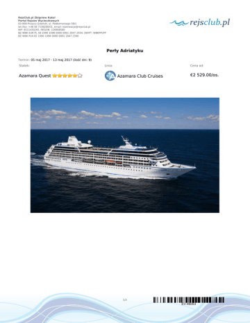 RejsClub.pl Zbigniew Kąkol Portal Rejsów Wycieczkowych 83-000 Pruszcz Gdański, ul. Podkomorzego 58/1 tel./fax: +48 58 7138200/01, email: [email protected] NIP: 6511430265, REGON: 220868580 BZ WBK EUR PL 58 1090 1098 0000 0001 2047 2434, SWIFT: WBKPPLPP BZ WBK PLN 82 1090 1098 0000 0001 2047 2390 Perły Adriatyku Termin: 05 maj 2017 - 13 maj 2017 (ilość dni: 9) Statek: Azamara Quest Linia: Cena od: Azamara Club Cruises €2 529.00/os. 1/3 EV:46053 RejsClub.pl Zbigniew Kąkol Portal Rejsów Wycieczkowych 83-000 Pruszcz Gdański, ul. Podkomorzego 58/1 tel./fax: +48 58 7138200/01, email: [email protected] NIP: 6511430265, REGON: 220868580 BZ WBK EUR PL 58 1090 1098 0000 0001 2047 2434, SWIFT: WBKPPLPP BZ WBK PLN 82 1090 1098 0000 0001 2047 2390 TRASA REJSU dzień 1 dzień 2 dzień 3 dzień 4 dzień 5 dzień 6 dzień 7 dzień 8 dzień 9 Data Port Wpłynięcie Wypłynięcie piątek 05.05.2017 Wenecja --:-- 18:00 08:00 17:00 08:00 21:00 09:00 21:00 08:00 22:00 08:00 14:00 08:00 22:00 08:00 --:-- --:-- --:-- Włochy Zadar sobota 06.05.2017 Chorwacja niedziela 07.05.2017 Chorwacja poniedziałek 08.05.2017 Czarnogóra wtorek 09.05.2017 Legenda Hvar Kotor Dubrownik Chorwacja Korcula środa 10.05.2017 Chorwacja czwartek 11.05.2017 Słowenia Koper piątek 12.05.2017 Wenecja sobota 13.05.2017 Wenecja Włochy Włochy CENNIK Cena katalogowa Kabina wewnętrzna od €2 529.00 Kabina zewnętrzna z oknem od €2 789.00 Kabina zewnętrzna z balkonem od €3 319.00 Suite (apartament) na zapytanie Kabina jednoosobowa na zapytanie 3 osoba dorosła w kabinie na zapytanie Cena promocyjna 2/3 EV:46053 RejsClub.pl Zbigniew Kąkol Portal Rejsów Wycieczkowych 83-000 Pruszcz Gdański, ul. Podkomorzego 58/1 tel./fax: +48 58 7138200/01, email: [email protected] NIP: 6511430265, REGON: 220868580 BZ WBK EUR PL 58 1090 1098 0000 0001 2047 2434, SWIFT: WBKPPLPP BZ WBK PLN 82 1090 1098 0000 0001 2047 2390 dziecko do 12 lat jako 3 i 4 osoba w kabinie Opłaty portowe na zapytanie €119.00 Uwaga! Ceny za osobę w kabinie dwuosobowej. Cena zawiera: zakwaterowanie w kabinie wybranej kategorii; wyżywienie - 3 główne posiłki, przekąski między posiłkami, bufet lub przekąski o północy; napoje - kawa, herbata, woda serwowana do posiłków, soki do śniadania i wino do lunchu i kolacji; serwis bagażowy podczas wejścia i zejścia ze statku; 24 - godzinny serwis kabinowy; korzystanie ze wszystkich urządzeń sportowo - rekreacyjnych znajdujących się na pokładzie statku (basen, jacuzzi, sala fitness, itp.); udział we wszystkich imprezach organizowanych na statku (przedstawienia w teatrze, koncerty, programy animacyjne itp.). Cena nie zawiera: kosztów dojazdu do portu; ewentualnych noclegów w hotelu przed/po rejsie i transferów; wycieczek fakultatywnych w trakcie rejsu; korzystania z barów oraz mini baru w kabinie; korzystania z punktów usługowych (fryzjer, pralnia, fotograf, salon piękności i odnowy biologicznej, internet) i wydatków osobistych; napiwków dla obsługi na statku; ubezpieczenia KL, NNW i bagaż; kosztu wymaganych wiz. 3/3 EV:46053