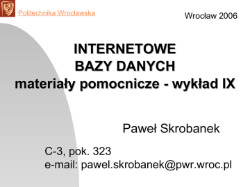 Politechnika Wrocławska Wrocław 2006 INTERNETOWE BAZY DANYCH materiały pomocnicze - wykład IX Paweł Skrobanek C-3, pok. 323 e-mail: [email protected] Politechnika Wrocławska INTERNETOWE BAZY DANYCH PLAN NA „DZIŚ”: 0. Ciekawostka 3. Transakcje 4. Blokowanie rekordów Politechnika Wrocławska 0. Ciekawostka INFORMACJA (http://www.pwr.wroc.pl ) „Specjaliści z Politechniki Wrocławskiej pracujący pod kierunkiem prof. Mirosława Kutyłowskiego odkryli słabe punkty protokołów SSL/TSL i SSH (…)” Zatem: •możliwość odszyfrowania wszystkich komunikatów wysyłanych (po zainfekowaniu wirusem ), •konieczność zastosowania kluczy znanych twórcy wirusa. Politechnika Wrocławska 1. Transakcje TRANSAKCJA (ang. transaction) - niepodzielne „działanie” na bazie danych Przy czym przez „działanie” rozumiemy pojedynczą operację lub zbiór operacji od umownego znacznika początku do zatwierdzenia. Politechnika Wrocławska 1. Transakcje Początek transakcji Wykonanie operacji Zatwierdzenie transakcji (commit) Rys.1. Typowy schemat transakcji Politechnika Wrocławska 1. Transakcje Cechy transakcji: • niepodzielność (ang. atomicity) – może być wykonana w całości, • spójność (ang. consistency) – stan bazy danych może być tylko z przed lub po transakcji (nie może obejmować zapisu części operacji), • niezależność (ang. isolation) – transakcje są odseparowane od siebie, Politechnika Wrocławska 1. Transakcje Cechy transakcji cd.: • trwałość (ang. durability) – jeśli nastąpi awaria w trakcie wykonywania transakcji, to istnieje możliwość odtworzenia stanu bazy danych z przed lub po transakcji (jeśli została zatwierdzona) Politechnika Wrocławska 1. Transakcje - uwagi Mechanizm kronikowania (ang. journalling) - dane na bieżąco zapisywane są do „kroniki”, np. z wykorzystaniem tymczasowego pliku na dysku (jeśli przerwany zostanie zapis danych z kroniki, to po „przywróceniu systemu do pracy” nastąpi dokończenie zapisu. Przykład algorytmu zatwierdzania transakcji: http://en.wikipedia.org/wiki/Two-phase-commit_protoc http://www.vermicelli.pasta.cs.uit.no/ipv6/students/andrer/d Politechnika Wrocławska 1. Transakcje Przykład 1: UPDATE ludzie SET filia=3; Co się stanie, jeśli będzie aktualizowanych np. 1000 rekordów, a operację przerwiemy (awaria)? Typowo: dla żadnego z nich nie będzie zmian. UWAGI: • rozpoczęcie oraz zatwierdzenie – automatycznie, • tak będzie w typowych, renomowanych produktach (np. postgreSQL), ale czy w każdej bazie - trzeba sprawdzić dokumentację! Politechnika Wrocławska 1. Transakcje Przykład 2 (PostgreSQL): Bond przeszedł na naszą stronę (skrypt lub linia komend); BEGIN WORK; INSERT INTO agenci_nasi VALUES (007); DLETE FROM agenci_do_odzysku WHERE ID = ‘007’; COMMIT WORK; Politechnika Wrocławska 1. Transakcje Przykład 3 (Oracle): Bond przeszedł na naszą stronę Politechnika Wrocławska Proponuję prześledzenie wprowadzania zabezpieczeń (nie zdążyliśmy ostatnio – informacja na kartce), decydujemy się na: • ja demonstruję – wszyscy śledzą, • razem wykonujemy Politechnika Wrocławska Przydatne strony podręcznika: http://php.net.pl/manual/pl/function.getenv.php http://php.net.pl/manual/pl/ref.session.php http://php.net.pl/manual/pl/language.variables.predefined.php http://php.net.pl/manual/pl/reserved.variables.php#reserved.variables.en http://php.net.pl/manual/pl/function.exit.php Politechnika Wrocławska 2. Blokowanie rekordów BRAK REKORDU BLOKOWANIE BAZY TABELI OBSZARU Politechnika Wrocławska 2. Blokowanie rekordów BLOKOWANIE AUTMATYCZNE (domyślne ustawienia SZBD) USTALONE ( przez użytkownika np. - opcje formularza (ACCESS), - polecenie SQL (SELECT … FOR UPDATE) - polecenie lock /unlock Politechnika Wrocławska 2. Blokowanie rekordów Przykład (access): • formularz pozwala na opcje: bez blokowania, edytowany rekord, wszystkie rekordy Ale np. wg. [1] nie działa blokowanie rekordu w tabelach połączonych z serwera SQL, a we wcześniejszych wersjach tylko możliwość blokowania obszaru o wielkości 2kB (strona). Więcej informacji, np.: [1] http://main2.amu.edu.pl/~mhanckow/pwsb_bd08.htm Politechnika Wrocławska 2. Blokowanie rekordów Przykład (język SQL): BEGIN WORK; SELECT * FROM pensjonariusze WHERE wiek>100 FOR UPDATE; UPDATE pensjonariusze SET premia = 100 WHERE wiek>100; COMMIT WORK; Uwagi: • możliwość ręcznego blokowania polecenie LOCK, • unikanie deadlock (np. dla transakcji – mechanizm auto - ROLLBACK WORK). Politechnika Wrocławska 2. Blokowanie rekordów IF mamy jeszcze czas THEN sprawdźmy, co będzie jak wszyscy zaczniemy edytować jeden rekord w naszej bazie danych