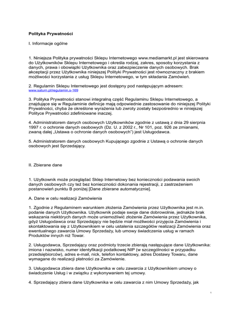 Polityka Prywatności I. Informacje ogólne 1. Niniejsza Polityka prywatności Sklepu Internetowego www.mediamarkt.pl jest skierowana do Użytkowników Sklepu Internetowego i określa rodzaj, zakres, sposoby korzystania z danych, prawa i obowiązki Użytkownika oraz zabezpieczenie danych osobowych. Brak akceptacji przez Użytkownika niniejszej Polityki Prywatności jest równoznaczny z brakiem możliwości korzystania z usług Sklepu Internetowego, w tym składania Zamówień. 2. Regulamin Sklepu Internetowego jest dostępny pod następującym adresem: www.saturn.pl/regulamin,s-169 3. Polityka Prywatności stanowi integralną część Regulaminu Sklepu Internetowego, a znajdujące się w Regulaminie definicje mają odpowiednie zastosowanie do niniejszej Polityki Prywatności, chyba że określone wyrażenia lub zwroty zostały bezpośrednio w niniejszej Polityce Prywatności zdefiniowane inaczej. 4. Administratorem danych osobowych Użytkowników zgodnie z ustawą z dnia 29 sierpnia 1997 r. o ochronie danych osobowych (Dz. U. z 2002 r., Nr 101, poz. 926 ze zmianami, zwaną dalej „Ustawa o ochronie danych osobowych”) jest Usługodawca. 5. Administratorem danych osobowych Kupującego zgodnie z Ustawą o ochronie danych osobowych jest Sprzedający. II. Zbierane dane 1. Użytkownik może przeglądać Sklep Internetowy bez konieczności podawania swoich danych osobowych czy też bez konieczności dokonania rejestracji, z zastrzeżeniem postanowień punktu B poniżej [Dane zbierane automatycznie]. A. Dane w celu realizacji Zamówienia 1. Zgodnie z Regulaminem warunkiem złożenia Zamówienia przez Użytkownika jest m.in. podanie danych Użytkownika. Użytkownik podaje swoje dane dobrowolnie, jednakże brak wskazania niektórych danych może uniemożliwić złożenie Zamówienia przez Użytkownika, gdyż Usługodawca oraz Sprzedający nie będzie miał możliwości przyjęcia Zamówienia i skontaktowania się z Użytkownikiem w celu ustalenia szczegółów realizacji Zamówienia oraz ewentualnego zawarcia Umowy Sprzedaży, lub umowy świadczenia usług w ramach Produktów innych niż Towar. 2. Usługodawca, Sprzedający oraz podmioty trzecie zbierają następujące dane Użytkownika: imiona i nazwisko, numer identyfikacji podatkowej NIP (w szczególności w przypadku przedsiębiorców), adres e-mail, nick, telefon kontaktowy, adres Dostawy Towaru, dane wymagane do realizacji płatności za Zamówienie. 3. Usługodawca zbiera dane Użytkownika w celu zawarcia z Użytkownikiem umowy o świadczenie Usług i w związku z wykonywaniem tej umowy. 4. Sprzedający zbiera dane Użytkownika w celu zawarcia z nim Umowy Sprzedaży, jak 1 również w związku z jej wykonywaniem. 5. Podmioty trzecie zbierają dane Użytkownika w celu umożliwienia korzystania z Infolinii oraz w celu realizacji płatności za Zamówienie (dane zbierają operatorzy płatności, w tym PayU S.A.). 6. Rejestracja Konta wymaga od Użytkownika podania Loginu oraz Hasła zabezpieczającego Konto. W Haśle należy użyć unikatowej kombinacji liczb, liter i znaków. 7. Login i Hasło są poufne i winny być strzeżone przez Użytkownika przed wykorzystaniem przez osoby nieupoważnione przez Użytkownika. B. Dane zbierane automatycznie 1. Podczas korzystania przez Użytkownika ze Sklepu Internetowego automatycznie zbierane są dane dotyczące Użytkownika. Do tych danych zalicza się: adres IP, nazwa domeny, typ przeglądarki, typ systemu operacyjnego. Dane te mogą być zbierane przez pliki cookies („ciasteczka”), system Google Analytics oraz system Web Beacon. 2. Pliki cookies, o których mowa w pkt. 1, to pliki wysyłane do komputera lub innego urządzenia Użytkownika podczas przeglądania strony internetowej Sklepu Internetowego. 2.1. Pliki cookies zapamiętują preferencje Użytkownika, co umożliwia m.in.: a) podnoszenie jakości Usługi, b) poprawianie wyników wyszukiwania i trafności wyświetlanych Towarów, c) tworzenie statystyk oglądalności, d) śledzenie preferencji Użytkownika, e) utrzymywania sesji zalogowanego Użytkownika. 2.2. Pliki cookies nie powodują zmian konfiguracyjnych w urządzeniu lub oprogramowaniu zainstalowanym w urządzeniu Użytkownika. 2.3. Użytkownik może nie wyrazić zgody na wykorzystywanie plików cookies (blokowanie plików cookies), co w przyszłości uniemożliwi przechowywanie plików cookies w urządzeniu Użytkownika. 2.4. Użytkownik, który nie wyraża zgody na wykorzystywanie plików cookies (zastosuje blokadę plików cookies) powinien wybrać odpowiednie ustawienia w używanej przez siebie przeglądarce stron WWW. Proces wyrażania zgody na wykorzystywanie plików cookies różni się w zależności od używanej przez Użytkownika przeglądarki. 2.5. Użytkownik, który chce usunąć dotychczasowe pliki cookies powinien wybrać odpowiednie ustawienia w używanej przez siebie przeglądarce stron WWW lub usunąć pliki cookies ręcznie. Proces usuwania plików cookies różni się w zależności od używanej przez Użytkownika przeglądarki. 2.6. Usługodawca uprzedza, że zablokowanie lub usunięcie plików cookies może spowodować utrudnienia w korzystaniu ze Sklepu Internetowego, a w niektórych przypadkach uniemożliwić korzystanie z niektórych jego opcji. 2 3. Google Analytics, o którym mowa w pkt. 1, to system analityki internetowej dający wgląd w ruch danych Sklepu Internetowego oraz danych demograficznych Użytkowników, stosowany w celu prowadzenia działań marketingowych. 3.1. Użytkownik, który nie wyraża zgody na działanie systemu Google Analytics powinien zastosować blokadę plików cookies. 4. Web Beacon, o którym mowa w pkt. 1, to plik wykorzystywany do monitorowania aktywności Użytkownika na witrynie internetowej lub do sprawdzania adresu e-mail odbiorcy treści wysyłanych przez Użytkownika za pośrednictwem strony internetowej, kiedy wiadomość zawierająca plik Web Beacon jest otwarta. 4.1. Użytkownik, który nie wyraża zgody na działan