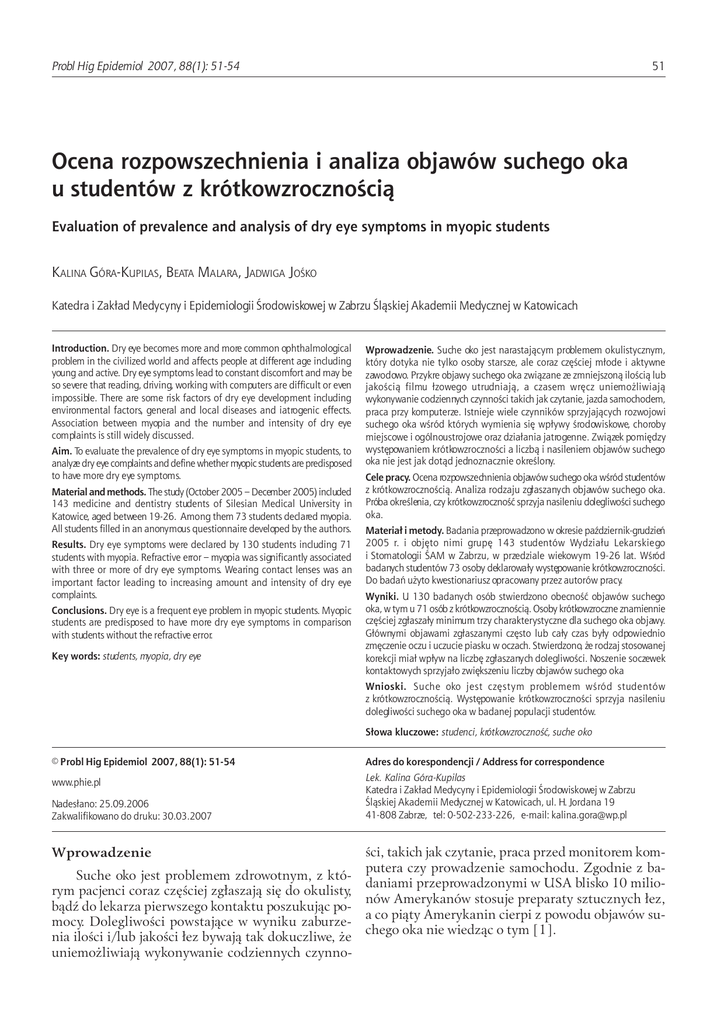 Góra-Kupilas Probl Hig Epidemiol K, Malara 2007, B, Joko 88(1): J. 51-54 Ocena rozpowszechnienia i analiza objawów suchego oka u studentów z krótkowzrocznoci¹ 51 Ocena rozpowszechnienia i analiza objawów suchego oka u studentów z krótkowzrocznoci¹ Evaluation of prevalence and analysis of dry eye symptoms in myopic students KALINA GÓRA-KUPILAS, BEATA MALARA, JADWIGA JOKO Katedra i Zak³ad Medycyny i Epidemiologii rodowiskowej w Zabrzu l¹skiej Akademii Medycznej w Katowicach Introduction. Dry eye becomes more and more common ophthalmological problem in the civilized world and affects people at different age including young and active. Dry eye symptoms lead to constant discomfort and may be so severe that reading, driving, working with computers are difficult or even impossible. There are some risk factors of dry eye development including environmental factors, general and local diseases and iatrogenic effects. Association between myopia and the number and intensity of dry eye complaints is still widely discussed. Aim. To evaluate the prevalence of dry eye symptoms in myopic students, to analyze dry eye complaints and define whether myopic students are predisposed to have more dry eye symptoms. Material and methods. The study (October 2005 December 2005) included 143 medicine and dentistry students of Silesian Medical University in Katowice, aged between 19-26. Among them 73 students declared myopia. All students filled in an anonymous questionnaire developed by the authors. Results. Dry eye symptoms were declared by 130 students including 71 students with myopia. Refractive error myopia was significantly associated with three or more of dry eye symptoms. Wearing contact lenses was an important factor leading to increasing amount and intensity of dry eye complaints. Conclusions. Dry eye is a frequent eye problem in myopic students. Myopic students are predisposed to have more dry eye symptoms in comparison with students without the refractive error. Key words: students, myopia, dry eye Wprowadzenie. Suche oko jest narastaj¹cym problemem okulistycznym, który dotyka nie tylko osoby starsze, ale coraz czêciej m³ode i aktywne zawodowo. Przykre objawy suchego oka zwi¹zane ze zmniejszon¹ iloci¹ lub jakoci¹ filmu ³zowego utrudniaj¹, a czasem wrêcz uniemo¿liwiaj¹ wykonywanie codziennych czynnoci takich jak czytanie, jazda samochodem, praca przy komputerze. Istnieje wiele czynników sprzyjaj¹cych rozwojowi suchego oka wród których wymienia siê wp³ywy rodowiskowe, choroby miejscowe i ogólnoustrojowe oraz dzia³ania jatrogenne. Zwi¹zek pomiêdzy wystêpowaniem krótkowzrocznoci a liczb¹ i nasileniem objawów suchego oka nie jest jak dot¹d jednoznacznie okrelony. Cele pracy. Ocena rozpowszechnienia objawów suchego oka wród studentów z krótkowzrocznoci¹. Analiza rodzaju zg³aszanych objawów suchego oka. Próba okrelenia, czy krótkowzrocznoæ sprzyja nasileniu dolegliwoci suchego oka. Materia³ i metody. Badania przeprowadzono w okresie padziernik-grudzieñ 2005 r. i objêto nimi grupê 143 studentów Wydzia³u Lekarskiego i Stomatologii AM w Zabrzu, w przedziale wiekowym 19-26 lat. Wród badanych studentów 73 osoby deklarowa³y wystêpowanie krótkowzrocznoci. Do badañ u¿yto kwestionariusz opracowany przez autorów pracy. Wyniki. U 130 badanych osób stwierdzono obecnoæ objawów suchego oka, w tym u 71 osób z krótkowzrocznoci¹. Osoby krótkowzroczne znamiennie czêciej zg³asza³y minimum trzy charakterystyczne dla suchego oka objawy. G³ównymi objawami zg³aszanymi czêsto lub ca³y czas by³y odpowiednio zmêczenie oczu i uczucie piasku w oczach. Stwierdzono, ¿e rodzaj stosowanej korekcji mia³ wp³yw na liczbê zg³aszanych dolegliwoci. Noszenie soczewek kontaktowych sprzyja³o zwiêkszeniu liczby objawów suchego oka Wnioski. Suche oko jest czêstym problemem wród studentów z krótkowzrocznoci¹. Wystêpowanie krótkowzrocznoci sprzyja nasileniu dolegliwoci suchego oka w badanej populacji studentów. S³owa kluczowe: studenci, krótkowzrocznoæ, suche oko © Probl Hig Epidemiol 2007, 88(1): 51-54 Adres do korespondencji / Address for correspondence www.phie.pl Lek. Kalina Góra-Kupilas Katedra i Zak³ad Medycyny i Epidemiologii rodowiskowej w Zabrzu l¹skiej Akademii Medycznej w Katowicach, ul. H. Jordana 19 41-808 Zabrze, tel: 0-502-233-226, e-mail: [email protected] Nades³ano: 25.09.2006 Zakwalifikowano do druku: 30.03.2007 Wprowadzenie Suche oko jest problemem zdrowotnym, z którym pacjenci coraz czêciej zg³aszaj¹ siê do okulisty, b¹d do lekarza pierwszego kontaktu poszukuj¹c pomocy. Dolegliwoci powstaj¹ce w wyniku zaburzenia iloci i/lub jakoci ³ez bywaj¹ tak dokuczliwe, ¿e uniemo¿liwiaj¹ wykonywanie codziennych czynno- ci, takich jak czytanie, praca przed monitorem komputera czy prowadzenie samochodu. Zgodnie z badaniami przeprowadzonymi w USA blisko 10 milionów Amerykanów stosuje preparaty sztucznych ³ez, a co pi¹ty Amerykanin cierpi z powodu objawów suchego oka nie wiedz¹c o tym [1]. 52 Cele pracy 1. Ocena rozpowszechnienia objawów suchego oka wród studentów z krótkowzrocznoci¹. 2. Analiza rodzaju zg³aszanych objawów suchego oka. 3. Próba okrelenia, czy krótkowzrocznoæ sprzyja nasileniu dolegliwoci suchego oka. Materia³ i metody Badanie przeprowadzono w okresie od padziernika 2005 do grudnia 2005 r. Do badania przyst¹pi³o 153 studentów Wydzia³u Lekarskiego i Stomatologii w Zabrzu l¹skiej Akademii Medycznej w Katowicach, w przedziale wiekowym 19-26 lat. Badanie przeprowadzono metod¹ anonimowej ankietyzacji. U¿yto kwestionariusza opracowanego przez autorów pracy. Kwestionariusz zawiera³ pytania dotycz¹ce aktualnego stanu refrakcji studentów. Z badanej grupy dalszej analizie poddano 143 kwestionariusze studentów z krótkowzrocznoci¹ i bez wady refrakcji. Dalsze pytania dotyczy³y wystêpowania objawów typowych dla suchego oka oraz czêstotliwoci ich wystêpowania. Brano pod uwagê 10 ob- jawów: uczucie