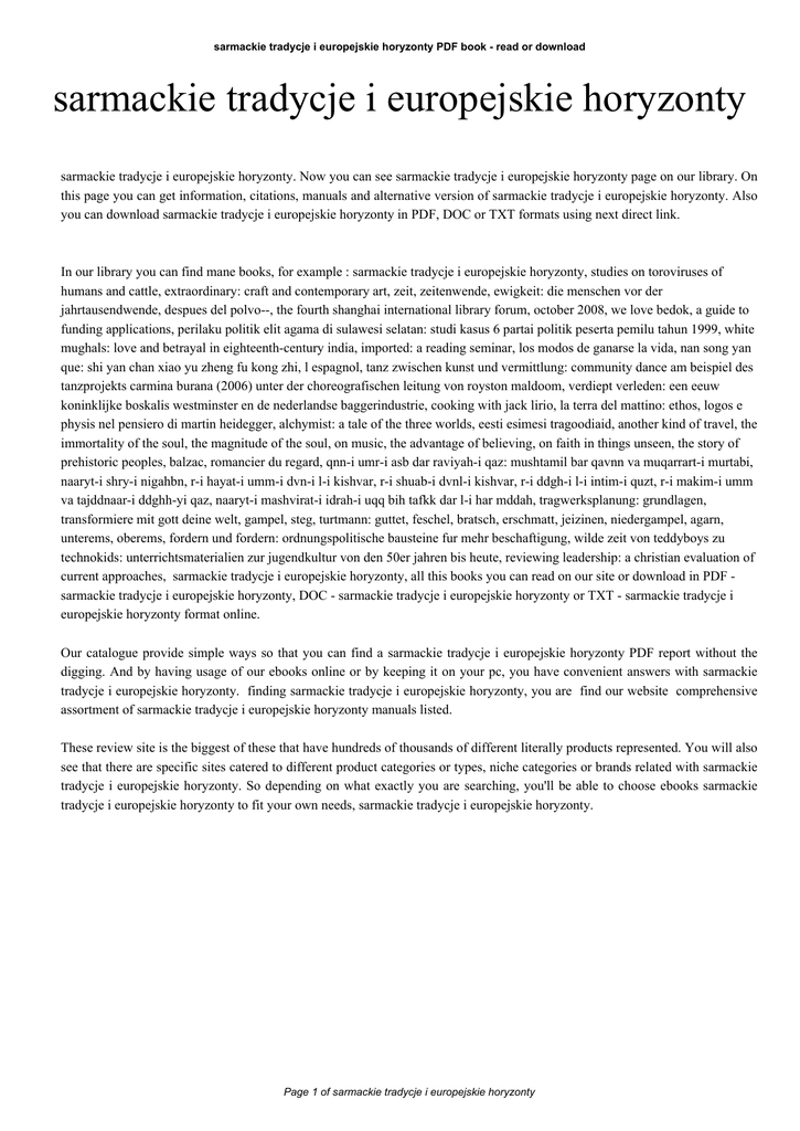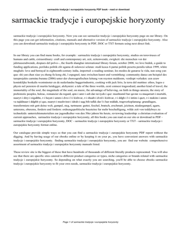 sarmackie tradycje i europejskie horyzonty PDF book - read or download sarmackie tradycje i europejskie horyzonty sarmackie tradycje i europejskie horyzonty. Now you can see sarmackie tradycje i europejskie horyzonty page on our library. On this page you can get information, citations, manuals and alternative version of sarmackie tradycje i europejskie horyzonty. Also you can download sarmackie tradycje i europejskie horyzonty in PDF, DOC or TXT formats using next direct link. In our library you can find mane books, for example : sarmackie tradycje i europejskie horyzonty, studies on toroviruses of humans and cattle, extraordinary: craft and contemporary art, zeit, zeitenwende, ewigkeit: die menschen vor der jahrtausendwende, despues del polvo--, the fourth shanghai international library forum, october 2008, we love bedok, a guide to funding applications, perilaku politik elit agama di sulawesi selatan: studi kasus 6 partai politik peserta pemilu tahun 1999, white mughals: love and betrayal in eighteenth-century india, imported: a reading seminar, los modos de ganarse la vida, nan song yan que: shi yan chan xiao yu zheng fu kong zhi, l espagnol, tanz zwischen kunst und vermittlung: community dance am beispiel des tanzprojekts carmina burana (2006) unter der choreografischen leitung von royston maldoom, verdiept verleden: een eeuw koninklijke boskalis westminster en de nederlandse baggerindustrie, cooking with jack lirio, la terra del mattino: ethos, logos e physis nel pensiero di martin heidegger, alchymist: a tale of the three worlds, eesti esimesi tragoodiaid, another kind of travel, the immortality of the soul, the magnitude of the soul, on music, the advantage of believing, on faith in things unseen, the story of prehistoric peoples, balzac, romancier du regard, qnn-i umr-i asb dar raviyah-i qaz: mushtamil bar qavnn va muqarrart-i murtabi, naaryt-i shry-i nigahbn, r-i hayat-i umm-i dvn-i l-i kishvar, r-i shuab-i dvnl-i kishvar, r-i ddgh-i l-i intim-i quzt, r-i makim-i umm va tajddnaar-i ddghh-yi qaz, naaryt-i mashvirat-i idrah-i uqq bih tafkk dar l-i har mddah, tragwerksplanung: grundlagen, transformiere mit gott deine welt, gampel, steg, turtmann: guttet, feschel, bratsch, erschmatt, jeizinen, niedergampel, agarn, unterems, oberems, fordern und fordern: ordnungspolitische bausteine fur mehr beschaftigung, wilde zeit von teddyboys zu technokids: unterrichtsmaterialien zur jugendkultur von den 50er jahren bis heute, reviewing leadership: a christian evaluation of current approaches, sarmackie tradycje i europejskie horyzonty, all this books you can read on our site or download in PDF sarmackie tradycje i europejskie horyzonty, DOC - sarmackie tradycje i europejskie horyzonty or TXT - sarmackie tradycje i europejskie horyzonty format online. Our catalogue provide simple ways so that you can find a sarmackie tradycje i europejskie horyzonty PDF report without the digging. And by having usage of our ebooks online or by keeping it on your pc, you have convenient answers with sarmackie tradycje i europejskie horyzonty. finding sarmackie tradycje i europejskie horyzonty, you are find our website comprehensive assortment of sarmackie tradycje i europejskie horyzonty manuals listed. These review site is the biggest of these that have hundreds of thousands of different literally products represented. You will also see that there are specific sites catered to different product categories or types, niche categories or brands related with sarmackie tradycje i europejskie horyzonty. So depending on what exactly you are searching, you'll be able to choose ebooks sarmackie tradycje i europejskie horyzonty to fit your own needs, sarmackie tradycje i europejskie horyzonty. Page 1 of sarmackie tradycje i europejskie horyzonty