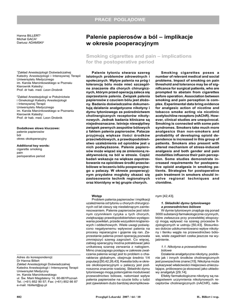 PRACE POGL¥DOWE Hanna BILLERT1 Micha³ GACA2 Dariusz ADAMSKI2 Palenie papierosów a ból implikacje w okresie pooperacyjnym Smoking cigarettes and pain implications for the postoperative period Zak³ad Anestezjologii Dowiadczalnej Katedry Anestezjologii i Intensywnej Terapii Uniwersytetu Medycznego im. Karola Marcinkowskiego w Poznaiu Kierownik Katedry: Prof. dr hab. med. Leon Drobnik 1 Zak³ad Anestezjologii w Po³o¿nictwie i Ginekologii Katedry Anestezjologii i Intensywnej Terapii Uniwersytetu Medycznego im. Karola Marcinkowskiego w Poznaniu Kierownik Katedry: Prof. dr hab. med. Leon Drobnik 2 Dodatkowe s³owa kluczowe: palenie papierosów ból okres oko³operacyjny Additional key words: cigarette smoking pain perioperative period Adres do korespondencji: Dr Hanna Billert Zak³ad Anestezjologii Dowiadczalnej Katedra Anestezjologii i Intensywnej Terapii Uniwersytet Medyczny im. Karola Marcinkowskiego ul. w. Marii Magdaleny 14, 60-861Poznañ Tel.: (+61) 852 90 57; Fax: (+61) 852 66 87 e-mail: [email protected] 882 Palenie tytoniu stwarza szereg istotnych problemów zdrowotnych i spo³ecznych. Wp³yw palenia na próg i tolerancjê bólu mo¿e mieæ szczególne znaczenie dla chorych chirurgicznych, którym przed operacj¹ zaleca siê zaprzestanie palenia. Zwi¹zek palenia papierosów z czuciem bólu jest z³o¿ony. Badania dowiadczalne dokumentuj¹ dzia³anie analgetyczne nikotyny i dymu tytoniowego za porednictwem cholinergicznych receptorów nikotynowych. Jednak badania kliniczne s¹ niejednoznaczne. Istnieje niew¹tpliwy zwi¹zek pewnych zespo³ów bólowych z faktem palenia papierosów. Palacze przyjmuj¹ wiêksze iloci rodków przeciwbólowych, a prawdopodobieñstwo uzale¿nienia od opioidów jest u nich podwy¿szone. Palenie papierosów mo¿e wi¹zaæ siê ze zmienion¹ reaktywnoci¹ na ból w stresie. Czêæ badañ wskazuje na wiêksze zapotrzebowanie na opioidowe rodki przeciwbólowe w leczeniu bólu pooperacyjnego u palaczy. W okresie pooperacyjnym przydatne mog³oby okazaæ siê zastosowanie technik regionalnych oraz klonidyny w tej grupie chorych. Smoking cigarettes poses a number of relevant medical and social problems. Impact of smoking on pain threshold and tolerance may be of significance for surgical patients, who are prompted to abstain from cigarettes before operation. Association between smoking and pain perception is complex. Experimental data bring evidence for analgesic action of nicotine and tobacco smoke acting via nicotinic acetylochline receptors (nAChR). However, clinical studies are unequivocal. Smoking is connected with some pain syndromes. Smokers take much more analgesics than non-smokers and probability of developing opioid dependence is increased in this group of patients. Smokers also present with altered mechanism of stress-induced analgesia and both gender and pain modalities influence their pain perception. Some studies demonstrate increased requirements for postoperative opioid analgesia in smoking patients. Strategies for postoperative pain treatment in smokers should involve regional techniques and clonidine. Wstêp Problem palenia papierosów i implikacji uzale¿nienia od tytoniu u chorych chirurgicznych od lat cieszy siê nies³abn¹cym zainteresowaniem. Palenie papierosów jest istotnym czynnikiem ryzyka u tych chorych, zwiêkszaj¹c prawdopodobieñstwo wystêpowania powik³añ, przede wszystkim kr¹¿eniowych i oddechowych. Wiele uwagi powiêcono negatywnemu wp³ywowi palenia na procesy reparacyjne i gojenie siê ran. Zaprzestanie palenia przed operacj¹ pozwala zmniejszyæ szereg zagro¿eñ. Co wiêcej, zabieg operacyjny mo¿na potraktowaæ jako unikatow¹ szansê zerwania z na³ogiem. Mimo znacz¹cego postêpu w zakresie zwalczania palenia wci¹¿ jest to problem o charakterze globalnym, obejmuje rednio 1/4 populacji [50,42,26,43]. Kwestia bólu w okresie oko³ooperacyjnym u palaczy jest podnoszona znacznie rzadziej. Sk³adniki dymu tytoniowego mog¹ potencjalnie modulowaæ przewodnictwo bólowe, natomiast wp³yw palenia papierosów na czucie bólu u ludzi jest zjawiskiem du¿o bardziej skomplikowa- nym [42,43]. Przegl¹d Lekarski 2007 / 64 / 10 1. Sk³adniki dymu tytoniowego a przewodnictwo bólowe W dymie tytoniowym znajduje siê ponad 3000 substancji farmakologicznie czynnych, które zw³aszcza przy przewlek³ej ekspozycji mog¹ wp³ywaæ na szereg procesów fizjologicznych w ustroju [50,43]. Stosunkowo dobrze udokumentowano wp³yw nikotyny i tlenku wêgla na przewodnictwo bólowe, wiele zagadnieñ czeka jeszcze na wyjanienie. 1.1. Nikotyna a przewodnictwo bólowe Dzia³anie analgetyczne nikotyny, podobnie jak i innych rodków cholinergicznych jest powszechnie znane [15]. Nikotyna mo¿e wykazywaæ w³aciwoci miejscowo-znieczulaj¹ce, próbowano ja stosowaæ jako uk³adowy analgetyk [29,14]. Efekty farmakologiczne nikotyny s¹ nastêpstwem uczynnienia nikotynowych receptorów cholinergicznych (nAChR), nale- H.. Billert i wsp. ¿¹cych do filogenetycznie najstarszych kana³ów jonowych bramkowanych przez ligandy. Receptor nAChR ma budowê pentametryczn¹ i mo¿e funkcjonowaæ w formie homo- i heteromerycznej. Jego podjednostki - a2- a7, a9, a10, b2-4 s¹ kodowane przez 11 genów. Ekspresja i czynnoæ tych receptorów maj¹ kluczowe znaczenie w zespole uzale¿nienia od nikotyny, pe³ni¹ istotn¹ rolê w modulacji przewodnictwa bólowego, przy czym ich pobudzenie mo¿e wi¹zaæ siê z efektami zarówno anty-, jak i pronocyceptywnymi. Receptory nAChR s¹ zlokalizowane pre- i postsynaptycznie w obrêbie synaps akso-aksonalnych i somato-dendrytycznych. Modulacja przewodnictwa bólowego za porednictwem nAChR dokonuje siê na wszystkich poziomach nocycepcji obwodowym, rdzeniowym i ponadrdzeniowym. Pobudzenie tych receptorów powoduje zwiêkszenie uwalniania szeregu neuroprzekaników, w tym dopaminy, noradrenaliny, kwasu g-hydroksyaminomas³owego (GABA), glutaminianu, glicyny, acetylocholiny, serotoniny i neuropeptydów [24]. Procesy te s¹ w znacz