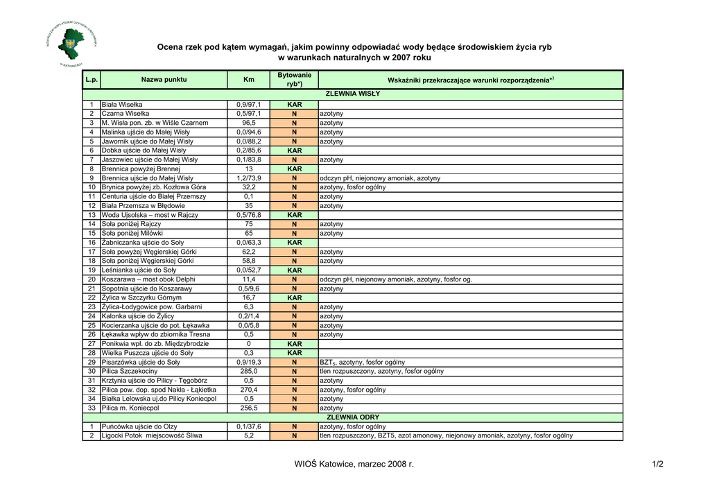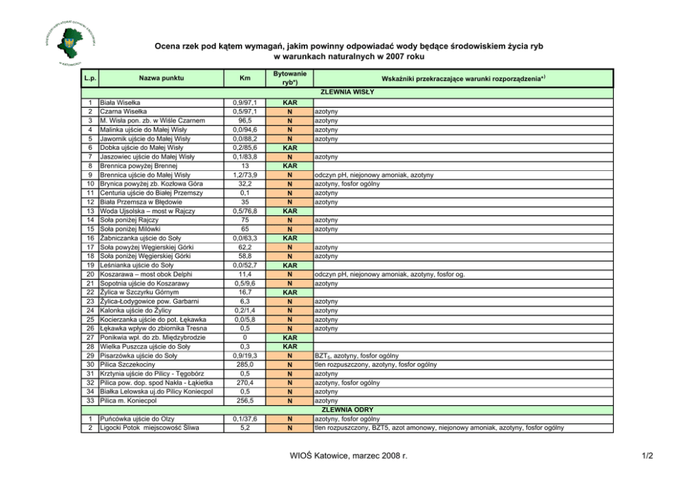Ocena rzek pod kątem wymagań, jakim powinny odpowiadać wody będące środowiskiem życia ryb w warunkach naturalnych w 2007 roku L.p. Nazwa punktu Km Bytowanie ryb*) Wskaźniki przekraczające warunki rozporządzenia* ) ZLEWNIA WISŁY 1 2 3 4 5 6 7 8 9 10 11 12 13 14 15 16 17 18 19 20 21 22 23 24 25 26 27 28 29 30 31 32 34 33 Biała Wisełka Czarna Wisełka M. Wisła pon. zb. w Wiśle Czarnem Malinka ujście do Małej Wisły Jawornik ujście do Małej Wisły Dobka ujście do Małej Wisły Jaszowiec ujście do Małej Wisły Brennica powyżej Brennej Brennica ujście do Małej Wisły Brynica powyżej zb. Kozłowa Góra Centuria ujście do Białej Przemszy Biała Przemsza w Błędowie Woda Ujsolska – most w Rajczy Soła poniżej Rajczy Soła poniżej Milówki Żabniczanka ujście do Soły Soła powyżej Węgierskiej Górki Soła poniżej Węgierskiej Górki Leśnianka ujście do Soły Koszarawa – most obok Delphi Sopotnia ujście do Koszarawy Żylica w Szczyrku Górnym Żylica-Łodygowice pow. Garbarni Kalonka ujście do Żylicy Kocierzanka ujście do pot. Łękawka Łękawka wpływ do zbiornika Tresna Ponikwia wpł. do zb. Międzybrodzie Wielka Puszcza ujście do Soły Pisarzówka ujście do Soły Pilica Szczekociny Krztynia ujście do Pilicy - Tęgobórz Pilica pow. dop. spod Nakła - Łąkietka Białka Lelowska uj.do Pilicy Koniecpol Pilica m. Koniecpol 0,9/97,1 0,5/97,1 96,5 0,0/94,6 0,0/88,2 0,2/85,6 0,1/83,8 13 1,2/73,9 32,2 0,1 35 0,5/76,8 75 65 0,0/63,3 62,2 58,8 0,0/52,7 11,4 0,5/9,6 16,7 6,3 0,2/1,4 0,0/5,8 0,5 0 0,3 0,9/19,3 285,0 0,5 270,4 0,5 256,5 KAR N N N N KAR N KAR N N N N KAR N N KAR N N KAR N N KAR N N N N KAR KAR N N N N N N 1 2 Puńcówka ujście do Olzy Ligocki Potok miejscowość Śliwa 0,1/37,6 5,2 N N azotyny azotyny azotyny azotyny azotyny odczyn pH, niejonowy amoniak, azotyny azotyny, fosfor ogólny azotyny azotyny azotyny azotyny azotyny azotyny odczyn pH, niejonowy amoniak, azotyny, fosfor og. azotyny azotyny azotyny azotyny azotyny BZT5, azotyny, fosfor ogólny tlen rozpuszczony, azotyny, fosfor ogólny azotyny azotyny, fosfor ogólny azotyny azotyny ZLEWNIA ODRY azotyny, fosfor ogólny tlen rozpuszczony, BZT5, azot amonowy, niejonowy amoniak, azotyny, fosfor ogólny WIOŚ Katowice, marzec 2008 r. 1/2 Ocena rzek pod kątem wymagań, jakim powinny odpowiadać wody będące środowiskiem życia ryb w warunkach naturalnych w 2007 roku L.p. Nazwa punktu Km Bytowanie ryb*) 3 4 5 6 7 8 9 10 11 12 13 14 15 16 17 18 19 20 21 22 23 24 25 26 Mała Panew m. Miotek powyżej Kalet Leśnica ujście do Małej Panwi m. Kokote Mała Panew powyżej ujścia Stoły k. Potęp Kanar ujście do Stoły - Tworóg Mała Panew poniżej uj. Stoły-Krupski Młyn Piła ujście do Małej Panwi - Borowiany Warta powyżej Zawiercia - Kromołów Warta pow. zbiornika Poraj - Lgota Górna Boży Stok miejscowość Ordon Warta miejscowość Poraj Stradomka ujście do Warty, Częstochowa Warta miejscowość Mstów Warta miejscowość Rzeki Małe Wiercica poniżej pstrągarni - Złoty Potok Wiercica poniżej zb. w Zalesicach - Knieja Wiercica m. Chmielarze Potok Jeżowski uj. do Liswarty Łomnica miejscowość Bodzanowice Liswarta poniżej Łomnicy - Starokrzepice Górnianka miejscowość Opatów Liswarta poniżej Górnianki - Zawady Kocinka miejscowość Trzebca Liswarta wodowskaz Kule Warta poniżej ujścia Liswarty - Wąsosz 113,2 0,3 86,0 0,3 78,3 1,5 808,2 776,6 6,0 763,9 0,5 721,0 707,0 28,5 9,4 0,5 2,0 2,6 41,6 11,0 14,5 0,5 0,9 633,2 N N N N N N N N N N N N N N N N N N N N N N N N Wskaźniki przekraczające warunki rozporządzenia* ) azotyny azotyny azot amonowy, azotyny, fosfor ogólny tlen rozpuszczony, azotyny, fosfor ogólny azot amonowy, niejonowy amoniak, azotyny, fosfor ogólny azotyny tlen rozpuszczony, fosfor ogólny azot amonowy, azotyny, fosfor ogólny tlen rozpuszczony, azot amonowy, niejonowy amoniak, azotyny, fosfor ogólny tlen rozpuszczony, azotyny, fosfor ogólny azot amonowy, azotyny, fosfor ogólny azot amonowy, azotyny, fosfor ogólny azot amonowy, azotyny, fosfor ogólny azotyny tlen rozpuszczony, azotyny azotyny azotyny, fosfor ogólny tlen rozpuszczony, azot amonowy, azotyny azotyny odczyn, azotyny, fosfor ogólny azotyny azotyny, fosfor ogólny azotyny azotyny *) wg rozporządzenia Ministra Środowiska z dnia 4 października 2002 roku w sprawie wymagań, jakim powinny odpowiadać wody śródlądowe będące środowiskiem życia ryb w warunkach naturalnych (Dz.U. nr 176, poz.1455), ŁOS – spełnia wymagania dla ryb łososiowatych, KAR - spełnia wymagania dla ryb karpiowatych, N – nie spełnia wymagań rozporządzenia WIOŚ Katowice, marzec 2008 r. 2/2