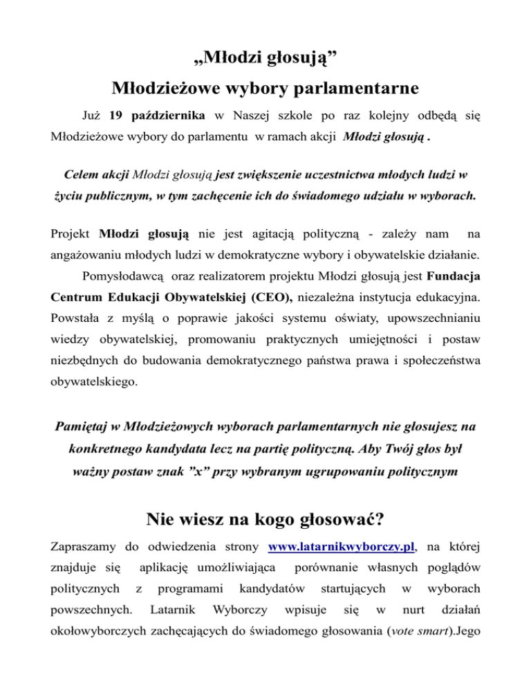 „Młodzi głosują” Młodzieżowe wybory parlamentarne Już 19 października w Naszej szkole po raz kolejny odbędą się Młodzieżowe wybory do parlamentu w ramach akcji Młodzi głosują . Celem akcji Młodzi głosują jest zwiększenie uczestnictwa młodych ludzi w życiu publicznym, w tym zachęcenie ich do świadomego udziału w wyborach. Projekt Młodzi głosują nie jest agitacją polityczną - zależy nam na angażowaniu młodych ludzi w demokratyczne wybory i obywatelskie działanie. Pomysłodawcą oraz realizatorem projektu Młodzi głosują jest Fundacja Centrum Edukacji Obywatelskiej (CEO), niezależna instytucja edukacyjna. Powstała z myślą o poprawie jakości systemu oświaty, upowszechnianiu wiedzy obywatelskiej, promowaniu praktycznych umiejętności i postaw niezbędnych do budowania demokratycznego państwa prawa i społeczeństwa obywatelskiego. Pamiętaj w Młodzieżowych wyborach parlamentarnych nie głosujesz na konkretnego kandydata lecz na partię polityczną. Aby Twój głos był ważny postaw znak ”x” przy wybranym ugrupowaniu politycznym Nie wiesz na kogo głosować? Zapraszamy do odwiedzenia strony www.latarnikwyborczy.pl, na której znajduje się aplikację umożliwiająca politycznych z powszechnych. programami Latarnik porównanie własnych poglądów kandydatów Wyborczy startujących wpisuje się w w nurt wyborach działań okołowyborczych zachęcających do świadomego głosowania (vote smart).Jego twórcą zależy na tym, by decyzje podejmowane przez obywateli przy urnach były przemyślane i odnosiły się do programów wyborczych komitetów. Aplikacja nie promuje żadnych partii, komitetów, ani żadnych konkretnych poglądów politycznych.