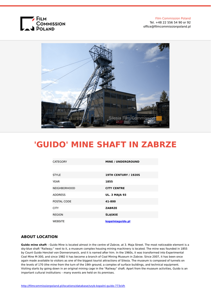 Film Commission Poland Tel. +48 22 556 54 90 or 92 office@filmcommissionpoland.pl 'GUIDO' MINE SHAFT IN ZABRZE CATEGORY MINE / UNDERGROUND STYLE 19TH CENTURY / 1920S YEAR 1855 NEIGHBORHOOD CITY CENTRE ADDRESS UL. 3 MAJA 93 POSTAL CODE 41-800 CITY ZABRZE REGION ŚLĄSKIE WEBSITE kopalniaguido.pl ABOUT LOCATION Guido mine shaft – Guido Mine is located almost in the centre of Zabrze, at 3. Maja Street. The most noticeable element is a sky-blue shaft “Railway;” next to it, a museum complex housing mining machinery is located. The mine was founded in 1855 by Count Guido Henckel von Donnersmarck, and it is named after him. In the 1960s, it was transformed into Experimental Coal Mine M-300, and since 1982 it has become a branch of Coal Mining Museum in Zabrze. Since 2007, it has been once again made available to visitors as one of the biggest tourist attractions of Silesia. The museum is composed of tunnels on the levels of 170 (the mine from the turn of the 19th ground, a complex of surface buildings, and technical equipment. Visiting starts by going down in an original mining cage in the “Railway” shaft. Apart from the museum activities, Guido is an important cultural institutions – many events are held on its premises. http://filmcommissionpoland.pl/locations/database/szyb-kopalni-guido-773sVh
