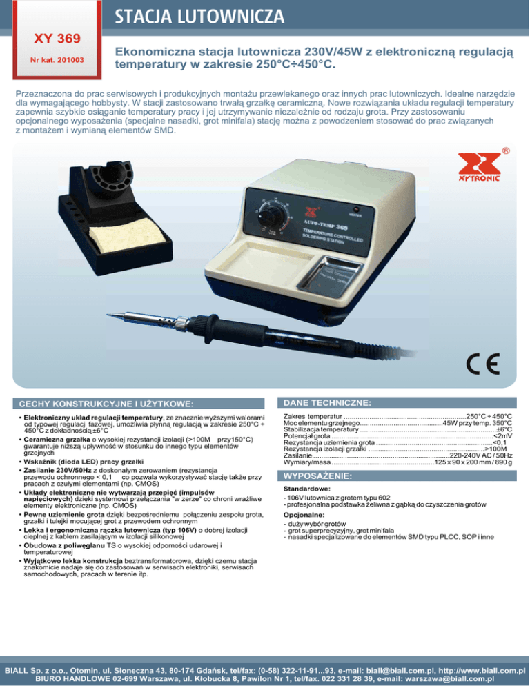 STACJA LUTOWNICZA XY 369 Nr kat. 201003 Ekonomiczna stacja lutownicza 230V/45W z elektroniczn¹ regulacj¹ temperatury w zakresie 250°C÷450°C. Przeznaczona do prac serwisowych i produkcyjnych monta¿u przewlekanego oraz innych prac lutowniczych. Idealne narzêdzie dla wymagaj¹cego hobbysty. W stacji zastosowano trwa³¹ grza³kê ceramiczn¹. Nowe rozwi¹zania uk³adu regulacji temperatury zapewnia szybkie osi¹ganie temperatury pracy i jej utrzymywanie niezale¿nie od rodzaju grota. Przy zastosowaniu opcjonalnego wyposa¿enia (specjalne nasadki, grot minifala) stacjê mo¿na z powodzeniem stosowaæ do prac zwi¹zanych z monta¿em i wymian¹ elementów SMD. R CECHY KONSTRUKCYJNE I U¯YTKOWE: DANE TECHNICZNE: • Elektroniczny uk³ad regulacji temperatury, ze znacznie wy¿szymi walorami od typowej regulacji fazowej, umo¿liwia p³ynn¹ regulacj¹ w zakresie 250°C ÷ 450°C z dok³adnoœci¹ ±6°C • Ceramiczna grza³ka o wysokiej rezystancji izolacji (>100MW przy150°C) gwarantuje ni¿sz¹ up³ywnoœæ w stosunku do innego typu elementów grzejnych • WskaŸnik (dioda LED) pracy grza³ki • Zasilanie 230V/50Hz z doskona³ym zerowaniem (rezystancja przewodu ochronnego < 0,1W) co pozwala wykorzystywaæ stacjê tak¿e przy pracach z czu³ymi elementami (np. CMOS) • Uk³ady elektroniczne nie wytwarzaj¹ przepiêæ (impulsów napiêciowych) dziêki systemowi prze³¹czania "w zerze" co chroni wra¿liwe elementy elektroniczne (np. CMOS) • Pewne uziemienie grota dziêki bezpoœredniemu po³¹czeniu zespo³u grota, grza³ki i tulejki mocuj¹cej grot z przewodem ochronnym • Lekka i ergonomiczna r¹czka lutownicza (typ 106V) o dobrej izolacji cieplnej z kablem zasilaj¹cym w izolacji silikonowej • Obudowa z poliwêglanu TS o wysokiej odpornoœci udarowej i temperaturowej • Wyj¹tkowo lekka konstrukcja beztransformatorowa, dziêki czemu stacja znakomicie nadaje siê do zastosowañ w serwisach elektroniki, serwisach samochodowych, pracach w terenie itp. Zakres temperatur ..............................................................250°C ÷ 450°C Moc elementu grzejnego..........................................45W przy temp. 350°C Stabilizacja temperatury .....................................................................±6°C Potencja³ grota ..................................................................................<2mV Rezystancja uziemienia grota ...........................................................<0,1W Rezystancja izolacji grza³ki ...........................................................>100MW Zasilanie .....................................................................220-240V AC / 50Hz Wymiary/masa ....................................................125 x 90 x 200 mm / 890 g WYPOSA¯ENIE: Standardowe: - 106V lutownica z grotem typu 602 - profesjonalna podstawka ¿eliwna z g¹bk¹ do czyszczenia grotów Opcjonalne: - du¿y wybór grotów - grot superprecyzyjny, grot minifala - nasadki specjalizowane do elementów SMD typu PLCC, SOP i inne BIALL Sp. z o.o., Otomin, ul. S³oneczna 43, 80-174 Gdañsk, tel/fax: (0-58) 322-11-91...93, e-mail: [email protected], http://www.biall.com.pl BIURO HANDLOWE 02-699 Warszawa, ul. K³obucka 8, Pawilon Nr 1, tel/fax. 022 331 28 39, e-mail: [email protected]