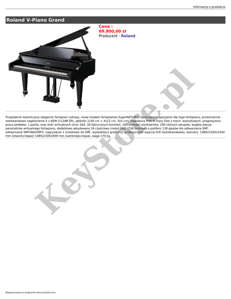 Informacje o produkcie Roland V-Piano Grand Cena : 69.800,00 zł or e. pl Producent : Roland K ey St Przepięknie wykończony elegancki fortepian cyfrowy, nowe modele fortepianów SuperNATURAL opracowane specjalnie dla tego fortepianu, przestrzenne wielokanałowe nagłośnienie 4 x 60W (112dB SPL, głośniki 1x30 cm + 4x12 cm, 3x5 cm), klawiatura PHA III Ivory Feel z mech. wymykowym, progresywna praca pedałów, 1 partia, max ilość wirtualnych strun 264, 30 fabrycznych brzmień, 100 brzmień użytkownika, 100 różnych setupów, bogata edycja parametrów wirtualnego fortepianu, dodatkowo wbudowany 16 częściowy moduł GM2 (256 brzmień) o polifonii 128 głosów dla odtwarzania SMF, odtwarzanie SMF/WAV/MP3, nagrywanie 1 ścieżkowe do SMF, wyświetlacz graficzny, profesjonalne wyjścia XLR (wielokanałowe), wymiary: 1485x1505x1544 mm (otwarta klapa)/ 1485x1505x939 mm (zamknięta klapa), waga 170 kg Wygenerowano w programie www.oscGold.com