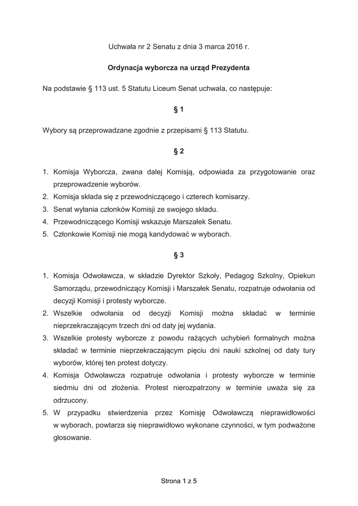 Uchwała nr 2 Senatu z dnia 3 marca 2016 r. Ordynacja wyborcza na urząd Prezydenta Na podstawie § 113 ust. 5 Statutu Liceum Senat uchwala, co następuje: §1 Wybory są przeprowadzane zgodnie z przepisami § 113 Statutu. §2 1. Komisja Wyborcza, zwana dalej Komisją, odpowiada za przygotowanie oraz przeprowadzenie wyborów. 2. Komisja składa się z przewodniczącego i czterech komisarzy. 3. Senat wyłania członków Komisji ze swojego składu. 4. Przewodniczącego Komisji wskazuje Marszałek Senatu. 5. Członkowie Komisji nie mogą kandydować w wyborach. §3 1. Komisja Odwoławcza, w składzie Dyrektor Szkoły, Pedagog Szkolny, Opiekun Samorządu, przewodniczący Komisji i Marszałek Senatu, rozpatruje odwołania od decyzji Komisji i protesty wyborcze. 2. Wszelkie odwołania od decyzji Komisji można składać w terminie nieprzekraczającym trzech dni od daty jej wydania. 3. Wszelkie protesty wyborcze z powodu rażących uchybień formalnych można składać w terminie nieprzekraczającym pięciu dni nauki szkolnej od daty tury wyborów, której ten protest dotyczy. 4. Komisja Odwoławcza rozpatruje odwołania i protesty wyborcze w terminie siedmiu dni od złożenia. Protest nierozpatrzony w terminie uważa się za odrzucony. 5. W przypadku stwierdzenia przez Komisję Odwoławczą nieprawidłowości w wyborach, powtarza się nieprawidłowo wykonane czynności, w tym podważone głosowanie. Strona 1 z 5 6. Komisja Odwoławcza wydaje decyzję o powtórzeniu czynności wyborczych na podstawie rozpatrzonego protestu wyborczego. 7. Komisja Odwoławcza stwierdza ważność wyborów dzień po upływie terminu składania protestów wyborczych lub najpóźniej dzień po rozpatrzeniu wszystkich złożonych protestów wyborczych. 8. Decyzje Komisji Odwoławczej są ostatecznie i nie przysługuje od nich odwołanie. §4 1. Przewodniczący Komisji zarządza wybory nie później niż 30 dni przed dniem głosowania i publikuje pełny harmonogram wyborów, w tym datę głosowania, na stronie internetowej Liceum. 2. Uczniowie zgłaszają osobiście swoje kandydatury do Komisji w terminie dwóch tygodni od dnia zarządzenia wyborów. 3. Do zgłoszenia załącza się: 1) pisemną opinię Wychowawcy o uczniu, 2) program w formie eseju na temat: „Jak wyobrażam sobie moją pracę w samorządzie szkolnym XIV Liceum Ogólnokształcącego im. S. Staszica w Warszawie” dostarczony w formie elektronicznej, 3) listę podpisów co najmniej 30 uczniów wraz z imieniem i nazwiskiem, klasą oraz numerem ważnej legitymacji szkolnej lub numerem PESEL każdej osoby popierającej daną kandydaturę, 4) listę podpisów co najmniej pięciu nauczycieli popierających kandydaturę. 4. Komisja utajnia program załączony do zgłoszenia do dnia publikacji listy kandydatów. 5. Komisja publikuje listę kandydatów oraz programy następnego dnia po upływie terminu, o którym mowa w ust. 2, na stronie internetowej Liceum. §5 Komisja weryfikuje od strony formalnej kandydatury wraz z załącznikami zwykłą większością głosów. Przed weryfikacją Komisja może zapoznać się z opinią Senatora klasy ucznia na jego temat. §6 Strona 2 z 5 1. Kampania wyborcza rozpoczyna się z dniem ogłoszenia listy kandydatów i ulega zakończeniu przed dniem głosowania. Wraz z zarządzeniem kolejnej tury wyborów wznawia się kampania wyborcza, która ulega zakończeniu przed dniem głosowania danej tury wyborów. 2. W dniu głosowania prowadzenie agitacji wyborczej na terenie Szkoły, w tym zwoływanie zgromadzeń, wygłaszanie przemówień oraz rozpowszechnianie materiałów wyborczych jest zabronione. 3. Kandydat zgłasza Komisji skład swojego sztabu wyborczego najpóźniej w dniu ogłoszenia listy kandydatów. 4. Kandydaci są odpowiedzialni za treści haseł głoszonych przez swoje sztaby wyborcze w ramach kampanii wyborczej. 5. Członkowie Komisji nie mogą prowadzić agitacji wyborczej na rzecz żadnego z kandydatów. §7 1. Zaplombowanie urn przed głosowaniem, odplombowanie po głosowaniu i liczenie głosów jest dokonywane przez Komisję Wyborczą i odbywa się w obecności Opiekuna Samorządu. 2. Przed dniem głosowania Komisja przygotowuje listy uprawnionych do głosowania oraz karty do głosowania. Karty do głosowania są jednolitego koloru. 3. Na karcie do głosowania umieszczone są: 1) data głosowania; 2) odpowiednia nazwa głosowania; 3) pieczęć Samorządu; 4) nazwiska i imiona kandydatów, w kolejności alfabetycznej 5) informacja o sposobie wypełniania karty do głosowania i warunkach ważności głosu. 4. Komisja wraz z Opiekunem Samorządu sporządza protokół z przeprowadzonych wyborów. 5. Każdy kandydat może zgłosić spośród uczniów niebędących kandydatami po jednym obserwatorze, który może obserwować działania Komisji w trakcie czynności, o których mowa w ust. 1-2. §8 Strona 3 z 5 1. Wybory odbywają się w głosowaniu tajnym. 2. Wybory są bezpośrednie, odbywają się zgodnie z zasadą bezpośredniości wyborów w rozumieniu wyroku Trybunału Konstytucyjnego z dnia 20 lipca 2011 r. 3. Wybory są powszechne, uprawnionym do głosowania jest każdy uczeń Liceum. §9 Wybory odbywają się zgodnie z harmonogramem, o którym mowa w § 4 ust. 1. Dzień głosowania określa harmonogram. § 10 1. Komisja przeprowadza głosowanie w Auli w trakcie przerw, gdzie na podstawie ważnej legitymacji szkolnej lub dokumentu tożsamości zostaje wydana jedna karta do głosowania każdemu uprawnionemu. 2. Komisja może w uzasadnionych przypadkach zmienić miejsce głosowania, o czym informuje na stronie internetowej Liceum. § 11 Każdy z głosujących oddaje osobiście jeden głos do urny. § 12 Prezydentem zostaje ten kandydat, który otrzyma ponad połowę wszystkich ważnie oddanych głosów. Frekwencja wyborcza nie wpływa na ważność wyborów. § 13 1. W przypadku, gdy żaden z kandydatów nie otrzyma w głosowaniu więcej niż połowy ważnie oddanych głosów, Komisja zarządza ponowne głosow