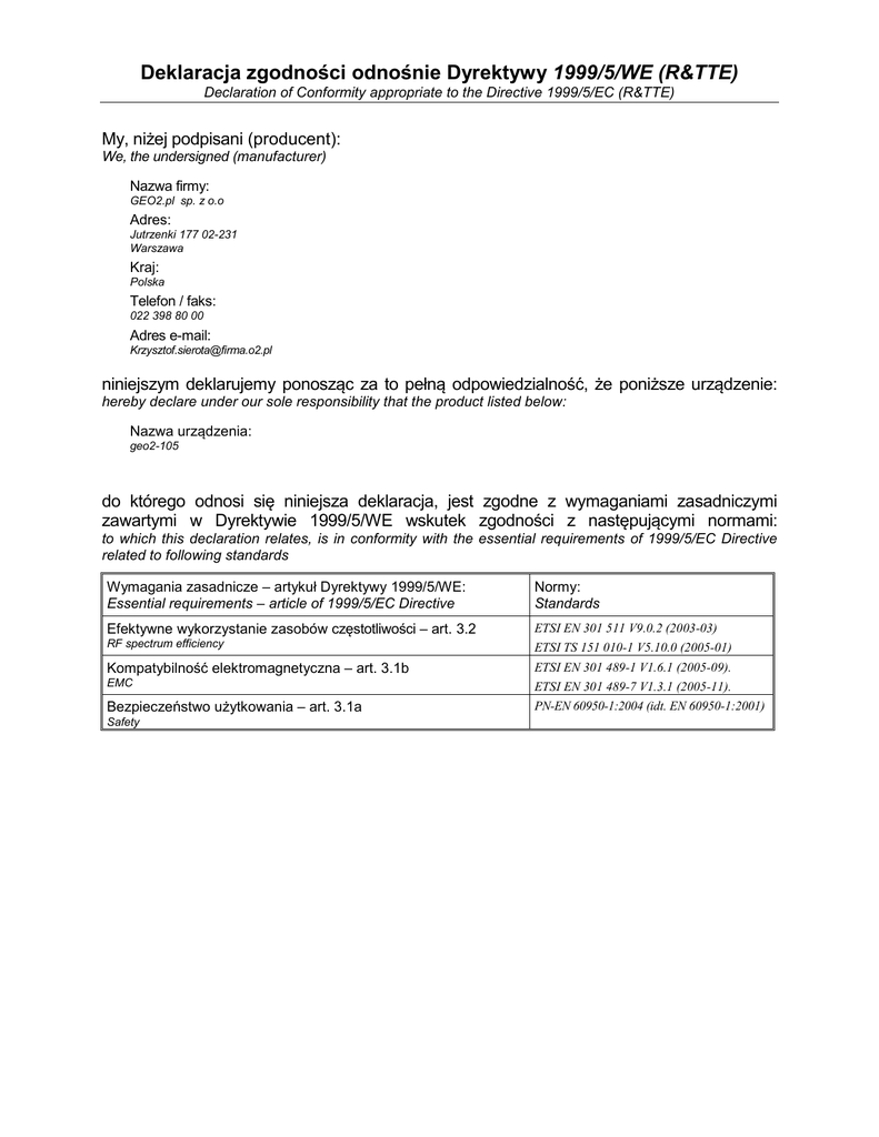 Deklaracja zgodności odnośnie Dyrektywy 1999/5/WE (R&TTE) Declaration of Conformity appropriate to the Directive 1999/5/EC (R&TTE) My, niżej podpisani (producent): We, the undersigned (manufacturer) Nazwa firmy: GEO2.pl sp. z o.o Adres: Jutrzenki 177 02-231 Warszawa Kraj: Polska Telefon / faks: 022 398 80 00 Adres e-mail: [email protected] niniejszym deklarujemy ponosząc za to pełną odpowiedzialność, że poniższe urządzenie: hereby declare under our sole responsibility that the product listed below: Nazwa urządzenia: geo2-105 do którego odnosi się niniejsza deklaracja, jest zgodne z wymaganiami zasadniczymi zawartymi w Dyrektywie 1999/5/WE wskutek zgodności z następującymi normami: to which this declaration relates, is in conformity with the essential requirements of 1999/5/EC Directive related to following standards Wymagania zasadnicze – artykuł Dyrektywy 1999/5/WE: Essential requirements – article of 1999/5/EC Directive Normy: Standards Efektywne wykorzystanie zasobów częstotliwości – art. 3.2 ETSI EN 301 511 V9.0.2 (2003-03) ETSI TS 151 010-1 V5.10.0 (2005-01) RF spectrum efficiency Kompatybilność elektromagnetyczna – art. 3.1b EMC ETSI EN 301 489-1 V1.6.1 (2005-09). ETSI EN 301 489-7 V1.3.1 (2005-11). Bezpieczeństwo użytkowania – art. 3.1a PN-EN 60950-1:2004 (idt. EN 60950-1:2001) Safety