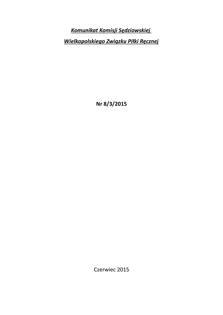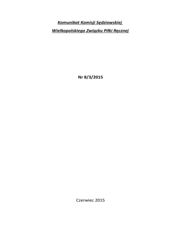 Komunikat Komisji Sędziowskiej Wielkopolskiego Związku Piłki Ręcznej Nr 8/3/2015 Czerwiec 2015 1. Komisja Sędziowska informuje, że coroczne Seminarium Sędziów ZPRP odbędzie się w terminie 28-30.08.2015r. Miejsce spotkania jest Olsztyn tak jak to miało miejsce w zeszłym roku. Osoby powołane otrzymały już maila od KS ZPRP ze szczegółami Seminarium. Prosimy pamiętać o potwierdzeniu obecności do dnia 25.06.2015 !!! 2. Przypominamy, iż wewnętrzny egzamin sprawdzający dla osób powołanych na Seminarium Sędziów ZPRP odbędzie się 07.08.2015r. o godz. 18.00 w Poznaniu na obiektach klubu sportowego WKS Grunwald ul. Promienista. Nie stawienie się lub nie zaliczenie egzaminu będzie się wiązało ze złożeniem wniosku do Kolegium Sędziów ZPRP o skreślenie danej osoby z listy powołanych. 3. Po przeanalizowaniu 2 ofert organizacji kursokonferencji które wpłynęły w terminie, Komisja Sędziowska uznała za najkorzystniejszą ofertę w Dymaczewie. W związku z powyższym nasze coroczna kursokonferencja odbędzie się w dniach 05–06.09.2015r. w Agro Hotelu (dawniej Lake Hotel) w Dymaczewie k/Stęszewa. Szczegółowy plan Okręgowej Kursokonferencji zostanie podany w terminie późniejszym. Jak co roku sędziowie zaliczać będą egzamin pisemny (test i szukanka) oraz biegowy Cooper – test (test biegowy odbędzie się w terenie a nie jak to miało miejsce w latach poprzednich na bieżni). Sędziowie pokrywają koszt okręgowej kursokonferencji w wysokości 70 złotych. Płatność ta nie zwalnia sędziów z uiszczenia opłaty na fundusz koleżeński zgodnie z zatwierdzonym Regulaminem Komisji Sędziowskiej WZPR §7 pkt.4 w wysokości : 40 zł sędziowie boiskowi, 25 zł sędziowie stolikowi. Dla osób z kursu sędziowskiego 2014, którzy pomyślnie ukończyli kurs w styczniu tego roku będzie to jego dokończenie – zaliczenie sprawdzianu pisemnego i biegowego. Natomiast dla osób, którym się nie powiodło istnieje możliwość podjęcia ponownej próby zaliczenia kursu sędziowskiego – w przypadku jakiś wątpliwości lub pytań prosimy o kontakt mailowy lub telefoniczny. Poniżej listwa sędziów WZPR i kandydatów powołanych na kursokonferencje 1 Andrzejczak Dariusz 2 Andrzejczak Monika 3 Baszczyński Mateusz 4 Bartkowiak Sylwia 5 Białas Ryszard 6 Białas-Duda Anna 7 Białyńska Magdalena 8 Brenk Piotr 9 Broda Mirosław 10 Cegła Maciej 11 Chudzicki Piotr 12 Cieślak Grzegorz 13 Cyraniak Łukasz 14 Czamański Jarosław 15 Duda Paweł 16 Dutkiewicz Krzysztof 17 Dutkiewicz Paweł 18 Draszkiewicz Tomasz 19 Frąckowiak Bronisław 20 Jakubek Michał 21 Kaliszewski Adam 22 Kaszuba Dominik 23 Kaszuba Jakub 24 Kąkolewski Tomasz 25 Konarczyk Miłosz 26 Kowalczyk Konrad 27 Kowalak Bartosz 28 Kowalak Dariusz 29 Kruszczak Marek 30 Krystkowiak Damian 31 Kuzia Adam 32 Lańska Marta 33 Lubczyński Mateusz 34 Łakomy Weronika 35 Maciejewski Dariusz 36 Maciejewski Piotr 37 Manyś Krzysztof 38 Marciniak Mariusz 39 Marciniak Wojciech 40 Matlach Mateusz 41 Matlach Zdzisław 42 Pałasz Karol 43 Piekarski Marcin 44 Pietruszka Agnieszka 45 Prymas Ewelina 46 Przekwas Michał 47 Przydryga Marcin 48 Radziszewski Piotr 49 Rura Iwona 50 Skrzelewski Robert 51 Spychała-Kozłowska Joanna 52 Staszkiewicz Łukasz 53 Szmania Jakub 54 Szudrowicz Bartłomiej 55 Śron Patryk 56 Tomczak Aleksandra 57 Tyc Marcin 58 Tyliński Mateusz 59 Westwal Krzysztof 60 Wieczorek Marek 61 Witt Michał 62 Wołowicz Mariusz 63 Białyńska Marta 64 Franaszek Adrian 65 Kosmowski Łukasz 66 Kramarek Michał 67 Kulczyński Patryk 68 Magdans Miłosz 69 Marcinkowski Mikołaj 70 Migdałek Piotr 71 Mikołajczak Agata 72 Mikuła Mateusz 73 Musiałowska Marta 74 Piątek Grzegorz 75 Pierzchała Honoriusz 76 Polguj Monika 77 Stachowiak Maja 78 Tuzel Wojciech 79 Urbański Marcel Wszyscy powołani sędziowie zobowiązani są do potwierdzenia swojej obecności w terminie do 30.06.2015r. !!! na adres mailowy komisji [email protected], gdyż łączy się to z zarezerwowaniem miejsc noclegowych. Wpłatę kosztów kursokonferencji w wysokości 70 zł należy dokonać do dnia 10.07.2015r !!!!. na konto referenta d/s obsad Komisji: Bartosz Kowalak, 60-158 Poznań ul. Keplera 6a/26 BZWBK 86 1090 1346 0000 0000 3406 1758. Nie potwierdzenie pobytu lub nie wpłacenie kosztów kursokonferencji w wyznaczonych terminach będzie łączyło się z nie ujęciem kolegów i koleżanek w wykazie sędziów na przyszły sezon. Komisja Sędziowska nie przewiduje drugiego terminu egzaminu !!! Składka funduszu koleżeńskiego pobierana będzie przed kursokonferencją w Dymaczewie. Przewodniczący Komisji Sędziowskiej Piotr Chudzicki