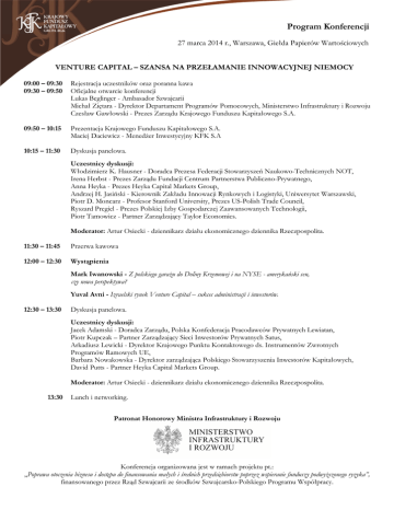 Program Konferencji 27 marca 2014 r., Warszawa, Giełda Papierów Wartościowych VENTURE CAPITAL – SZANSA NA PRZEŁAMANIE INNOWACYJNEJ NIEMOCY 09:00 – 09:30 09:30 – 09:50 Rejestracja uczestników oraz poranna kawa Oficjalne otwarcie konferencji Lukas Beglinger - Ambasador Szwajcarii Michał Ziętara - Dyrektor Departament Programów Pomocowych, Ministerstwo Infrastruktury i Rozwoju Czesław Gawłowski - Prezes Zarządu Krajowego Funduszu Kapitałowego S.A. 09:50 – 10:15 Prezentacja Krajowego Funduszu Kapitałowego S.A. Maciej Daciewicz - Menedżer Inwestycyjny KFK S.A 10:15 – 11:30 Dyskusja panelowa. Uczestnicy dyskusji: Włodzimierz K. Hausner - Doradca Prezesa Federacji Stowarzyszeń Naukowo-Technicznych NOT, Irena Herbst - Prezes Zarządu Fundacji Centrum Partnerstwa Publiczno-Prywatnego, Anna Heyka - Prezes Heyka Capital Markets Group, Andrzej H. Jasiński - Kierownik Zakładu Innowacji Rynkowych i Logistyki, Uniwersytet Warszawski, Piotr D. Moncarz - Profesor Stanford University, Prezes US-Polish Trade Council, Ryszard Pregiel - Prezes Polskiej Izby Gospodarczej Zaawansowanych Technologii, Piotr Tamowicz - Partner Zarządzający Taylor Economics. Moderator: Artur Osiecki - dziennikarz działu ekonomicznego dziennika Rzeczpospolita. 11:30 – 11:45 Przerwa kawowa 12:00 – 12:30 Wystąpienia Mark Iwanowski - Z polskiego garażu do Doliny Krzemowej i na NYSE - amerykański sen, czy nowa perspektywa? Yuval Avni - Izraelski rynek Venture Capital – sukces administracji i inwestorów. 12:30 – 13:30 Dyskusja panelowa. Uczestnicy dyskusji: Jacek Adamski - Doradca Zarządu, Polska Konfederacja Pracodawców Prywatnych Lewiatan, Piotr Kupczak – Partner Zarządzający Sieci Inwestorów Prywatnych Satus, Arkadiusz Lewicki - Dyrektor Krajowego Punktu Kontaktowego ds. Instrumentów Zwrotnych Programów Ramowych UE, Barbara Nowakowska - Dyrektor zarządzająca Polskiego Stowarzyszenia Inwestorów Kapitałowych, David Putts - Partner Heyka Capital Markets Group. Moderator: Artur Osiecki - dziennikarz działu ekonomicznego dziennika Rzeczpospolita. 13:30 Lunch i networking. Patronat Honorowy Ministra Infrastruktury i Rozwoju Konferencja organizowana jest w ramach projektu pt.: „Poprawa otoczenia biznesu i dostępu do finansowania małych i średnich przedsiębiorstw poprzez wspieranie funduszy podwyższonego ryzyka”, finansowanego przez Rząd Szwajcarii ze środków Szwajcarsko-Polskiego Programu Współpracy. VENTURE CAPITAL – SZANSA NA PRZEŁAMANIE INNOWACYJNEJ NIEMOCY Zagadnienia tematyczne do pierwszej dyskusji panelowej (godz. 10:15 – 11:30) • • • • Kto, lub co powoduje, że Polska pozostaje krajem o najniższych wydatkach na B+R w relacji do PKB w Europie? Co nas różni od krajów, w których rozwiązano problem wzrostu innowacyjności? Czy bariery regulacyjne wzrostu innowacyjności polskiej gospodarki istnieją, czy, gdyby ich nie było, coś by się w tej mierze zmieniło? Czy rola małych i średnich przedsiębiorców nie jest, w aspekcie rozwoju innowacyjności polskiej gospodarki, przeceniana? Zagadnienia tematyczne do drugiej dyskusji panelowej (godz. 12:30 – 13:30) • • • • Jaki jest wpływ instytucji wsparcia biznesu na pobudzanie działalności innowacyjnej przedsiębiorstw? Czy w Polsce istnieją fundusze Venture Capital, czy jest dla nich miejsce – rynek z dużym potencjałem? Czy możliwy jest rozwój innowacyjności polskiej gospodarki bez zaangażowania VC? Polska innowacyjna przez pryzmat doświadczeń funduszy. Co dają Polsce fundusze Venture Capital? Patronat Honorowy Ministra Infrastruktury i Rozwoju Konferencja organizowana jest w ramach projektu pt.: „Poprawa otoczenia biznesu i dostępu do finansowania małych i średnich przedsiębiorstw poprzez wspieranie funduszy podwyższonego ryzyka”, finansowanego przez Rząd Szwajcarii ze środków Szwajcarsko-Polskiego Programu Współpracy.