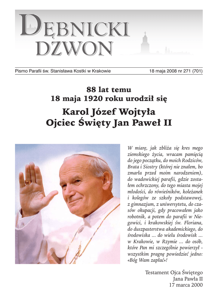 Pismo Parafii św. Stanisława Kostki w Krakowie 18 maja 2008 nr 271 (701) 88 lat temu 18 maja 1920 roku urodził się Karol Józef Wojtyła Ojciec Święty Jan Paweł II W miarę, jak zbliża się kres mego ziemskiego życia, wracam pamięcią do jego początku, do moich Rodziców, Brata i Siostry (której nie znałem, bo zmarła przed moim narodzeniem), do wadowickiej parafii, gdzie zostałem ochrzczony, do tego miasta mojej młodości, do rówieśników, koleżanek i kolegów ze szkoły podstawowej, z gimnazjum, z uniwersytetu, do czasów okupacji, gdy pracowałem jako robotnik, a potem do parafii w Niegowici, i krakowskiej św. Floriana, do duszpasterstwa akademickiego, do środowiska ... do wielu środowisk ... w Krakowie, w Rzymie ... do osób, które Pan mi szczególnie powierzył wszystkim pragnę powiedzieć jedno: «Bóg Wam zapłać»! Testament Ojca Świętego Jana Pawła II 17 marca 2000 Słowo Dla Życia Tak bowiem Bóg umiłował świat, że Syna swego Jednorodzonego dał, aby każdy, kto w Niego wierzy, nie zginął, ale miał życie wieczne. Albowiem Bóg nie posłał swego Syna na świat po to, aby świat potępił, ale po to, aby świat został przez Niego zbawiony. Kto wierzy w Niego, nie podlega potępieniu; a kto nie wierzy, już został potępiony, bo nie uwierzył w imię Jednorodzonego Syna Bożego. J 3, 16-18 Chwała Ojcu i Synowi i Duchowi Świętemu! Bóg Ojciec, Syn Boży i Duch Święty tak się miłują, że jest jeden Bóg w trzech Osobach. To jest największa tajemnica naszej wiary. Ich miłość jest tak wielka, że tworzą jedno. Prawdę tę objawił nam Pan Jezus. Mało tego! Pan Bóg nie ograniczył tej miłości jedynie do Przenajświętszej Trójcy. On tak bardzo umiłował ludzi i świat, że posłał swego Syna, aby wszyscy mogli cieszyć się Bożą radością. Pan Bóg nieustannie okazuje swą miłość do całego stworzenia, ale takim najważniejszym momentem było posłanie Syna na świat, aby dokonać naszego odkupienia. Dzięki Bożej miłości żyjemy i możemy być przyjaciółmi Pana Jezusa. Możemy korzystać z sakramentów świętych, aby napełniać się tą miłością. Człowiek, który wierzy Chrystusowi i stara się wypełniać Jego naukę, stara się kochać Pana Boga i ludzi, sprawia wielką radość całej Przenajświętszej Trójcy. Codziennie oddajemy cześć Najświętszej Trójcy, chociażby z uwagą czyniąc znak krzyża świętego, ale w dniu dzisiejszym pragniemy w szczególny sposób podziękować Bogu Ojcu, Synowi i Duchowi Świętemu za miłość do wszystkich ludzi. Z większym, więc niż zwykle zaangażowaniem starajmy się czynić to, co Panu Bogu sprawi radość. A przede wszystkim z całego serca oddawajmy chwałę Bogu w Trójcy Jedynemu. Ks. Robert Wróblewski SDB DLA RODZICÓW: 12 ŻELAZNYCH REGUŁ WYCHOWAWCZYCH (CZ. III) 1. Nie wydawajcie dzieciom nieprzemyślanych poleceń. Nie wolno ich też co chwila zmieniać, aby dziecko nie spostrzegło, że nakazy i zakazy zależą wyłącznie od chwilowych humorów czy nastrojów. 2. Nigdy nie wyróżniajcie żadnego z dzieci, lecz wszystkie traktujcie sprawiedliwie. 3. Nie bądźcie rodzicami, którzy wszystko wykonują za dzieci, ale stawiajcie im słuszne wymagania i powoli wdrażajcie do samodzielnej pracy. 4. Bądźcie tacy, jakimi chcielibyście widzieć wasze dzieci. cdn. XVII MIĘDZYNARODOWA PIESZA PIELGRZYMKA SUWAŁKI – WILNO 15 LIPCA – 26 LIPCA 2007 R. D zień trzeci rozpoczyna trębacz, (kto budzi trębacza?) o godzinie takiej jak wczoraj oraz piękne słońce. „Powołanie do małżeństwa i życia w rodzinie” to temat dnia. Słowem dnia – Mt 19,6 „Co więc Bóg złączył, niech człowiek nie rozdziela”. Tajemnica Różańca: Narodzenie. Modlitwą w obecności biskupa Sławoja Głodzia, kapelana służb celnych, rozpoczynamy drogę w stronę Ogrodnik i granicy z Litwą. Przejście jest szybkie i sprawne (nikogo nie zatrzymano), okazanie z marszu identyfikatorów, paszportów lub dowodów osobistych i już Litwa. Przesuwamy zegarki o godzinę. Większość z nas traci zasięg sieci komórkowych. Jest równie pięknie: nadal lasy i jeziora. Atmosfera rewelacyjna, godna polecenia wszystkim tym, którzy cały rok uganiają się za kasą, żyją w ciągłym stresie, ogłupiani przez media. Codziennie w smrodzie i w korkach na drodze. My również na drodze, lecz jakże inaczej. Idziemy, każdy ze swoimi intencjami, a Matka czuwa, abyśmy wykonali wszystkie nasze postanowienia. Dochodzimy do miejsca dzisiejszej Eucharystii, obok drewnianego kościółka 3 PIESZA PIELGRZYMKA SUWAŁKI – WILNO leży miejscowość Sventezeris. Tutaj planowany jest dłuższy postój i zupa na obiad. Jest godzina 13.00, żar się leje z nieba. Niektórzy nie wytrzymują upałów, służby maltańskie muszą udzielać pomocy. W obstawie medycznej, do dyspozycji 2 karetki. Dzisiaj mamy jeden z dłuższych etapów, dlatego dochodzimy do miejsca noclegu w późnych godzinach, mocno zmęczeni. Jak musi się czuć nasz przewodnik, który cały czas do nas przemawia, poprzez konferencje, modlitwę oraz pieśni. Trudno też porównać nasze jasne, przewiewne stroje, z jego czarną sutanną. On nie tylko interesuje się stanowiskiem dowodzenia - tam gdzie mikrofon, lecz również widać go na końcu „złotych” (spowiadającego pątników przyp. red.). Podsumowaniem dnia są: modlitwa i komunikaty kwatermistrza, zazwyczaj 4 niezbyt miłe. Na naszym biwaku, zorganizowanym dzisiaj na boisku piłkarskim, potrzebna jest miednica. Każdy z nas takową, podpisaną, posiada (jadą na ciężarówce). Dzisiaj woda do mycia jest racjonowana. Jest to miejscowość Seirijai. Śpimy po jednej stronie drogi, a po drugiej jest woda. Po stronie wody również nasze kuchnie, które wieczorami i rankami serwują kawę, herbatę i miętę. Przejście jest podziemne pod drogą. Cisza nocna obowiązuje od 22.00, mimo cofnięcia czasu (jest jeszcze jasno). …ta pielgrzymka była dla mnie najtrud