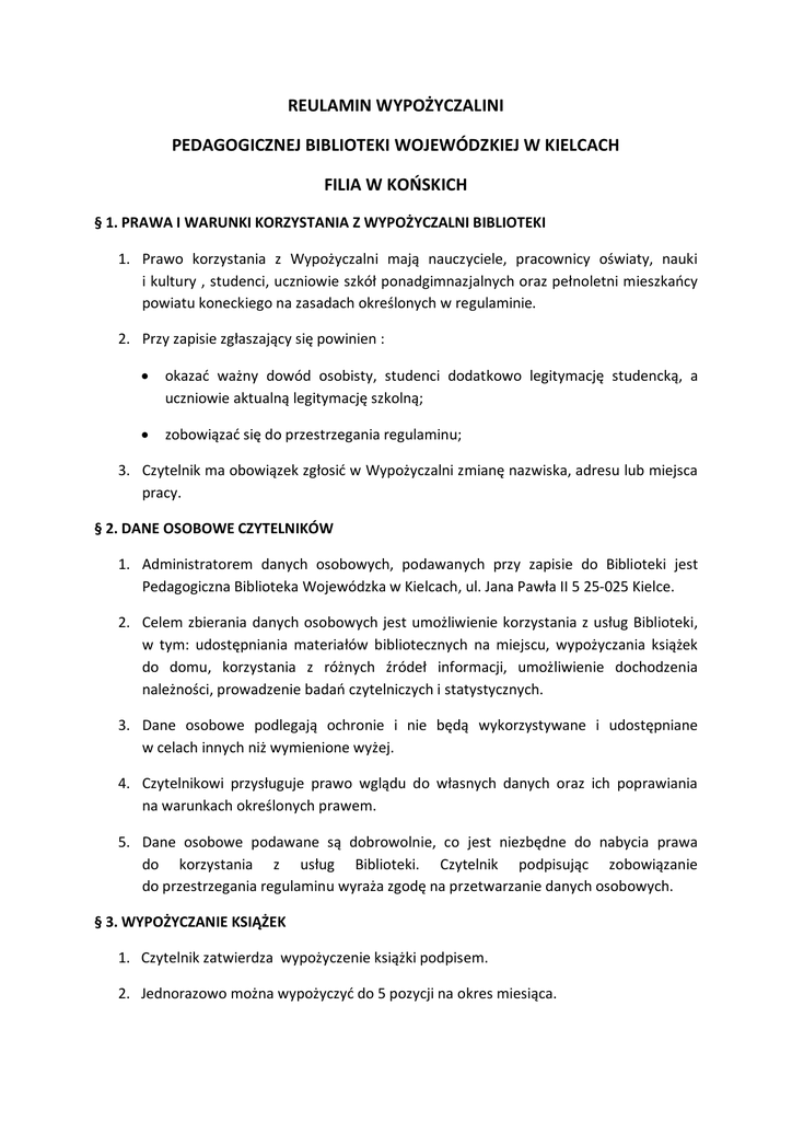 REULAMIN WYPOŻYCZALINI PEDAGOGICZNEJ BIBLIOTEKI WOJEWÓDZKIEJ W KIELCACH FILIA W KOŃSKICH § 1. PRAWA I WARUNKI KORZYSTANIA Z WYPOŻYCZALNI BIBLIOTEKI 1. Prawo korzystania z Wypożyczalni mają nauczyciele, pracownicy oświaty, nauki i kultury , studenci, uczniowie szkół ponadgimnazjalnych oraz pełnoletni mieszkańcy powiatu koneckiego na zasadach określonych w regulaminie. 2. Przy zapisie zgłaszający się powinien : okazać ważny dowód osobisty, studenci dodatkowo legitymację studencką, a uczniowie aktualną legitymację szkolną; zobowiązać się do przestrzegania regulaminu; 3. Czytelnik ma obowiązek zgłosić w Wypożyczalni zmianę nazwiska, adresu lub miejsca pracy. § 2. DANE OSOBOWE CZYTELNIKÓW 1. Administratorem danych osobowych, podawanych przy zapisie do Biblioteki jest Pedagogiczna Biblioteka Wojewódzka w Kielcach, ul. Jana Pawła II 5 25-025 Kielce. 2. Celem zbierania danych osobowych jest umożliwienie korzystania z usług Biblioteki, w tym: udostępniania materiałów bibliotecznych na miejscu, wypożyczania książek do domu, korzystania z różnych źródeł informacji, umożliwienie dochodzenia należności, prowadzenie badań czytelniczych i statystycznych. 3. Dane osobowe podlegają ochronie i nie będą wykorzystywane i udostępniane w celach innych niż wymienione wyżej. 4. Czytelnikowi przysługuje prawo wglądu do własnych danych oraz ich poprawiania na warunkach określonych prawem. 5. Dane osobowe podawane są dobrowolnie, co jest niezbędne do nabycia prawa do korzystania z usług Biblioteki. Czytelnik podpisując zobowiązanie do przestrzegania regulaminu wyraża zgodę na przetwarzanie danych osobowych. § 3. WYPOŻYCZANIE KSIĄŻEK 1. Czytelnik zatwierdza wypożyczenie książki podpisem. 2. Jednorazowo można wypożyczyć do 5 pozycji na okres miesiąca. 3. Czytelnik możne przedłużyć termin zwrotu wypożyczonych pozycji, jeżeli nie ma zapotrzebowania na nie ze strony innych korzystających z wypożyczalni. 4. Na życzenie czytelnika Wypożyczalnia sprowadza książki z innych bibliotek w kraju. Koszt zwrotu książek pokrywa wypożyczający. § 4. PRZETRZYMYWANIE KSIĄŻEK 1. Czytelnik zobowiązany jest do przestrzegania terminu zwrotu wypożyczonych pozycji. 2. Czytelnik, który nie zwraca w terminie wypożyczonych książek, otrzymuje pisemne lub telefoniczne upomnienia, w uzasadnionych przypadkach pokrywa koszty upomnienia. 3. Bibliotekarz może odmówić czasowego prawa korzystania z wypożyczalni czytelnikowi, który przetrzymuje wypożyczone książki. 4. Za przetrzymanie książek pobierana jest kara w wysokości 1 zł od woluminu za każdy rozpoczęty miesiąc po terminie zwrotu. Warunkiem naliczania kary jest oddanie książki przez czytelnika. Oprócz oddania lub odkupienia właściwej książki należy uregulować wyliczoną karę. 5. Zarówno nieoddanie książki jak i odmowa uiszczenia kary powoduje pozbawienie czytelnika możliwości korzystania z wypożyczania do czasu uregulowania należności. 6. Czytelnik może zwrócić się na piśmie do Dyrekcji PBW w Kielcach z prośbą o rozłożenie na raty w uzgodnionym terminie naliczonej kary lub o wyznaczenie książek , które ma zakupić w ramach wyliczonej kwoty. Czytelnik może wpłacać karę bezpośrednio w Wypożyczalni lub na rachunek bankowy PBW w Kielcach. 7. W przypadku, gdy mimo upomnień czytelnik odmawia zwrotu książek lub wpłacenia należnych opłat, Pedagogiczna Biblioteka Wojewódzka w Kielcach dochodzi swych roszczeń na drodze sądowej. Biblioteka może w tym celu upoważnić wyspecjalizowaną firmę windykacyjną. § 5. POSZANOWANIE KSIĄŻEK 1. Czytelnik powinien szanować wypożyczone książki. 2. Obowiązkiem czytelnika jest zwrócenie uwagi na stan książki przed jej wypożyczeniem i zgłoszenie ewentualnych braków bibliotekarzowi. § 6. ZAGUBIENIE, ZNISZCZENIE LUB USZKODZENIE KSIĄŻEK 1. Czytelnik odpowiada materialnie za wypożyczoną książkę. 2. W przypadku zagubienia lub zniszczenia książki, czytelnik zobowiązany jest do jej odkupienia. § 7. WYPOŻYCZANIE DOKUMENTÓW MULTIMEDIALNYCH DOSTĘPNYCH W WYPOŻYCZALNI 1. Wykaz dokumentów multimedialnych znajduje się w katalogu on-line dostępnym na stronie internetowej PBW Kielce, zakładka Filia Końskie. 2. Z dokumentów multimedialnych mogą korzystać wszyscy czytelnicy uprawnieni do korzystania z wypożyczalni Biblioteki. 3. Czytelnik ma prawo do nieodpłatnego korzystania z dokumentów multimedialnych. 4. Z dokumentów multimedialnych czytelnik może korzystać na miejscu w Bibliotece, w pracowni ICIM. 5. Na zewnątrz nauczyciel może jednorazowo wypożyczyć 5 egzemplarzy ze zbiorów multimedialnych a pozostali czytelnicy 3 egzemplarz w/w zbiorów. 6. Dokumenty multimedialne wypożyczane są na zewnątrz na okres 2 tygodni. W uzasadnionych przypadkach istnieje możliwość wydłużenia okresu wypożyczenia. 7. Obowiązkiem czytelnika jest uprzedzenie o niezamierzonym opóźnieniu w zwrocie wypożyczonych zbiorów. 8. W przypadku niedotrzymania terminu zwrotu wypożyczonych dokumentów, bibliotekarz ma obowiązek telefonicznego i listownego monitowania przetrzymywanych zbiorów. Koszty korespondencji pokrywa czytelnik. 9. Obowiązkiem czytelnika jest zgłaszanie wszelkich wad fabrycznych, uszkodzeń mechanicznych, a także złej jakości nagrań na wypożyczonych zbiorach. W przeciwnym razie czytelnik ponosi finansową odpowiedzialność za ewentualne uszkodzenia zauważone przez bibliotekarza lub zgłoszone przez osobę, która w następnej kolejności wypożyczyła uszkodzone wydawnictwo. 10. Za szkody wynikłe za zagubienia, zniszczenia lub uszkodzenia zbiorów multimedialnych odpowiada czytelnik, którego obowiązkiem jest odkupienie identycznego wydawnictwa. Regulamin obowiązuje od dnia 01.10.2011r. (aktualizacja 01.07.2015r.) Podstawa prawna: Statut Pedagogicznej Biblioteki Wojewódzkiej w Kielcach Dyrektor PBW Urszula Salwa