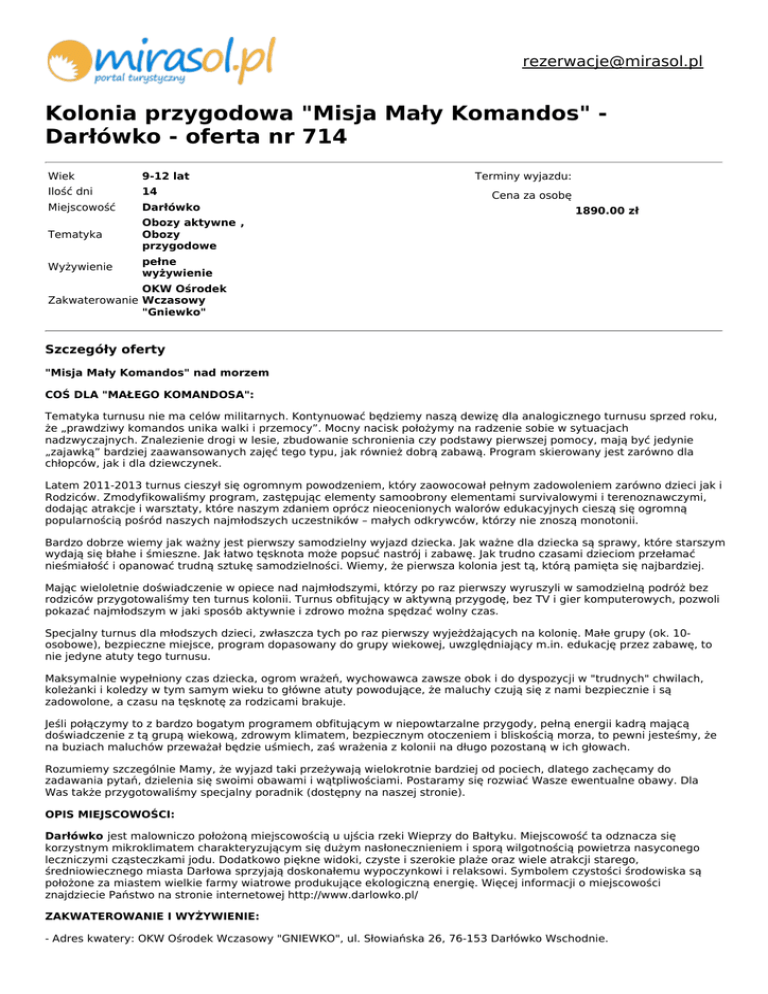 [email protected] Kolonia przygodowa "Misja Mały Komandos" Darłówko - oferta nr 714 Wiek 9-12 lat Ilość dni 14 Miejscowość Darłówko Tematyka Obozy aktywne , Obozy przygodowe Wyżywienie pełne wyżywienie Terminy wyjazdu: Cena za osobę 1890.00 zł OKW Ośrodek Zakwaterowanie Wczasowy "Gniewko" Szczegóły oferty "Misja Mały Komandos" nad morzem COŚ DLA "MAŁEGO KOMANDOSA": Tematyka turnusu nie ma celów militarnych. Kontynuować będziemy naszą dewizę dla analogicznego turnusu sprzed roku, że „prawdziwy komandos unika walki i przemocy”. Mocny nacisk położymy na radzenie sobie w sytuacjach nadzwyczajnych. Znalezienie drogi w lesie, zbudowanie schronienia czy podstawy pierwszej pomocy, mają być jedynie „zajawką” bardziej zaawansowanych zajęć tego typu, jak również dobrą zabawą. Program skierowany jest zarówno dla chłopców, jak i dla dziewczynek. Latem 2011-2013 turnus cieszył się ogromnym powodzeniem, który zaowocował pełnym zadowoleniem zarówno dzieci jak i Rodziców. Zmodyfikowaliśmy program, zastępując elementy samoobrony elementami survivalowymi i terenoznawczymi, dodając atrakcje i warsztaty, które naszym zdaniem oprócz nieocenionych walorów edukacyjnych cieszą się ogromną popularnością pośród naszych najmłodszych uczestników – małych odkrywców, którzy nie znoszą monotonii. Bardzo dobrze wiemy jak ważny jest pierwszy samodzielny wyjazd dziecka. Jak ważne dla dziecka są sprawy, które starszym wydają się błahe i śmieszne. Jak łatwo tęsknota może popsuć nastrój i zabawę. Jak trudno czasami dzieciom przełamać nieśmiałość i opanować trudną sztukę samodzielności. Wiemy, że pierwsza kolonia jest tą, którą pamięta się najbardziej. Mając wieloletnie doświadczenie w opiece nad najmłodszymi, którzy po raz pierwszy wyruszyli w samodzielną podróż bez rodziców przygotowaliśmy ten turnus kolonii. Turnus obfitujący w aktywną przygodę, bez TV i gier komputerowych, pozwoli pokazać najmłodszym w jaki sposób aktywnie i zdrowo można spędzać wolny czas. Specjalny turnus dla młodszych dzieci, zwłaszcza tych po raz pierwszy wyjeżdżających na kolonię. Małe grupy (ok. 10osobowe), bezpieczne miejsce, program dopasowany do grupy wiekowej, uwzględniający m.in. edukację przez zabawę, to nie jedyne atuty tego turnusu. Maksymalnie wypełniony czas dziecka, ogrom wrażeń, wychowawca zawsze obok i do dyspozycji w "trudnych" chwilach, koleżanki i koledzy w tym samym wieku to główne atuty powodujące, że maluchy czują się z nami bezpiecznie i są zadowolone, a czasu na tęsknotę za rodzicami brakuje. Jeśli połączymy to z bardzo bogatym programem obfitującym w niepowtarzalne przygody, pełną energii kadrą mającą doświadczenie z tą grupą wiekową, zdrowym klimatem, bezpiecznym otoczeniem i bliskością morza, to pewni jesteśmy, że na buziach maluchów przeważał będzie uśmiech, zaś wrażenia z kolonii na długo pozostaną w ich głowach. Rozumiemy szczególnie Mamy, że wyjazd taki przeżywają wielokrotnie bardziej od pociech, dlatego zachęcamy do zadawania pytań, dzielenia się swoimi obawami i wątpliwościami. Postaramy się rozwiać Wasze ewentualne obawy. Dla Was także przygotowaliśmy specjalny poradnik (dostępny na naszej stronie). OPIS MIEJSCOWOŚCI: Darłówko jest malowniczo położoną miejscowością u ujścia rzeki Wieprzy do Bałtyku. Miejscowość ta odznacza się korzystnym mikroklimatem charakteryzującym się dużym nasłonecznieniem i sporą wilgotnością powietrza nasyconego leczniczymi cząsteczkami jodu. Dodatkowo piękne widoki, czyste i szerokie plaże oraz wiele atrakcji starego, średniowiecznego miasta Darłowa sprzyjają doskonałemu wypoczynkowi i relaksowi. Symbolem czystości środowiska są położone za miastem wielkie farmy wiatrowe produkujące ekologiczną energię. Więcej informacji o miejscowości znajdziecie Państwo na stronie internetowej http://www.darlowko.pl/ ZAKWATEROWANIE I WYŻYWIENIE: - Adres kwatery: OKW Ośrodek Wczasowy "GNIEWKO", ul. Słowiańska 26, 76-153 Darłówko Wschodnie. - OKW Ośrodek Wczasowy "GNIEWKO" znajduje się w bezpośrednim sąsiedztwie morza, tuż przy zejściu na plażę. Ośrodek jest ogrodzony oraz monitorowany. - Uczestnicy będą mieszkać w pokojach 3-6 osobowych z pełnym węzłem sanitarnym. - Posiłki 3 razy dziennie w stołówce Ośrodka + podwieczorek. Niejadków mamy na oku i pilnujemy, aby zawsze byli najedzeni. - Na terenie Ośrodka znajdują się boiska do piłki nożnej, siatkówki oraz koszykówki, kryty basen i plac zabaw dla dzieci. Do naszej dyspozycji są również stoły do piłkarzyków, ping-ponga, sala gimnastyczna, świetlice i sale warsztatowe. KADRA: Grupy pod opieką sprawdzonych przez nas wychowawców mających doświadczenie w pracy z najmłodszymi. Na terenie Ośrodka jest zapewniona całodobowa opieka medyczna do dyspozycji kolonii przez całą dobę. W czasie zajęć nad wodą zapewniony nadzór i opieka ratowników WOPR. Zajęcia z gimnastyki korekcyjnej oraz inhalacje prowadzone przez doświadczonych rehabilitantów. PROGRAM: - „MAŁY KOMANDOS” - czyli cykl zajęć tematycznych, w tym m.in.: - rozróżnianie kierunków w terenie oraz radzenie sobie w przypadku zgubienia się, - „poszukiwacz min”, czyli zabawa z wykorzystaniem wykrywaczy metalu, - marsz na azymut, czyli potrafimy korzystać z mapy i kompasu, - budowa szałasu w terenie, - maskowanie, kamuflaż w terenie oraz wykorzystanie maskowania w grze „mały komandos”, - podstawy pierwszej pomocy (jak się zachować, co zrobić, itp.), - „nie boimy się ciemności”, czyli bezpieczna nocna wyprawa z wykorzystaniem noktowizora i świateł chemicznych. - FABULARNA GRA TERENOWA "Hobbit czyli tam i z powrotem" w wiosce Hobbitów: - Tajemnicza wyprawa śladami Bilbo Bagginsa; - Pokazy sztuki kowalskiej w Kuźni Krasnoludów; - Palantir,czyli poznanie Świata Śródziemia; - Hobbickie gry i zabawy. - 