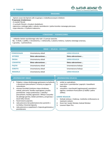 III TYDZIEŃ ŚNIADANIE: - Apinat cacao lub Apinat cafe na gorąco z niskotłuszczowym mlekiem Propozycje śniadaniowe: - 6 ciastek Fibroki - 2 sucharki Fibroki z chudymi dodatkami. - jajecznica z jednego jajka z cebulą i pomidorem i jedna kromka razowego pieczywa. - zupa mleczna z 2 łyżkami makaronu. II ŚNIADANIE I PODWIECZOREK: - szklanka świeżo wyciskanego soku lub 1-2 porcje owoców. Np.: 3 śliwki, 1 jabłko, 1 brzoskwinia, 1 nektarynka, 2 plastry melona, 2 plastry świeżego ananasa, 1 gruszka, 1 pomaraocza. OBIAD I KOLACJA – SCHEMAT: PONIEDZIAŁEK Urozmaicony obiad LEKKA KOLACJA WTOREK Dieta uderzeniowa … Dieta uderzeniowa … ŚRODA Urozmaicony obiad LEKKA KOLACJA CZWARTEK Dieta uderzeniowa … Dieta uderzeniowa … PIĄTEK Urozmaicony obiad Urozmaicona kolacja SOBOTA Urozmaicony obiad Urozmaicona kolacja NIEDZIELA Urozmaicony obiad LEKKA KOLACJA UROZMAICONY OBIAD: UROZMAICONA KOLACJA: 1. 1. 2. 2. 3. 4. 5. Pulpety z mięsa drobiowego gotowane na bulionie z duszonymi pieczarkami Z mizerią na jogurcie naturalnym. zimowy kociołek (mielone mięso drobiowe, cebula, pieczarki, fasolka szparagowa, puszka pomidorów- mięso podsmażyd z cebulką i pieczarkami, fasolkę ugotowad. Włożyd wszystko do jednego garnka, dodad pomidory, przyprawy i dusid kilka minut). faszerowana papryka. ryba pieczona lub podsmażona bez panierki z surówką z kiszonej kapusty. ryba pieczona w papilotach z kapustą gotowaną z pomidorami. 3. omlet ze szpinakiem. zupa krem z pomidorów i papryki z kawałkami kurczaka. smoothie z marchewki (ugotowanej), pomidora i ogórka z omletem francuskim (2 białka i jedno żółtko). LEKKIE KOLACJE: 1. 2. 3. Koktajl ziołowy z Vadessą- maślanka zmiksowana ze świeżymi ziołami. Krem lub budyo Slimbel, Koktail Slimbel. Levanat Hiper Pro.