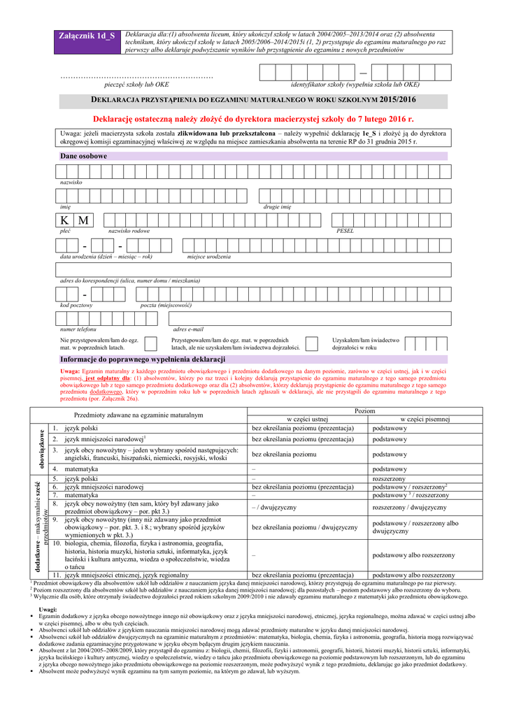 Deklaracja dla:(1) absolwenta liceum, który ukończył szkołę w latach 2004/2005–2013/2014 oraz (2) absolwenta technikum, który ukończył szkołę w latach 2005/2006–2014/2015i (1, 2) przystępuje do egzaminu maturalnego po raz pierwszy albo deklaruje podwyższanie wyników lub przystąpienie do egzaminu z nowych przedmiotów Załącznik 1d_S – …………………………………………………… pieczęć szkoły lub OKE identyfikator szkoły (wypełnia szkoła lub OKE) DEKLARACJA PRZYSTĄPIENIA DO EGZAMINU MATURALNEGO W ROKU SZKOLNYM 2015/2016 Deklarację ostateczną należy złożyć do dyrektora macierzystej szkoły do 7 lutego 2016 r. Uwaga: jeżeli macierzysta szkoła została zlikwidowana lub przekształcona – należy wypełnić deklarację 1e_S i złożyć ją do dyrektora okręgowej komisji egzaminacyjnej właściwej ze względu na miejsce zamieszkania absolwenta na terenie RP do 31 grudnia 2015 r. Dane osobowe nazwisko drugie imię imię K M płeć nazwisko rodowe - PESEL - data urodzenia (dzień – miesiąc – rok) miejsce urodzenia adres do korespondencji (ulica, numer domu / mieszkania) kod pocztowy poczta (miejscowość) numer telefonu Nie przystępowałem/łam do egz. mat. w poprzednich latach. adres e-mail Przystępowałem/łam do egz. mat. w poprzednich latach, ale nie uzyskałem/łam świadectwa dojrzałości. Uzyskałem/łam świadectwo dojrzałości w roku Informacje do poprawnego wypełnienia deklaracji Uwaga: Egzamin maturalny z każdego przedmiotu obowiązkowego i przedmiotu dodatkowego na danym poziomie, zarówno w części ustnej, jak i w części pisemnej, jest odpłatny dla: (1) absolwentów, którzy po raz trzeci i kolejny deklarują przystąpienie do egzaminu maturalnego z tego samego przedmiotu obowiązkowego lub z tego samego przedmiotu dodatkowego oraz dla (2) absolwentów, którzy deklarują przystąpienie do egzaminu maturalnego z tego samego przedmiotu dodatkowego, który w poprzednim roku lub w poprzednich latach zgłaszali w deklaracji, ale nie przystąpili do egzaminu maturalnego z tego przedmiotu (por. Załącznik 26a). dodatkowe – maksymalnie sześć przedmiotów obowiązkowe Przedmioty zdawane na egzaminie maturalnym Poziom 1. język polski w części ustnej bez określania poziomu (prezentacja) 2. język mniejszości narodowej 1 bez określania poziomu (prezentacja) podstawowy 3. język obcy nowożytny – jeden wybrany spośród następujących: angielski, francuski, hiszpański, niemiecki, rosyjski, włoski bez określania poziomu podstawowy – – bez określania poziomu (prezentacja) – podstawowy rozszerzony podstawowy / rozszerzony2 podstawowy 3 / rozszerzony – / dwujęzyczny rozszerzony / dwujęzyczny bez określania poziomu / dwujęzyczny podstawowy / rozszerzony albo dwujęzyczny – podstawowy albo rozszerzony bez określania poziomu (prezentacja) podstawowy albo rozszerzony 4. 5. 6. 7. 8. matematyka język polski język mniejszości narodowej matematyka język obcy nowożytny (ten sam, który był zdawany jako przedmiot obowiązkowy – por. pkt 3.) 9. język obcy nowożytny (inny niż zdawany jako przedmiot obowiązkowy – por. pkt. 3. i 8.; wybrany spośród języków wymienionych w pkt. 3.) 10. biologia, chemia, filozofia, fizyka i astronomia, geografia, historia, historia muzyki, historia sztuki, informatyka, język łaciński i kultura antyczna, wiedza o społeczeństwie, wiedza o tańcu 11. język mniejszości etnicznej, język regionalny w części pisemnej podstawowy Przedmiot obowiązkowy dla absolwentów szkół lub oddziałów z nauczaniem języka danej mniejszości narodowej, którzy przystępują do egzaminu maturalnego po raz pierwszy. 2 Poziom rozszerzony dla absolwentów szkół lub oddziałów z nauczaniem języka danej mniejszości narodowej; dla pozostałych – poziom podstawowy albo rozszerzony do wyboru. 3 Wyłącznie dla osób, które otrzymały świadectwo dojrzałości przed rokiem szkolnym 2009/2010 i nie zdawały egzaminu maturalnego z matematyki jako przedmiotu obowiązkowego. 1 Uwagi: Egzamin dodatkowy z języka obcego nowożytnego innego niż obowiązkowy oraz z języka mniejszości narodowej, etnicznej, języka regionalnego, można zdawać w części ustnej albo w części pisemnej, albo w obu tych częściach. Absolwenci szkół lub oddziałów z językiem nauczania mniejszości narodowej mogą zdawać przedmioty maturalne w języku danej mniejszości narodowej. Absolwenci szkół lub oddziałów dwujęzycznych na egzaminie maturalnym z przedmiotów: matematyka, biologia, chemia, fizyka i astronomia, geografia, historia mogą rozwiązywać dodatkowe zadania egzaminacyjne przygotowane w języku obcym będącym drugim językiem nauczania. Absolwent z lat 2004/2005–2008/2009, który przystąpił do egzaminu z: biologii, chemii, filozofii, fizyki i astronomii, geografii, historii, historii muzyki, historii sztu ki, informatyki, języka łacińskiego i kultury antycznej, wiedzy o społeczeństwie, wiedzy o tańcu jako przedmiotu obowiązkowego na poziomie podstawowym lub rozszerzonym, lub do egzaminu z języka obcego nowożytnego jako przedmiotu obowiązkowego na poziomie rozszerzonym, może podwyższyć wynik z tego przedmiotu, deklarując go jako przedmiot dodatkowy. Absolwent może podwyższyć wynik egzaminu na tym samym poziomie, na którym go zdawał, lub wyższym. Załącznik 1d_S Deklaracja dla:(1) absolwenta liceum, który ukończył szkołę w latach 2004/2005–2013/2014 oraz (2) absolwenta technikum, który ukończył szkołę w latach 2005/2006–2014/2015i (1, 2) przystępuje do egzaminu maturalnego po raz pierwszy albo deklaruje podwyższanie wyników lub przystąpienie do egzaminu z nowych przedmiotów 1. Deklaruję przystąpienie do egzaminów obowiązkowych z następujących przedmiotów (wpisać znak X w odpowiednie kratki): w części pisemnej w części ustnej język polski 1.1. Temat prezentacji: ……………………………………………………