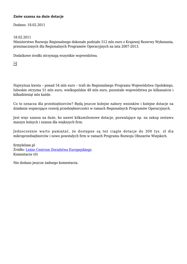 Znów szansa na duże dotacje Dodano: 18.02.2011 18.02.2011 Ministerstwo Rozwoju Regionalnego dokonało podziału 512 mln euro z Krajowej Rezerwy Wykonania, przeznaczonych dla Regionalnych Programów Operacyjnych na lata 2007-2013. Dodatkowe środki otrzymają wszystkie województwa. Najwyższa kwota – ponad 54 mln euro – trafi do Regionalnego Programu Województwa Opolskiego, lubuskie otrzyma 51 mln euro, wielkopolskie 48 mln euro, pozostałe województwa po kilkanaście i kilkadziesiąt mln każde. Co to oznacza dla przedsiębiorców? Będą jeszcze kolejne nabory wniosków i kolejne dotacje na działania wspierające rozwój przedsiębiorczości w ramach Regionalnych Programów Operacyjnych. Jest więc szansa na duże, bo nawet kilkumilionowe dotacje, pozwalające np. na zakup zestawu maszyn leśnych i szansa dla większych firm. Jednocześnie warto pamiętać, że dostępne są też ciągle dotacje do 300 tys. zł dla mikroprzedsiębiorców i nowo powstałych firm w ramach Programu Rozwoju Obszarów Wiejskich. firmylelsne.pl Źródło: Leśne Centrum Doradztwa Europejskiego Komentarze (0) Nie dodano jeszcze żadnego komentarza.