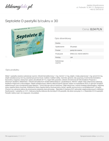 Apteka Współczesna ul. Podwale 15, 85-111 Bydgoszcz +48 52 345 65 81 Septolete D pastylki b/cukru x 30 Cena: 8,04 PLN Opis słownikowy Dawka - Opakowanie 30 pastyl. Postać pastyl.do ssania Producent KRKA D.D. NOVO MESTO Rodzaj Lek Substancja czynna - Opis produktu Skład 1 pastylka zawiera substancje czynne: chlorek benzalkoniowy 1 mg, mentol 1,2 mg, olejek z mięty pieprzowej 1 mg, tymol 0.6 mg, olejek eukaliptusowy 0,6 mg substancje pomocnicze: maltitol, maltitol ciekły, mannitol, glicerol, olej rycynowy, krzemionka koloidalna bezwodna, magnezu stearynian, tytanu dwutlenek (E171), Capol 600, powidon, żółcień chinolinowa (E104) Działanie Preparat o złożonym działaniu składników. Chlorek benzalkonium działa bakteriobójczo i grzybobójczo. Mentol i olejek mięty pieprzowej wykazują działanie miejscowo znieczulające. Olejek eukaliptusowy ułatwia odkrztuszanie poprzez wpływ na wydzielanie śluzu w górnych drogach oddechowych oraz zmniejszenie jego lepkości. Tymol hamuje odruch kaszlowy. Olejki eteryczne i mentol działają odświeżająco i łagodzą stany zapalne błony śluzowej. Wskazania Stany zapalne błony śluzowej jamy ustnej i gardła, pomocniczo w przeziębieniach i chrypce. Chorym na cukrzycę zaleca się stosowanie preparatu bezcukrowego - Septolete D (zawiera 0,07 jednostek węglowodanowych maltitolu). Dawkowanie 1 pastylka co 2-3 h. Zalecana dawka dobowa dla dorosłych 6-8 pastylek, dla dzieci powyżej 4 r.ż. (Septolete D) 4-6 pastylek. Pastylki należy ssać; nie rozgryzać, nie połykać. Plik wygenerowano: 07-03-2017 Powered by TCPDF (www.tcpdf.org) Oprogramowanie sklepu: AptusShop
