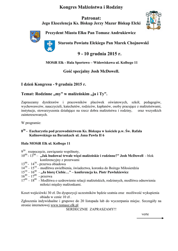 Kongres Małżeństwa i Rodziny Patronat: Jego Ekscelencja Ks. Biskup Jerzy Mazur Biskup Ełcki Prezydent Miasta Ełku Pan Tomasz Andrukiewicz Starosta Powiatu Ełckiego Pan Marek Chojnowski 9 - 10 grudnia 2015 r. MOSiR Ełk - Hala Sportowo – Widowiskowa ul. Kolbego 11 Gość specjalny Josh McDowell. I dzień Kongresu - 9 grudnia 2015 r. Temat: Rodzinne „my” w małżeńskim „ja i Ty”. Zapraszamy dyrektorów i pracowników placówek oświatowych, szkół, pedagogów, wychowawców, nauczycieli, katechetów, rodziców, kapłanów, osoby pracujące z małżeństwami, instytucje, stowarzyszenia działające na rzecz dobra małżeństwa i rodziny, oraz wszystkich zainteresowanych. W programie: 830 - Eucharystia pod przewodnictwem Ks. Biskupa w kościele p.w. Św. Rafała Kalinowskiego na Barankach ul. Jana Pawła II 6 Hala MOSiR Ełk ul. Kolbego 11 930 - rozpoczęcie, zawiązanie wspólnoty, 1000 - 1300 – „Jak budować trwałe więzi małżeńskie i rodzinne?” Josh McDowell - blok konferencyjny z przerwami 1300 - 1430 - przerwa obiadowa 1430 – 1510 – modlitwa uwielbienia, świadectwa, koronka do Bożego Miłosierdzia 1510 – 1640 - „Ja biorę Ciebie…” – konferencja ks. Piotr Pawlukiewicz 1640 – 1700 - przerwa 1700 – 1800 - Modlitwa o uzdrowienie relacji małżeńskich, rodzinnych, modlitwa odnowienia miłości między małżonkami. Koszt wejściówki 30 zł. Do dyspozycji uczestników będzie szatnia oraz możliwość wykupienia obiadu w cenie 10 zł . Zgłoszenia indywidualne i grupowe do 20 listopada lub do wyczerpania miejsc. Szczegóły na stronie internetowej www.tomasz.elk.pl SERDECZNIE ZAPRASZAMY!! verte II dzień Kongresu - 10 grudnia 2015 r. XII Forum Wychowawcze Szkół Temat: Mądrość serca. Dzień drugi przeznaczony jest na spotkanie, konferencje i świadectwa skierowane do młodzieży. Zapraszamy młodzież gimnazjalną i ponadgimnazjalną oraz starszą. Zapraszamy rodziców, kapłanów, dyrektorów i pracowników placówek oświatowych, szkół, pedagogów, wychowawców, nauczycieli, katechetów, osoby pracujące z młodzieżą, instytucje, stowarzyszenia działające na rzecz młodzieży ,oraz wszystkich zainteresowanych. Hala MOSiR Ełk ul. Kolbego 11 W programie: 930 - rozpoczęcie, zawiązanie wspólnoty, 1000 - 1300 - „Love Story. O miłości i seksie we właściwym kontekście” - Josh McDowell blok konferencyjny z przerwami 1300 - 1400 – świadectwa i program ewangelizacyjny przygotowujący do Światowych Dni Młodzieży Josh McDowell (ur. 1939 w Michigan), amerykański ewangelizator, jeden z najpopularniejszych pisarzy chrześcijańskich - autor dziesiątek książek, adresowanych w znacznej części do młodzieży. Jest świetnym mówcą, którego na całym świecie z zapartym tchem słuchają tysiące ludzi. Początkowo uważał się za agnostyka, jednak pod wpływem grupy głęboko wierzących studentów odkrył, że istnieją przekonujące dowody historyczne, przemawiające za chrześcijaństwem. Skutkiem tego odkrycia było głębokie nawrócenie, zawierzenie życia Bogu i doświadczenie przemieniającej mocy Jego miłości. Często odwiedzał Polskę – ostatnio w 2010 roku. Jest autorem lub współautorem licznych książek poruszających tematykę małżeństwa i rodziny oraz kształtowania relacji. Josh zawsze chętnie dzieli się świadectwem o tym, co Bóg uczynił w jego życiu osobową więź ze zmartwychwstałym, żyjącym Chrystusem”…cd. świadectwa na stronie www.tomasz.elk.pl Udział w II dniu kongresu jest bezpłatny. Zgłoszenia indywidualne i grupowe do 20 listopada lub do wyczerpania miejsc. Szczegóły na stronie internetowej www.tomasz.elk.pl W przygotowaniu konspekt scenariusza wprowadzającego w spotkanie z Joshem – będzie do pobrania w październiku na stronie www.tomasz.elk.pl Organizatorzy: Wydział Duszpasterstwa Rodzin Ełckiej Kurii Diecezjalnej Wydział Katechetyczny Ełckiej Kurii Diecezjalnej Warmińsko-Mazurski Ośrodek Doskonalenia Nauczycieli w Olsztynie Filia w Olecku Parafia p.w. Św. Tomasza Apostoła w Ełku Stowarzyszenie DUC IN ALTUM Stowarzyszenie Rodzina Rodzin