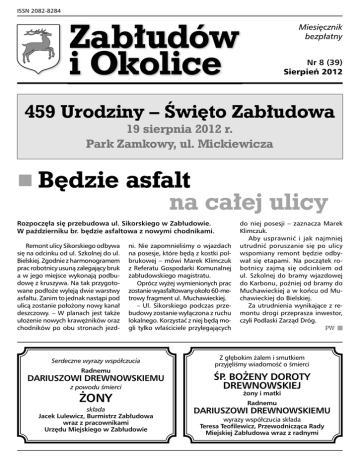 ISSN 2082-8284 Miesięcznik bezpłatny Zabłudów i Okolice Nr 8 (39) Sierpień 2012 459 Urodziny – Święto Zabłudowa 19 sierpnia 2012 r. Park Zamkowy, ul. Mickiewicza Będzie asfalt na całej ulicy Rozpoczęła się przebudowa ul. Sikorskiego w Zabłudowie. W październiku br. będzie asfaltowa z nowymi chodnikami. Remont ulicy Sikorskiego odbywa się na odcinku od ul. Szkolnej do ul. Bielskiej. Zgodnie z harmonogramem prac robotnicy usuną zalegający bruk a w jego miejsce wykonają podbudowę z kruszywa. Na tak przygotowane podłoże wyleją dwie warstwy asfaltu. Zanim to jednak nastąpi pod ulicą zostanie położony nowy kanał deszczowy. – W planach jest także ułożenie nowych krawężników oraz chodników po obu stronach jezd- ni. Nie zapomnieliśmy o wjazdach na posesje, które będą z kostki polbrukowej – mówi Marek Klimczuk z Referatu Gospodarki Komunalnej zabłudowskiego magistratu. Oprócz wyżej wymienionych prac zostanie wyasfaltowany około 60-metrowy fragment ul. Muchawieckiej. – Ul. Sikorskiego podczas przebudowy zostanie wyłączona z ruchu lokalnego. Korzystać z niej będą mogli tylko właściciele przylegających Serdeczne wyrazy współczucia Radnemu DARIUSZOWI DREWNOWSKIEMU z powodu śmierci do niej posesji – zaznacza Marek Klimczuk. Aby usprawnić i jak najmniej utrudnić poruszanie się po ulicy wspomiany remont będzie odbywał się etapami. Na początek robotnicy zajmą się odcinkiem od ul. Szkolnej do bramy wjazdowej do Karbonu, poźniej od bramy do Muchawieckiej a w końcu od Muchawieckiej do Bielskiej. Za utrudnienia wynikające z remontu drogi przeprasza inwestor, czyli Podlaski Zarząd Dróg. PW Z głębokim żalem i smutkiem przyjęliśmy wiadomość o śmierci ŚP. BOŻENY DOROTY DREWNOWSKIEJ ŻONY żony i matki składa Jacek Lulewicz, Burmistrz Zabłudowa wraz z pracownikami Urzędu Miejskiego w Zabłudowie DARIUSZOWI DREWNOWSKIEMU Radnemu wyrazy współczucia składa Teresa Teofilewicz, Przewodnicząca Rady Miejskiej Zabłudowa wraz z radnymi 2 Zabłudów i Okolice 459 Urodziny – Święto Zabłudowa Zabłudów, Park Zamkowy ul. Mickiewicza, 19.08.2012 r. 10.00 Liturgia Św. w cerkwi w Zabłudowie 11.00 Msza Św. w kościele w Zabłudowie 15.00 Hejnał Zabłudowa 15.15 Otwarcie imprezy i wręczenie pucharów Gminnej Ligi Piłki Nożnej 15.30 Prezentacja Młodych Talentów Gminy Zabłudów: Małgorzata Hermanowska, Iza i Radek Bojko, Ula Czarniecka, Rafał Ciupek, Zespół muzyczny z Gimnazjum, Mateusz Wasilewski 16.30 Występ zespołu „Podlaskie Babeczki” – Muzyka lat 60-tych 17.15 Koncert zespołu „Fart Show” z Bielska Podlaskiego 18.00 Pokazy ułańskie – „Zajazd szlachty podlaskiej na Zabłudów ” 18.15 „Frey Lech Trio” – koncert muzyki żydowskiej 19.00 Koncert męskiego zespołu „KURANTY” 20.00 Kabaret „WIDELEC” 21.00 Gwiazda Wieczoru „TURNIOKI”– muzyka góralska 22.20 Pokaz „Taniec z ogniem” Imprezie towarzyszą: 18.08.2012 r. godz. 10.00 – Turniej szachowy im. Zygmunta Augusta 19.08.2012 r. godz. 14.00 – Mecz piłki nożnej „Rudnia” Zabłudów – „Gieret” Giby – Wystawa motocykli – GOD BOYS – Bielsk Podlaski – Wystawa maszyn rolniczych – Jarmark Twórców Ludowych – Wioska dziecięca dla dzieci – Kiermasz książki PATRONAT HONOROWY: Burmistrz Zabłudowa Sponsor główny: Właściciel marki Żubr Sponsorzy medialni: Media Jard oraz „Zabłudów i Okolice” Sponsorzy: Podlasko-Mazurski Bank Spółdzielczy w Zabłudowie, Spółdzielnia Mieszkaniowa „Krokus” w Dobrzyniówce, Spółdzielnia Mieszkaniowa LokatorskoWłasnościowa w Zabłudowie, Centrala Nasienna w Zabłudowie, MSG GRANIT Sponsor główny: w Zabłudowie, MPO Białystok, Zakład Kamieniarski „Kamyk” w Kurianach, „Fotoart” Joanna Łajewska Talipska Białystok, Zakład Drogowo-Transportowy M. Lewczuk Zabłudów, AB AUTO Borysiewicz i Wspólnicy sp.j. Kuriany, Gminna Spółdzielnia „Samopomoc Chłopska” Zabłudów, „Kama” Sklep Wielobranżowy Zabłudów, P i W Nowiccy Lewki, „Chatka Puchatka” Wasilewscy w Zabłudowie, KARBON Stanisław Dragowski Zabłudów, Sklep Meblowy Lachowski Zabłudów, PPHU HEDES Protasy, Andrzej Łotko Minidelikatesy Zabłudów, Archelan Bielsk Podlaski, Sklep Spoż-Przem. „STAŚ” w Zabłudowie Organizatorzy 459 URODZIN – ŚWIĘTA ZABŁUDOWA: Miejski Ośrodek Animacji Kultury w Zabłudowie, Urząd Miejski w Zabłudowie, Miejska Biblioteka Publiczna w Zabłudowie, Ochotnicza Straż Pożarna w Zabłudowie, Klub Sportowy „Rudnia” Zabłudów, Gimnazjum im. G. Chodkiewicza w Zabłudowie, Szkoła Podstawowa im F. Karpińskiego w Zabłudowie Sponsorzy medialni: Europejski Fundusz Rolny na rzecz Rozwoju Obszarów Wiejskich: Europa inwestująca w obszary wiejskie Urząd Stanu Cywilnego informuje Według danych Urzędu Stanu Cywilnego od 1 stycznia do 30 czerwca br. w Gminie Zabłudów urodziło się 47 dzieci, 17 dziewczynek i 30 chłopców. Najpłodniejszy okazał się maj, w tym miesiącu przyszło na świat 13 dzieci. Najmniej maluszków urodziło się w kwietniu, tylko 4. W tym samym czasie zanotowano aż 56 zgonów, tyle samo co w pierwszym półroczu 2011 roku. Odeszło do wieczności 20 kobiet i 36 mężczyzn. Najwięcej zgonów było w maju – 13, najmniej w kwietniu – 7. W pierwszej połowie bieżącego roku zawarto 36 związków małżeń- skich. W lutym tylko jedna para powiedziała sakramentalne „tak”, zaś w czerwcu aż 15. W analogicznym czasie Urząd Stanu Cywilnego odnotował także 12 rozwodów. PW 3 Nr 8 (39) • Sierpień 2012 Dobrze mi tu W listopadzie br. minie dwa lata Pana kadencji na stanowisku radnego powiatowego. Co przez ten czas udało się Panu uzyskać dla gminy Zabłudów? Rzeczywiście już niebawem minie półmetek mojej pracy jako radnego powiatowego. Myślę, że swoją funkcję pełnię jak najlepiej potrafię. W moim mniemaniu radny to taki pośrednik pomiędzy gminą a powiatem. Staram się wspierać wszelkie