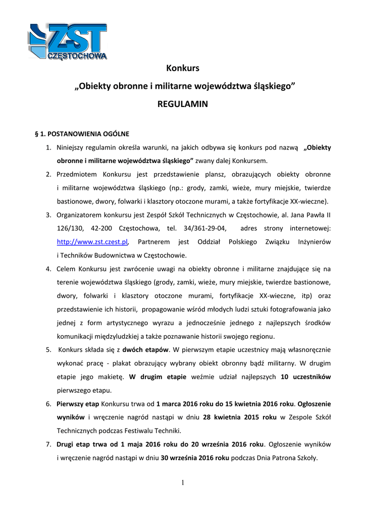 Konkurs „Obiekty obronne i militarne województwa śląskiego” REGULAMIN § 1. POSTANOWIENIA OGÓLNE 1. Niniejszy regulamin określa warunki, na jakich odbywa się konkurs pod nazwą „Obiekty obronne i militarne województwa śląskiego” zwany dalej Konkursem. 2. Przedmiotem Konkursu jest przedstawienie plansz, obrazujących obiekty obronne i militarne województwa śląskiego (np.: grody, zamki, wieże, mury miejskie, twierdze bastionowe, dwory, folwarki i klasztory otoczone murami, a także fortyfikacje XX-wieczne). 3. Organizatorem konkursu jest Zespół Szkół Technicznych w Częstochowie, al. Jana Pawła II 126/130, 42-200 Częstochowa, tel. 34/361-29-04, http://www.zst.czest.pl, Partnerem jest Oddział adres strony internetowej: Polskiego Związku Inżynierów i Techników Budownictwa w Częstochowie. 4. Celem Konkursu jest zwrócenie uwagi na obiekty obronne i militarne znajdujące się na terenie województwa śląskiego (grody, zamki, wieże, mury miejskie, twierdze bastionowe, dwory, folwarki i klasztory otoczone murami, fortyfikacje XX-wieczne, itp) oraz przedstawienie ich historii, propagowanie wśród młodych ludzi sztuki fotografowania jako jednej z form artystycznego wyrazu a jednocześnie jednego z najlepszych środków komunikacji międzyludzkiej a także poznawanie historii swojego regionu. 5. Konkurs składa się z dwóch etapów. W pierwszym etapie uczestnicy mają własnoręcznie wykonać pracę - plakat obrazujący wybrany obiekt obronny bądź militarny. W drugim etapie jego makietę. W drugim etapie weźmie udział najlepszych 10 uczestników pierwszego etapu. 6. Pierwszy etap Konkursu trwa od 1 marca 2016 roku do 15 kwietnia 2016 roku. Ogłoszenie wyników i wręczenie nagród nastąpi w dniu 28 kwietnia 2015 roku w Zespole Szkół Technicznych podczas Festiwalu Techniki. 7. Drugi etap trwa od 1 maja 2016 roku do 20 września 2016 roku. Ogłoszenie wyników i wręczenie nagród nastąpi w dniu 30 września 2016 roku podczas Dnia Patrona Szkoły. 1 8. Wszyscy laureaci zostaną powiadomieni przez Organizatora drogą telefoniczną lub elektroniczną. § 2 WARUNKI UCZESTNICTWA W KONKURSIE I WYMAGANIA TECHNICZNE 1. Udział w Konkursie jest całkowicie dobrowolny i bezpłatny. 2. Konkurs jest organizowany na terytorium Polski i przeznaczony wyłącznie dla uczniów szkół gimnazjalnych i ponadgimnazjalnych z województwa śląskiego. 3. Prace konkursowe muszą być autorskimi, nie mogą być wcześniej rozpowszechniane. 4. Konkurs przeznaczony jest dla uczniów szkół gimnazjalnych i ponadgimnazjalnych z terenu województwa śląskiego, którzy nadeślą zgłoszenie konkursowe (załącznik nr 1) oraz samodzielnie wykonane prace. 5. Uczestnik konkursu powinien wykonać pracę - planszę na formacie 70 cm x 100 cm (B1). Plansza ma zawierać własnoręcznie wykonane zdjęcie (zdjęcia) wraz z krótkim opisem historii wybranego obiektu militarnego czy obronnego. Zdjęcia umieszczone na planszy mają mieć format minimum 21 cm x 30 cm. Plansza może być wykonana dowolną techniką i powinna być oprawiona w antyramę w tym samym formacie. 6. Do planszy należy dołączyć oświadczenie o posiadaniu praw autorskich do wykorzystanych fotografii oraz zgodę na przetwarzanie danych osobowych (załącznik nr 2). 7. Zgłoszenie wraz z pracą (planszą) i oświadczeniami należy dostarczyć w terminie do 15 kwietnia 2016 roku (decyduje data przyjęcia w sekretariacie ZST) do siedziby organizatora: Zespół Szkół Technicznych al. Jana Pawła II 126/130, 42 - 200 Częstochowa z dopiskiem „Konkurs militarny”. Dostarczonych prac nie zwracamy. 8. W przypadku nadesłania większej liczby prac z jednej placówki, każdą należy podpisać imieniem i nazwiskiem autora. 9. W przypadku osób niepełnoletnich należy dołączyć oświadczenie rodzica lub prawnego opiekuna (załącznik nr 3). 10. W drugim etapie uczestnicy mają wykonać makietę wcześniej przedstawionego obiektu. Makietę będzie można także wykonać (częściowo z własnych materiałów) na warsztatach zorganizowanych we wrześniu 2016 roku w Zespole Szkół Technicznych w Częstochowie. 11. Wykonane prace - plansze oraz makiety można będzie oglądać w dniu 30 września 2016 r. na wystawie pokonkursowej w Zespole Szkół Technicznych podczas Dnia Patrona Szkoły. 12. Nagrodzone i wyróżnione prace zostaną także zamieszczone na stronie internetowej ZST ( http://www.zst.czest.pl ). 2 § 3. ZGODY I UPRAWNIENIA 1. Prace nadesłane przez osoby nie spełniające warunków regulaminu nie będą przyjmowane do konkursu. 2. Przystąpienie do Konkursu jest równoznaczne z wyrażeniem zgody na wszystkie warunki przedstawione przez organizatora w formularzu zgłoszeniowym oraz niniejszym regulaminie. 3. Wszelkie sprawy nie ujęte regulaminem i sporne rozstrzyga organizator Konkursu. 4. Organizator zastrzega sobie prawo do zmiany regulaminu Konkursu nawet w trakcie jego trwania. Informacja o zmianach będzie umieszczona na stronie internetowej Organizatora Konkursu. Zmiany wchodzą w życie z dniem ich ogłoszenia. § 4. JURY i NAGRODY 1. Nad prawidłowym przebiegiem Konkursu czuwa Organizator. 2. Komisja Konkursowa (zwana dalej Jury) powołana przez Organizatora dokona oceny prac. 3. Jury przy ocenie prac w I etapie będzie brało pod uwagę przede wszystkim czy samodzielnie wykonane fotografie przedstawiają w oryginalny sposób obiekt militarny/obronny oraz wygląd całości planszy. 4. Jury przy ocenie prac w II etapie będzie brało pod uwagę przede wszystkim jak najbardziej wierne odtworzenie wybranego obiektu, estetykę wykonania, dobór materiałów. 5. Jury wyłoni zwycięzców w ciągu 7 dni od daty zakończenia poszczególnych etapów Konkursu. 6. Jury decyduje o: przyznaniu nagród w pierwszym etapie konkursu, zakwalifikowaniu uczestników do drugiego etapu, przyznaniu nagród w drugim etapie. 7. Jury w I etapie przyzna jedną nagrodę główną (smartwatch) oraz trzy wyróżnienia. 8. Jury w II 
