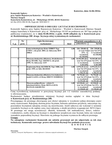 Katowice, dnia 16-06-2016r. Komornik Sądowy przy Sądzie Rejonowym Katowice - Wschód w Katowicach Mariusz Snopek Kancelaria Komornicza, ul. Mielęckiego 10/103, 40-013 Katowice tel./fax (032) 206 84 46, Sygn.akt KM 664/13 OBWIESZCZENIE O DRUGIEJ LICYTACJI RUCHOMOŚCI Komornik Sądowy przy Sądzie Rejonowym Katowice - Wschód w Katowicach Mariusz Snopek mający kancelarię w Katowicach przy ul. Mielęckiego 10/103 na podstawie art. 867 kpc podaje do publicznej wiadomości, że w dniu 02.08.2016r. o godz. 10.00 odbędzie się w Katowicach przy al. Roździeńskiego 208 druga licytacja niżej wymienionych ruchomości: Nr prot. L.p. Opis licytowanej ruchomości Wartość szacunkowa w zł. jednostkowa ilość 1 Linia technologiczna firmy EHRET Typ: UM52+, rok prod. 2003, nr. fabryczny RST 1006.6 1,00 2 Maszyna drukarska offsetowa, dwukolorowa firmy RYOBI, Typ: 3202MCS, rok prod. 1999, Nr. fabryczny 1219 1,00 3 Kopiorama firmy KLIMSCH, Typ: 3400, rok prod. 1995, nr fabr. 86120103 1,00 4 Maszyna drukarska offsetowa 4-ro kolorowa model GAZELA 8 firmy DRENT EERBEEK 1,00 5 Maszyna poligraficzna - colator 8 miostanowiskowy firmy ROTA-LOCK HANS-H JAKOB ING 1,00 226. 320,00 zł (w tym Vat 23% w wysokości 42.320,00) 34.563,00 zł(w tym Vat 23% w wysokości 6.463,00) 6.974,10 zł (w tym Vat 23% w wysokości 1.304,10 zł) 76.752,00 (w tym Vat 23% w wysokości 14.352,00 zł) 65.928,00 (w tym Vat 23% w wysokości 12.328,00 zł) łączna 226. 320,00 zł (w tym Vat 23% w wysokości 42.320,00) 34.563,00 zł(w tym Vat 23% w wysokości 6.463,00ł 6.974,10 zł (w tym Vat 23% w wysokości 1.304,10 zł) 76.752,00 (w tym Vat 23% w wysokości 14.352,00 zł) 65.928,00 (w tym Vat 23% w wysokości 12.328,00 zł) Ceną wywoławczą ruchomości w powyższej licytacji jest 1/2 wartości szacunkowej podanej w obwieszczeniu. Ruchomości będące przedmiotem niniejszej licytacji można oglądać w dniu licytacji w Katowicach przy al. Roździeńskiego 208. Przystępujący do przetargu obowiązany jest złożyć rękojmię w wysokości jednej dziesiątej części sumy oszacowania. Rękojmię złożoną przez licytanta, któremu udzielono przybicia, zatrzymuje się; pozostałym licytantom rękojmię zwraca się niezwłocznie. Jeżeli nabywca nie wykonał w terminie warunków licytacji co do zapłaty ceny, traci rękojmię, a skutki przybicia wygasają (art. 867(1) kpc). W przetargu nie mogą uczestniczyć: dłużnik, komornik, ich małżonkowie, dzieci, rodzice i rodzeństwo, osoby obecne na licytacji w charakterze urzędowym oraz licytant, który nie wykonał warunków poprzedniej licytacji. Stawienie się jednego licytanta wystarcza do odbycia przetargu. Uwaga: Na zakupione ruchomości Komornik nie udziela gwarancji ani nie odpowiada za ich stan techniczny. Komornik zastrzega prawo odwołania licytacji bez podania przyczyny. K O M O R N I K Mariusz Snopek Otrzymują: - dłużnik, wierzyciel, Sąd Rejonowy - tablica ogłoszeń x 2,dozorca zajętych ruchomości, a/a