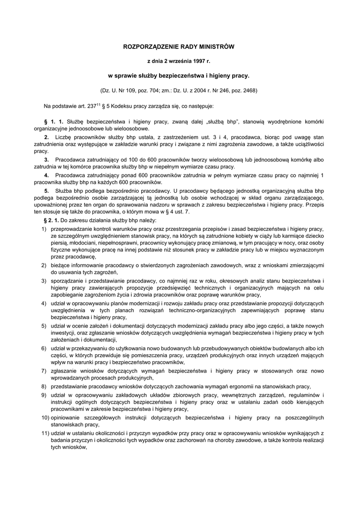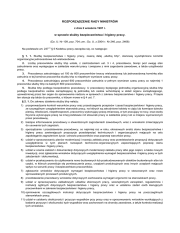 ROZPORZĄDZENIE RADY MINISTRÓW z dnia 2 września 1997 r. w sprawie służby bezpieczeństwa i higieny pracy. (Dz. U. Nr 109, poz. 704; zm.: Dz. U. z 2004 r. Nr 246, poz. 2468) Na podstawie art. 23711 § 5 Kodeksu pracy zarządza się, co następuje: § 1. 1. Służbę bezpieczeństwa i higieny pracy, zwaną dalej „służbą bhp”, stanowią wyodrębnione komórki organizacyjne jednoosobowe lub wieloosobowe. 2. Liczbę pracowników służby bhp ustala, z zastrzeżeniem ust. 3 i 4, pracodawca, biorąc pod uwagę stan zatrudnienia oraz występujące w zakładzie warunki pracy i związane z nimi zagrożenia zawodowe, a także uciążliwości pracy. 3. Pracodawca zatrudniający od 100 do 600 pracowników tworzy wieloosobową lub jednoosobową komórkę albo zatrudnia w tej komórce pracownika służby bhp w niepełnym wymiarze czasu pracy. 4. Pracodawca zatrudniający ponad 600 pracowników zatrudnia w pełnym wymiarze czasu pracy co najmniej 1 pracownika służby bhp na każdych 600 pracowników. 5. Służba bhp podlega bezpośrednio pracodawcy. U pracodawcy będącego jednostką organizacyjną służba bhp podlega bezpośrednio osobie zarządzającej tą jednostką lub osobie wchodzącej w skład organu zarządzającego, upoważnionej przez ten organ do sprawowania nadzoru w sprawach z zakresu bezpieczeństwa i higieny pracy. Przepis ten stosuje się także do pracownika, o którym mowa w § 4 ust. 7. § 2. 1. Do zakresu działania służby bhp należy: 1) przeprowadzanie kontroli warunków pracy oraz przestrzegania przepisów i zasad bezpieczeństwa i higieny pracy, ze szczególnym uwzględnieniem stanowisk pracy, na których są zatrudnione kobiety w ciąży lub karmiące dziecko piersią, młodociani, niepełnosprawni, pracownicy wykonujący pracę zmianową, w tym pracujący w nocy, oraz osoby fizyczne wykonujące pracę na innej podstawie niż stosunek pracy w zakładzie pracy lub w miejscu wyznaczonym przez pracodawcę, 2) bieżące informowanie pracodawcy o stwierdzonych zagrożeniach zawodowych, wraz z wnioskami zmierzającymi do usuwania tych zagrożeń, 3) sporządzanie i przedstawianie pracodawcy, co najmniej raz w roku, okresowych analiz stanu bezpieczeństwa i higieny pracy zawierających propozycje przedsięwzięć technicznych i organizacyjnych mających na celu zapobieganie zagrożeniom życia i zdrowia pracowników oraz poprawę warunków pracy, 4) udział w opracowywaniu planów modernizacji i rozwoju zakładu pracy oraz przedstawianie propozycji dotyczących uwzględnienia w tych planach rozwiązań techniczno-organizacyjnych zapewniających poprawę stanu bezpieczeństwa i higieny pracy, 5) udział w ocenie założeń i dokumentacji dotyczących modernizacji zakładu pracy albo jego części, a także nowych inwestycji, oraz zgłaszanie wniosków dotyczących uwzględnienia wymagań bezpieczeństwa i higieny pracy w tych założeniach i dokumentacji, 6) udział w przekazywaniu do użytkowania nowo budowanych lub przebudowywanych obiektów budowlanych albo ich części, w których przewiduje się pomieszczenia pracy, urządzeń produkcyjnych oraz innych urządzeń mających wpływ na warunki pracy i bezpieczeństwo pracowników, 7) zgłaszanie wniosków dotyczących wymagań bezpieczeństwa i higieny pracy w stosowanych oraz nowo wprowadzanych procesach produkcyjnych, 8) przedstawianie pracodawcy wniosków dotyczących zachowania wymagań ergonomii na stanowiskach pracy, 9) udział w opracowywaniu zakładowych układów zbiorowych pracy, wewnętrznych zarządzeń, regulaminów i instrukcji ogólnych dotyczących bezpieczeństwa i higieny pracy oraz w ustalaniu zadań osób kierujących pracownikami w zakresie bezpieczeństwa i higieny pracy, 10) opiniowanie szczegółowych instrukcji dotyczących bezpieczeństwa i higieny pracy na poszczególnych stanowiskach pracy, 11) udział w ustalaniu okoliczności i przyczyn wypadków przy pracy oraz w opracowywaniu wniosków wynikających z badania przyczyn i okoliczności tych wypadków oraz zachorowań na choroby zawodowe, a także kontrola realizacji tych wniosków, 12) prowadzenie rejestrów, kompletowanie i przechowywanie dokumentów dotyczących wypadków przy pracy, stwierdzonych chorób zawodowych i podejrzeń o takie choroby, a także przechowywanie wyników badań i pomiarów czynników szkodliwych dla zdrowia w środowisku pracy, 13) doradztwo w zakresie stosowania przepisów oraz zasad bezpieczeństwa i higieny pracy, 14) udział w dokonywaniu oceny ryzyka zawodowego, które wiąże się z wykonywaną pracą, 15) doradztwo w zakresie organizacji i metod pracy na stanowiskach pracy, na których występują czynniki niebezpieczne, szkodliwe dla zdrowia lub warunki uciążliwe, oraz doboru najwłaściwszych środków ochrony zbiorowej i indywidualnej, 16) współpraca z właściwymi komórkami organizacyjnymi lub osobami, w szczególności w zakresie organizowania i zapewnienia odpowiedniego poziomu szkoleń w dziedzinie bezpieczeństwa i higieny pracy oraz zapewnienia właściwej adaptacji zawodowej nowo zatrudnionych pracowników, 17) współpraca z laboratoriami upoważnionymi, zgodnie z odrębnymi przepisami, do dokonywania badań i pomiarów czynników szkodliwych dla zdrowia lub warunków uciążliwych, występujących w środowisku pracy, w zakresie organizowania tych badań i pomiarów oraz sposobów ochrony pracowników przed tymi czynnikami lub warunkami, 18) współpraca z laboratoriami i innymi jednostkami zajmującymi się pomiarami stanu środowiska naturalnego, działającymi w systemie państwowego monitoringu środowiska, określonego w odrębnych przepisach, 19) współdziałanie z lekarzem sprawującym profilaktyczną opiekę zdrowotną nad pracownikami, a w szczególności przy organizowaniu okresowych badań lekarskich pracowników, 20) współdziałanie ze społeczną inspekcją pracy oraz z zakładowymi organizacjami związkowymi przy: a) podejmowaniu przez nie działań mających na celu przest