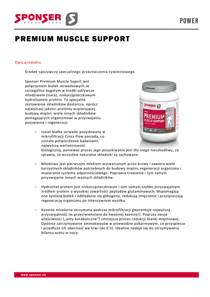PREMIUM MUSCLE SUPPORT Opis produktu Środek spożywczy specjalnego przeznaczenia żywieniowego Sponser Premium Muscle Suport jest połączeniem białek serwatkowych ze szczególnie bogatym w środki odżywcze młodziwem (siara), niskocząsteczkowym hydrolizatem protein. To specjalne zestawienie składników dostarcza, oprócz najwyższej jakości proteiny wspierającej budowę mięśni, wiele innych składników pomagających organizmowi w przyswajaniu pożywienia i regeneracji: - Izolat białka serwatki pozyskiwany w mikrofiltracji Cross Flow posiada, co zostało potwierdzone badaniami, najwyższą wartościowość biologiczną, ponieważ proces jego pozyskiwania jest dla niego nieszkodliwy, co sprawia, że wszystkie naturalne składniki są zachowane - Młodziwo jest pierwszym mlekiem wytwarzanym przez krowy i zawiera wiele korzystnych składników potrzebnych do budowy mięśni, regeneracji organizmu i wspierania systemu odpornościowego. Poprawia trawienie i tym samym przyswajanie innych ważnych składników. - Hydrolizat protein jest niskocząsteczkowym i tym samym szybko przyswajalnym źródłem protein o wysokiej zawartości peptydów glutaminowych. Wspomagają one syntezę białek i odkładanie się glikogenu, redukują zmęczenie i przyśpieszają regenerację organizmu po intensywnym wysiłku. - Kazeina micelarna otrzymana podczas mikrofiltracji gwarantuje najwyższą przyswajalność (w przeciwieństwie do kwaśniej kazeiny!). Poprzez swoje właściwości („anty-kataboliczne“) zmniejsza proces redukcji tkanki mięśniowej. Opóźnia zatrzymywanie aminokwasów w przewodzie pokarmowym, co przyspiesza i przedłuża ich obecność we krwi (do 8 h). Idealnie nadaje się do utrzymywania bilansu azotu w nocy. PREMIUM MUSCLE SUPPORT Zalety • Wspomaga proces regeneracji • Łączy szybko przyswajalne, niskocząsteczkowe proteiny • Jedynie 2.1 g laktozy w jednej porcji • Do przygotowania z woda • Naturalny smak • Bezglutenowy Zastosowanie Najlepiej przed i po wysiłku lub jako późny posiłek. Od 1 do 3 drinków dziennie. Przeznaczony dla ambitnych sportowców, którzy marzą o zwiększeniu masy mięśniowej. Stosowany w celu wsparcia procesu budowy mięśni i zwiększenia masy. Składniki Izolaty i hydroizolaty białek, kazeina wapna, lecytyna sojowa emulgator, karmel w proszku, młodziwo, aromaty, związki mineralne, 10 witamin , kwas askorbinowy, substancje słodzące, kwas foliowy ,kwas nikotynowy, biotyna, tiamina, ryboflawina, cyjanokobalamina, pantotenian wapnia, chlorowodorek pirydoksyny. PREMIUM MUSCLE SUPPORT Smaki / Opakowanie /Wartości odżywcze Truskawka, czekolada. Puszka 425 g. / Czekolada. Puszka 5000 g. Wartości Na 100 g proszku odżywcze Energia kJ (kcal) 1561 (368) Proteiny 71 g Węglowodany 14 g - w tym cukty 4.7 g Tłuszcze 2.5 g - w tym tłuszcze 1.0 g nasycone Błonnik 4.7 g Sód 0.22 g Witaminy Na 100 g %ZDS* E 12 mg 100% C 80 mg 100% B1 1.1 mg 100% B2 1.4 mg 100% Niacyna 16 mg 100% B6 1.4 mg 100% Kwas foliowy 200 μg 100% B12 2.5 μg 100% Biotyna 50 μg 100% Kwas pantotenowy 6.0 mg 100% Związki mineralne Na 100 g %ZDS* Potas 970 mg 49% Wapno 800 mg 100% Magnez 130 mg 35% Fosfor 600 mg 86% *ZDS – Zalecane Dzienne Spożycie 1 Napój = 25 g proszku + 150 ml wody 390 (92) 18 g 3.5 g 1.2 g 0.6 g 0.3 g 1 Napój 3.0 mg 20 mg 0.3 mg 0.4 mg 4.0 mg 0.4 mg 50 μg 0.6 μg 13 μg 1.5 mg 1 Napój 243 mg 200 mg 33 mg 150 mg 1.2 g 0.06 g %ZDS* 25% 25% 27% 29% 25% 29% 25% 24% 26% 25% %ZDS* 12% 25% 9% 21%
