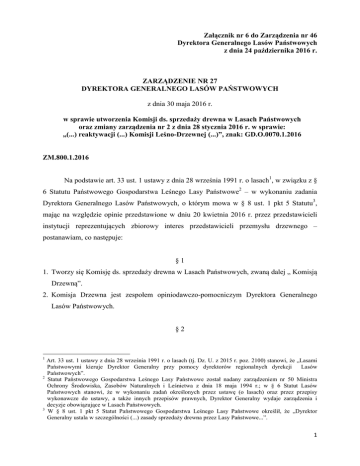 Załącznik nr 6 do Zarządzenia nr 46 Dyrektora Generalnego Lasów Państwowych z dnia 24 października 2016 r. ZARZĄDZENIE NR 27 DYREKTORA GENERALNEGO LASÓW PAŃSTWOWYCH z dnia 30 maja 2016 r. w sprawie utworzenia Komisji ds. sprzedaży drewna w Lasach Państwowych oraz zmiany zarządzenia nr 2 z dnia 28 stycznia 2016 r. w sprawie: „(...) reaktywacji (...) Komisji Leśno-Drzewnej (...)”, znak: GD.O.0070.1.2016 ZM.800.1.2016 Na podstawie art. 33 ust. 1 ustawy z dnia 28 września 1991 r. o lasach1, w związku z § 6 Statutu Państwowego Gospodarstwa Leśnego Lasy Państwowe2 – w wykonaniu zadania Dyrektora Generalnego Lasów Państwowych, o którym mowa w § 8 ust. 1 pkt 5 Statutu3, mając na względzie opinie przedstawione w dniu 20 kwietnia 2016 r. przez przedstawicieli instytucji reprezentujących zbiorowy interes przedstawicieli przemysłu drzewnego – postanawiam, co następuje: §1 1. Tworzy się Komisję ds. sprzedaży drewna w Lasach Państwowych, zwaną dalej „ Komisją Drzewną”. 2. Komisja Drzewna jest zespołem opiniodawczo-pomocniczym Dyrektora Generalnego Lasów Państwowych. §2 1 2 3 Art. 33 ust. 1 ustawy z dnia 28 września 1991 r. o lasach (tj. Dz. U. z 2015 r. poz. 2100) stanowi, że „Lasami Państwowymi kieruje Dyrektor Generalny przy pomocy dyrektorów regionalnych dyrekcji Lasów Państwowych”. Statut Państwowego Gospodarstwa Leśnego Lasy Państwowe został nadany zarządzeniem nr 50 Ministra Ochrony Środowiska, Zasobów Naturalnych i Leśnictwa z dnia 18 maja 1994 r.; w § 6 Statut Lasów Państwowych stanowi, że w wykonaniu zadań określonych przez ustawę (o lasach) oraz przez przepisy wykonawcze do ustawy, a także innych przepisów prawnych, Dyrektor Generalny wydaje zarządzenia i decyzje obowiązujące w Lasach Państwowych. W § 8 ust. 1 pkt 5 Statut Państwowego Gospodarstwa Leśnego Lasy Państwowe określił, że „Dyrektor Generalny ustala w szczególności (...) zasady sprzedaży drewna przez Lasy Państwowe...”. 1 Celem funkcjonowania Komisji Drzewnej jest formułowanie sugestii oraz opinii na temat zbywania przez LP surowca drzewnego – przy założeniu, że odpowiednie ich wykorzystanie (wykorzystywanie) przez Dyrektora Generalnego Lasów Państwowych służyć będzie uzyskaniu i utrzymaniu consensusu co do: 1) zasad prowadzenia przez Lasy Państwowe sprzedaży surowca drzewnego oraz 2) szczegółowego sposobu wykonywania (realizowania) tychże zasad. §3 Na potrzeby zasad, reguł i sposobu działania Komisji Drzewnej za ich przesłanki przyjmuje się następujące diagnozy wyjściowe: 1) w ramach kierowania Lasami Państwowymi Dyrektor Generalny Lasów Państwowych ma wyłączne i samodzielne uprawnienia do stanowienia w formie aktów sprawstwa kierowniczego zasad i szczegółowego sposobu sprzedaży surowca drzewnego, pozyskiwanego w Lasach Państwowych; 2) właściwe wykonywanie uprawnienia, o którym mowa w pkt 1, może i powinno leżeć w zrównoważonym interesie zarówno Lasów Państwowych, jak i szeroko rozumianego przemysłu drzewnego – co szczegółowo uzasadniono w załączniku nr 1 do zarządzenia; przez właściwe wykonywanie uprawnienia Dyrektora Generalnego Lasów Państwowych do stanowienia zasad i szczegółowego sposobu sprzedaży surowca drzewnego, pozyskiwanego w Lasach Państwowych, należy w pierwszej kolejności rozumieć dokonywanie tego z uwzględnieniem konsultacji Lasów Państwowych z podmiotami działającymi w interesie grupowym osób fizycznych oraz jednostek organizacyjnych: a) zajmujących się nabywaniem oraz wykorzystywaniem, w tym przerobem, surowca drzewnego, b) będących przedsiębiorcami realizującymi usługi na rzecz Lasów Państwowych, w tym głównie w zakresie użytkowania głównego lasu, c) będących beneficjentami efektów z realizacji pozaprodukcyjnych funkcji lasu. 3) należy dążyć do tego, aby konsultacje, o których mowa w pkt 2, miały charakter powszechny, czego nieodzownym warunkiem powinno być zapraszanie do prac w Komisji Drzewnej możliwie najszerszego grona interesariuszy, nie wyłączając podmiotów planujących dopiero wejście na rynki sprzedaży drewna okrągłego w Polsce; 2 4) podmioty, o których mowa w pkt 2, powinny rekrutować się spośród jednostek instytucjonalnych zaliczanych przez Główny Urząd Statystyczny do sektora jednostek niekomercyjnych – ze zwróceniem szczególnej uwagi na: a) izby gospodarcze, stowarzyszenia itp. jednostki organizacyjne, reprezentujące: - przedsiębiorców prowadzących działalność w ramach szeroko rozumianego przemysłu drzewnego, - gospodarstwa domowe, w tym przede wszystkim rodzinne gospodarstwa rolne, będące zwyczajowymi nabywcami tzw. drewna detalicznego, b) stowarzyszenia i inne jednostki organizacyjne sektora jednostek niekomercyjnych działające na rzecz zrównoważonego leśnictwa, w tym organizacje pozarządowe: - koncentrujące swoją aktywność na rzecz różnorodności biologicznej w lasach, - reprezentujące interesy osób i jednostek organizacyjnych korzystających z pozaprodukcyjnych świadczeń lasu na zasadach klubowych, w tym w ramach szeroko rozumianej turystyki leśnej; 5) ze względu na okoliczność, że nie wszyscy przedsiębiorcy zakupujący surowiec drzewny oferowany do sprzedaży przez LP są aktualnie zrzeszeni w izbach gospodarczych czy stowarzyszeniach, należy przewidzieć oddziaływanie niewładcze na proces tworzenia co najmniej stowarzyszeń zwykłych czy powstawania zgrupowań cywilnoprawnych tych przedsiębiorców – w celu zapewnienia sobie przez nich możliwości udziału w pracach Komisji Drzewnej; diagnozę zdania poprzedzającego należy odnosić odpowiednio do osób fizycznych, będących nabywcami tzw. drewna detalicznego; 6) urzeczywistnienie koncepcji powszechnego charakteru wyżej wymienionych konsultacji wymaga również uwzględniania okoliczności, że potencjalnymi nabywcami surowca drzewnego, oferowanego do sprzedaży przez Lasy Państwowe, są: a) pr