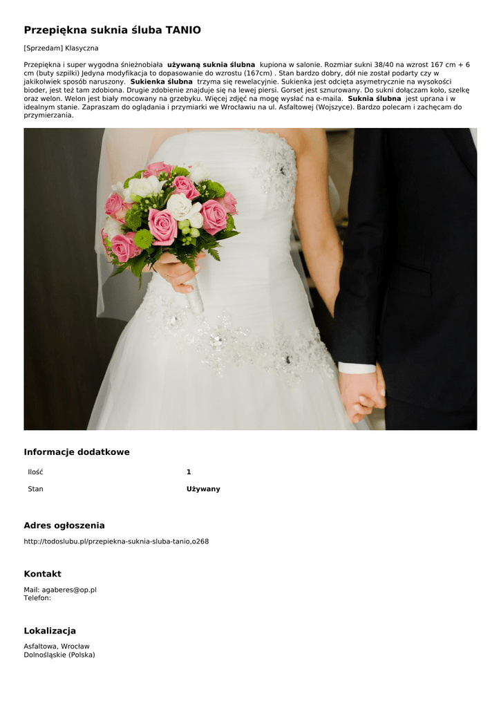 Przepiękna suknia śluba TANIO [Sprzedam] Klasyczna Przepiękna i super wygodna śnieżnobiała używaną suknia ślubna kupiona w salonie. Rozmiar sukni 38/40 na wzrost 167 cm + 6 cm (buty szpilki) Jedyna modyfikacja to dopasowanie do wzrostu (167cm) . Stan bardzo dobry, dół nie został podarty czy w jakikolwiek sposób naruszony. Sukienka ślubna trzyma się rewelacyjnie. Sukienka jest odcięta asymetrycznie na wysokości bioder, jest też tam zdobiona. Drugie zdobienie znajduje się na lewej piersi. Gorset jest sznurowany. Do sukni dołączam koło, szelkę oraz welon. Welon jest biały mocowany na grzebyku. Więcej zdjęć na mogę wysłać na e-maila. Suknia ślubna jest uprana i w idealnym stanie. Zapraszam do oglądania i przymiarki we Wrocławiu na ul. Asfaltowej (Wojszyce). Bardzo polecam i zachęcam do przymierzania. Informacje dodatkowe Ilość 1 Stan Używany Adres ogłoszenia http://todoslubu.pl/przepiekna-suknia-sluba-tanio,o268 Kontakt Mail: [email protected] Telefon: Lokalizacja Asfaltowa, Wrocław Dolnośląskie (Polska) Ogłoszenie dodano: 2016-10-29 14:21:49 Ogłoszenie wygasa: 2018-02-26 14:21:49 Powered by TCPDF (www.tcpdf.org)