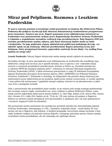 Miraż pod Pelplinem. Rozmowa z Leszkiem Pazderskim W marcu starosta powiatu tczewskiego wydał pozwolenie na budowę dla Elektrowni Północ. Podstawą dla podjęcia tej decyzji była obszerna dokumentacja środowiskowa przygotowana przez inwestora. Zawiera ona m.in. Raport ponownej oceny oddziaływania inwestycji na środowisko oraz postanowienie wydane przez Regionalnego Dyrektora Ochrony Środowiska w Gdańsku o uzgodnieniu warunków realizacji tego przedsięwzięcia. Rolą Raportu OOŚ jest rzetelne przedstawienie analizy wpływu, jaki dana inwestycja będzie miała na ludzi i środowisko. Na jego podstawie organy administracji publicznej podejmują decyzję, czy udzielić zgody na jej realizację. Obecnie przedstawiony Raport ponownej oceny jest kolejnym, który przygotował inwestor, poprzednie zawierały liczne błędy. Czy według Pana spełnia on swoją rolę? Leszek Pazderski: Obecny Raport drastycznie zaniża emisję metali ciężkich do atmosfery. Zacznijmy od tego, że przy sporządzaniu ocen oddziaływania na środowisko dla wszelkiego typu elektrowni, emisji tych nie liczy się w sposób dowolny, lecz w oparciu o tzw. wskaźniki emisji zawarte w uznanych poradnikach metodycznych, którymi w Polsce są „Poradnik metodyczny w zakresie PRTR dla instalacji spalania paliw”, wykonany na zlecenie Głównego Inspektoratu Ochrony Środowiska (GIOŚ), a także stosowany powszechnie w całej UE dokument Europejskiej Agencji Środowiska (European Environment Agency, EEA) „EMEP/EEA Air Pollutant Emission Inventory Guidebook”). Wskaźniki te określają, ile miligramów lub gramów danej substancji jest emitowanych przez elektrownię już po przejściu spalin przez system oczyszczania, w wyniku spalenia 1 tony paliwa lub wytworzenia 1 gigadżula energii cieplnej; wartości te są aktualizowane co jakiś czas wraz z postępami techniki. Otóż z zastosowania obu poradników jasno wynika, że po wzięciu pod uwagę znanego godzinowego lub rocznego zużycia węgla, ewentualnie tzw. mocy cieplnej w paliwie Elektrowni Północ, suma emisji sześciu najbardziej toksycznych metali ciężkich, tj. rtęci (Hg), kadmu (Cd), ołowiu (Pb), arsenu (As), chromu (Cr) i niklu (Ni), będzie od ok. 70 do ok. 150 razy wyższa niż podano w Raporcie. Dotyczy to zarówno stężeń emisyjnych tych pierwiastków w spalinach, jak i ich mas godzinowych i rocznych, mających trafić do atmosfery. Dla porównania można zastosować też analogiczny poradnik metodyczny Amerykańskiej Agencji Ochrony Środowiska, obowiązujący w USA, i tamtejsze wskaźniki emisji – wynik będzie 95 razy wyższy niż ten w Raporcie. Jak widzimy, w każdym przypadku rzeczywista emisja wychodzi o dwa rzędy wielkości większa niż policzyli autorzy Raportu; występują naturalnie pewne różnice między wszystkimi trzema poradnikami, ale nie zmieniają one ogólnego obrazu. Miraż pod Pelplinem. Rozmowa z Leszkiem Pazderskim 1 Las Mątawski – rezerwat przyrody w widłach Wisły i Nogatu, ostatni relikt naturalnych lasów Żuław Wiślanych (las łęgowy jesionowo-wiązowy i topolowy, 150-180 lat) – położony 9 km na wschód od planowanej Elektrowni Północ, zagrożony przez jej emisje gazowo-pyłowe z przyszłej elektrowni. Fot. Leszek Pazderski Najbardziej zadziwia, że dla dwóch innych, znacznie mniej szkodliwych metali, tj. cynku (Zn) i miedzi (Cu), autorzy Raportu użyli właściwych wskaźników emisji – właśnie z Poradnika metodycznego GIOŚ – i dzięki temu uzyskali poprawne stężenia w spalinach oraz emisje godzinowe i roczne. W efekcie powstał zupełnie wypaczony obraz, że spaliny z Elektrowni Północ będą zawierać duże ilości metali relatywnie nieszkodliwych (Zn, Cu), a jedynie nieznaczne tych silnie toksycznych (Hg, Cd, Pb, As, Cr, Ni). Jest to wizja niewątpliwie atrakcyjna z punktu widzenia inwestora, ale z chemicznego punktu widzenia zupełnie nieprawdopodobna, w energetyce węglowej nie jest bowiem stosowana żadna metoda selektywnego oczyszczania spalin z jedynie niektórych metali ciężkich. Uruchomienie elektrowni oznacza emisje licznych substancji bezpośrednio do atmosfery. Czy Raport powinien uspokoić tych, którzy obawiają się zanieczyszczenia powietrza w tym stosunkowo czystym (jak na polskie warunki) regionie? Pewnie, że Raport uspokaja, skoro np. emisje wspomnianych 6 metali ciężkich wyliczono na nierealnie niskim poziomie. Jego nieadekwatność można wykazać w alternatywny sposób. Wspomniane pierwiastki zawarte są głównie w emitowanym pyle zawieszonym (wyjątkiem jest rtęć, trafiająca do atmosfery przede wszystkim w postaci gazowej), którego stężenie emisyjne jest znane i wynika z projektu instalacji. Można zatem łatwo obliczyć zawartość względną sumy tych 6 metali w pyle – dzieląc ich łączne stężenie emisyjne przez stężenie emisyjne pyłu, albo stosując tę samą operację dla emisji godzinowych lub rocznych. Według Raportu parametr ten ma rzekomo wynieść jedynie 0,01%. Jakim cudem, skoro w innych elektrowniach węglowych w Polsce, również tych znacząco w ostatnich latach unowocześnionych, wielkości te są rzędu 1%, czyli 100 razy wyższe? Je również można policzyć samodzielnie – dzieląc roczne masy emitowanych metali przez roczną masę emitowanego pyłu; dane dla wszystkich dużych obiektów w Polsce i UE, najnowsze za 2012 r., znajdują się w Europejskim Rejestrze Transferu i Uwalniania Zanieczyszczeń, dostępnym w Internecie (prtr.ec.europa.eu). Należy w tym miejscu podkreślić, że ewentualne zainstalowanie lepszych elektrofiltrów praktycznie nie wpływa na względną zawartość metali ciężkich w pyle – ono co najwyżej zmniejszy np. o 1/5 emisję tych metali i o 1/5 emisję pyłu, natomiast ich stosunek względny, czyli właśnie wspomniana zawartość procentowa, pozostaną te same. Jest więc jasne, że Miraż pod Pelplinem. Rozmowa z Leszkiem Pazderskim 2 wynikający z Raportu rzekomy parametr 0,01% dla 