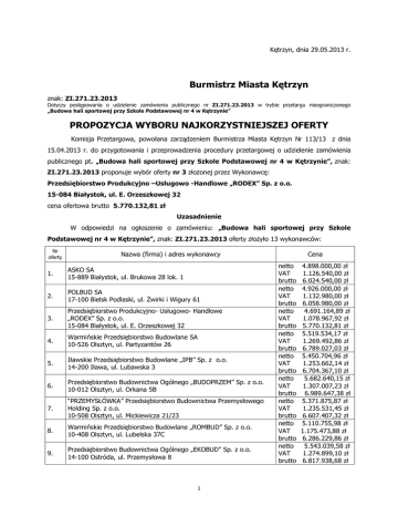 Kętrzyn, dnia 29.05.2013 r. Burmistrz Miasta Kętrzyn znak: ZI.271.23.2013 Dotyczy postępowania o udzielenie zamówienia publicznego nr ZI.271.23.2013 w trybie przetargu nieograniczonego „Budowa hali sportowej przy Szkole Podstawowej nr 4 w Kętrzynie” PROPOZYCJA WYBORU NAJKORZYSTNIEJSZEJ OFERTY Komisja Przetargowa, powołana zarządzeniem Burmistrza Miasta Kętrzyn Nr 113/13 z dnia 15.04.2013 r. do przygotowania i przeprowadzenia procedury przetargowej o udzielenie zamówienia publicznego pt. „Budowa hali sportowej przy Szkole Podstawowej nr 4 w Kętrzynie”, znak: ZI.271.23.2013 proponuje wybór oferty nr 3 złoŜonej przez Wykonawcę: Przedsiębiorstwo Produkcyjno –Usługowo -Handlowe „RODEX” Sp. z o.o. 15-084 Białystok, ul. E. Orzeszkowej 32 cena ofertowa brutto 5.770.132,81 zł Uzasadnienie W odpowiedzi na ogłoszenie o zamówieniu: „Budowa hali sportowej przy Szkole Podstawowej nr 4 w Kętrzynie”, znak: ZI.271.23.2013 oferty złoŜyło 13 wykonawców: Nr oferty Nazwa (firma) i adres wykonawcy 1. ASKO SA 15-889 Białystok, ul. Brukowa 28 lok. 1 2. POLBUD SA 17-100 Bielsk Podlaski, ul. świrki i Wigury 61 3. Przedsiębiorstwo Produkcyjno- Usługowo- Handlowe „RODEX” Sp. z o.o. 15-084 Białystok, ul. E. Orzeszkowej 32 4. Warmińskie Przedsiębiorstwo Budowlane SA 10-526 Olsztyn, ul. Partyzantów 26 5. Iławskie Przedsiębiorstwo Budowlane „IPB” Sp. z o.o. 14-200 Iława, ul. Lubawska 3 6. Przedsiębiorstwo Budownictwa Ogólnego „BUDOPRZEM” Sp. z o.o. 10-012 Olsztyn, ul. Orkana 5B 7. “PRZEMYSŁÓWKA” Przedsiębiorstwo Budownictwa Przemysłowego Holding Sp. z o.o. 10-508 Olsztyn, ul. Mickiewicza 21/23 8. Warmińskie Przedsiębiorstwo Budowlane „ROMBUD” Sp. z o.o. 10-408 Olsztyn, ul. Lubelska 37C 9. Przedsiębiorstwo Budownictwa Ogólnego „EKOBUD” Sp. z o.o. 14-100 Ostróda, ul. Przemysłowa 8 1 Cena netto VAT brutto netto VAT brutto netto VAT brutto netto VAT brutto netto VAT brutto netto VAT brutto netto VAT brutto netto VAT brutto netto VAT brutto 4.898.000,00 zł 1.126.540,00 zł 6.024.540,00 zł 4.926.000,00 zł 1.132.980,00 zł 6.058.980,00 zł 4.691.164,89 zł 1.078.967,92 zł 5.770.132,81 zł 5.519.534,17 zł 1.269.492,86 zł 6.789.027,03 zł 5.450.704,96 zł 1.253.662,14 zł 6.704.367,10 zł 5.682.640,15 zł 1.307.007,23 zł 6.989.647,38 zł 5.371.875,87 zł 1.235.531,45 zł 6.607.407,32 zł 5.110.755,98 zł 1.175.473,88 zł 6.286.229,86 zł 5.543.039,58 zł 1.274.899,10 zł 6.817.938,68 zł 10. 11. 12. 13. netto 6.878.415,94 zł VAT 1.582.035,67 zł brutto 8.460.451,61 zł „MERX” Sp. z o.o. netto 5.198.267,48 zł 15-066 Białystok, ul. Bukowskiego 1/40 VAT 1.195.601,52 zł brutto 6.393.869,00 zł netto 5.383.994,38 zł „AKCESS” Starosta i Wspólnicy Spółka jawna VAT 1.238.318,71 zł 15-863 Białystok, ul. Radzymińska 14 brutto 6.622.313,09 zł netto 5.442.586,06 zł „PRIBO-EPB” Sp. z o.o. VAT 1.251.794,79 zł 19-300 Ełk, ul. Łukasiewicza 6 brutto 6.694.380,85 zł Wykonawcy spełnili wymagane warunki udziału w postępowaniu. Oferty wykonawców nie BUDEXTAN Przedsiębiorstwo Budowlane Sp. z o.o. 11-700 Mrągowo, Marcinkowo 156 podlegają odrzuceniu. Zamawiający w pkt. 13 SIWZ ustalił, Ŝe wyłącznym kryterium, którym będzie się kierował przy wyborze ofert będzie cena- 100 %. Oferty będą oceniane w odniesieniu do najniŜszej ceny przedstawionej przez wykonawców. Oferta z najniŜszą ceną otrzyma maksymalną ilość punktów. Komisja Przetargowa dokonała oceny i porównania ofert, co przedstawia poniŜsza tabela. Nr oferty Nazwa (firma) i adres wykonawcy Liczba pkt w kryterium cena 100% 1. ASKO SA 15-889 Białystok, ul. Brukowa 28 lok. 1 5.770.132,81 zł 6.024.540,00 zł x10 pkt = 9,58 pkt 2. POLBUD SA 17-100 Bielsk Podlaski, ul. świrki i Wigury 61 5.770.132,81 zł 6.058.980,00 zł x10 pkt = 9,52 pkt 3. Przedsiębiorstwo Produkcyjno- Usługowo-Handlowe „RODEX” Sp. z o.o. 15-084 Białystok, ul. E. Orzeszkowej 32 5.770.132,81 zł 5.770.132,81 zł x10 pkt = 10 pkt 4. Warmińskie Przedsiębiorstwo Budowlane SA 10-526 Olsztyn, ul. Partyzantów 26 5.770.132,81 zł 6.789.027,03 zł x10 pkt = 8,50 pkt 5. Iławskie Przedsiębiorstwo Budowlane „IPB” Sp. z o.o. 14-200 Iława, ul. Lubawska 3 5.770.132,81 zł 6.704.367,10 zł x10 pkt = 8,61 pkt 6. 7. 8. 9. Przedsiębiorstwo Budownictwa Ogólnego „BUDOPRZEM” Sp. z o.o. 10-012 Olsztyn, ul. Orkana 5B “PRZEMYSŁÓWKA” Przedsiębiorstwo Budownictwa Przemysłowego Holding Sp. z o.o. 10-508 Olsztyn, ul. Mickiewicza 21/23 Warmińskie Przedsiębiorstwo Budowlane „ROMBUD” Sp. z o.o. 10-408 Olsztyn, ul. Lubelska 37C Przedsiębiorstwo Budownictwa Ogólnego „EKOBUD” Sp. z o.o. 14-100 Ostróda, ul. Przemysłowa 8 5.770.132,81 zł 6.989.647,38 zł x10 pkt = 8,26 pkt 5.770.132,81 zł 6.607.407,32 zł x10 pkt = 8,73 pkt 5.770.132,81 zł 6.286.229,86 zł x10 pkt = 9,18 pkt 5.770.132,81 zł 6.817.938,68 zł x10 pkt = 8,46 pkt 10. BUDEXTAN Przedsiębiorstwo Budowlane Sp. z o.o. 11-700 Mrągowo, Marcinkowo 156 5.770.132,81 zł 8.460.451,61 zł x10 pkt = 6,82 pkt 11. „MERX” Sp. z o.o. 15-066 Białystok, ul. Bukowskiego 1/40 5.770.132,81 zł 6.393.869,00 zł x10 pkt = 9,02 pkt 12. „AKCESS” Starosta i Wspólnicy Spółka jawna 15-863 Białystok, ul. Radzymińska 14 5.770.132,81 zł 6.622.313,09 zł x10 pkt = 8,71 pkt 2 „PRIBO-EPB” Sp. z o.o. 19-300 Ełk, ul. Łukasiewicza 6 13. 5.770.132,81 zł 6.694.380,85 zł x10 pkt = 8,62 pkt Mając na względzie powyŜsze najkorzystniejszą ofertę złoŜył Wykonawca: Przedsiębiorstwo Produkcyjno –Usługowo -Handlowe „RODEX” Sp. z o.o., 15-084 Białystok, ul. E. Orzeszkowej 32. Komisja Przetargowa proponuje wybór wyŜej wskazanej oferty do realizacji zadania: „Budowa hali sportowej przy Szkole Podstawowej nr 4 w Kętrzynie”. Przewodniczący Komisji Przetargowej (-) Karol Kwiatkowski Zatwierdził Z up. Burmistrza Miasta (-) Andrzej Degórski Z-ca Burmistrza Miasta Sporządziła: B.S. 3