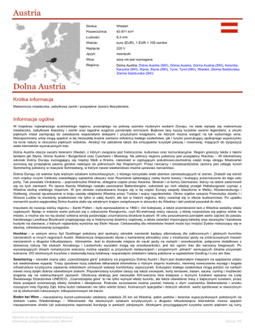 Austria Stolica: Wiedeń Powierzchnia: 83 871 km² Ludność: 8,3 mln Waluta: euro (EUR), 1 EUR = 100 centów Napięcie: 220 V Język: niemiecki Wiza: wiza nie jest wymagana Regiony: Dolna Austria, Dolna Austria (SKI), Górna Austria, Górna Austria (SKI), Karyntia, Karyntia (SKI), Styria, Styria (SKI), Tyrol, Tyrol (SKI), Wiedeń, Ziemia Salzburska, Ziemia Salzburska (SKI) Dolna Austria Krótka informacja Malownicze miasteczka, zabytkowe zamki i przepiękne Jezioro Nezyderskie. Informacje ogólne W krajobraz największego austriackiego regionu, przeciętego na połowę szeroko rozlanymi wodami Dunaju, na stałe wpisały się malownicze miasteczka, zabytkowe klasztory i zamki oraz łagodne wzgórza porośnięte winnicami. Bajkowe lasy kuszą turystów swoimi legendami, a uliczki pięknych miast zachęcają do zwiedzania wspaniałymi sklepami i przytulnymi knajpkami, do których można wstąpić na łyk wybornego wina. Niezapomniany urlop mogą spędzić w tej niezwykłej krainie zarówno miłośnicy białego szaleństwa, jak i turyści poszukujący spokojnego wypoczynku na łonie natury w otoczeniu pięknych widoków. Atrakcji nie zabraknie także dla entuzjastów turystyki pieszej i rowerowej, mających do dyspozycji wiele kilometrów wyznaczonych tras. Dolna Austria otacza swoimi terenami Wiedeń, z którym związana jest historycznie, kulturowo oraz komunikacyjnie. Region graniczy także z takimi landami jak Styria, Górna Austria i Burgenland oraz Czechami i Słowacją. Na północy regionu położony jest przepiękny Wachau – 40 kilometrowy odcinek Doliny Dunaju rozciągający się między Melk a Krems, natomiast w zajmującym południowo-zachodnią część kraju okręgu Mostviertel wznoszą się przepiękne pasma górskie należące do północnych Alp Wapiennych. Przez narciarzy i snowboardzistów ceniony jest odległy kurort Semmering położony w masywie Schneeberg, w którym nawet weekendowo można uprawiać narciarstwo. Dolina Dunaju od wieków była ważnym szlakiem komunikacyjnym, z którego korzystało wiele plemion zamieszkujących te ziemie. Znaleźli się wśród nich między innymi Celtowie zasiedlający sąsiednie obszary oraz Rzymianie spławiający rzeką liczne towary i budujący przeznaczone do tego celu porty. Tak powstała Vindobona – poprzedniczka Wiednia, oblegana często przez Awarów, Słowian i w końcu Germanów, którzy na dobre zadomowili się na tych ziemiach. Po epoce Karola Wielkiego nastało panowanie Babenbergów, natomiast po nich władzę przejęli Habsburgowie czyniąc z Wiednia stolicę wielkiego imperium. W tym okresie rozbudowano liczące się w tej części Europy zespoły klasztorne w Melku, Klosterneuburgu i Gottweig, chociaż spustoszenie w kraju zasiały oblężenie Wiednia przez Turków i wojny napoleońskie. Okres rządów cesarza Franciszka Józefa I i Wiosna Ludów to momenty przełomowe nie tylko w całej Austrii, ale też w historii regionu, który rozwinął się w sferze budownictwa. Po upadku monarchii austro-węgierskiej Dolna Austria stała się odrębnym krajem związkowym w stosunku do Wiednia i taki podział pozostał do dziś. Impulsem do rozwoju stolicy regionu – Sankt Polten – było wprowadzenie w 1860 r. linii kolejowej, a także przeniesienie tam z Wiednia siedziby władz rządowych. Będąc w mieście warto pokusić się o zobaczenie Klangturmu, czyli 80-metrowej wieży ratusza, z której rozpościera się piękny widok na miasto, a można się na nią dostać szklaną windą podziwiając urozmaiconą strukturę budowli. W celu poszukiwania pamiątek warto zajrzeć do pasażu handlowego Landhaus Boulevard znajdującego się w historycznej dzielnicy rządowej, a także zwiedzić imponującą katedrę oraz secesyjne i barokowe budynki na starówce, z których najbardziej wyróżnia się Stohr Hause. Ciekawostką dla miłośników historii może być Instytut Żydów mieszczący się w dawnej, odrestaurowanej synagodze. Hochkar – w samym sercu Apl Gostlinger położony jest spokojny ośrodek narciarski będący alternatywą dla zatłoczonych i głośnych kurortów narciarskich w innych regionach Austrii. Malownicza miejscowość słynie z kameralnej atmosfery oraz z możliwości jazdy na zróżnicowanych trasach narciarskich o długości kilkudziesięciu kilometrów. Jest to doskonałe miejsce do nauki jazdy na nartach i snowboardzie, połączone dodatkowo z dziewiczą naturą. Na stokach Annabergu i Lackenhofu wyszaleć mogą się snowboardziści, jest też ogrom tras dla narciarzy biegowych. Po wyczerpujących dniach romantyczne wieczory można spędzić w przytulnych restauracjach i przyjemnych „almach” serwujących lokalne przysmaki kulinarne. DO okolicznych kurortów z doskonałą bazą hotelową i wspaniałymi widokami należą położone w sąsiedztwie Gostling i Lunz am See. Semmering – ośrodek znany jako „czarodziejska góra” położony na pograniczu Dolnej Austrii i Styrii jest doskonałym miejscem na spędzenia urlopu lub weekendowe wypady. Trasy zjazdowe liczą zaledwie kilkanaście kilometrów o różnym stopniu trudności, niemniej nowoczesne wyciągi i bogata infrastruktura turystyczna zapewnia miłośnikom zimowych wakacji komfortowy wypoczynek. Entuzjaści białego szaleństwa mogą jeździć na nartach nawet nocą dzięki dobrze oświetlonym stokom. Popularnością turystów cieszy się także snowpark, korty tenisowe, basen, sauna, curling i możliwość ścigania się na nadmuchanych oponach. Okoliczną atrakcją jest niezwykła XIX-wieczna linia kolejowa z licznymi tunelami wpisana na Listę Światowego Dziedzictwa UNESCO. „Czarodziejska góra” to nie tylko wymysł władz kurortu, ale także oświetlone trasy z bajecznymi tunelami, przez które przejazd urozmaicają efekty świetlne i dźwiękowe. Podczas szusowania można poznać historię o złym czarowniku Siebensteinie i smoku noszącym imię Ognisty Ząb, która budzi ciekawość nie tylko wśród dzieci. Kulinarnych spec