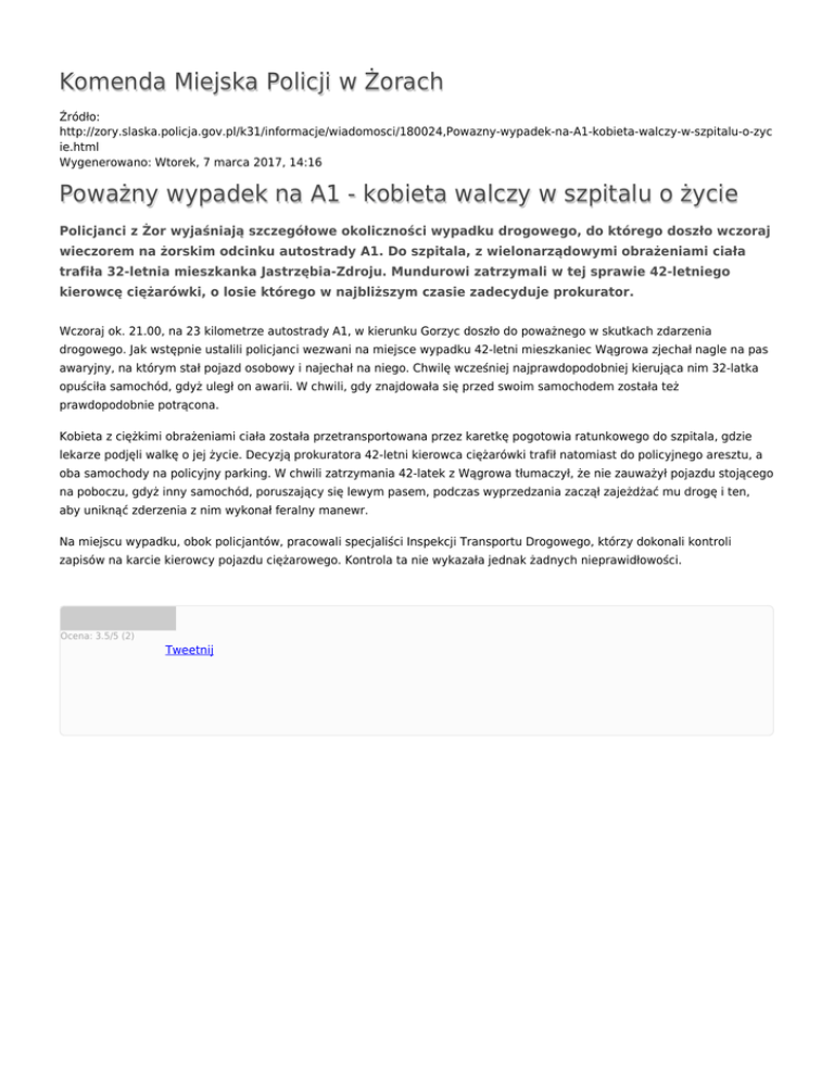 Komenda Miejska Policji w Żorach Źródło: http://zory.slaska.policja.gov.pl/k31/informacje/wiadomosci/180024,Powazny-wypadek-na-A1-kobieta-walczy-w-szpitalu-o-zyc ie.html Wygenerowano: Wtorek, 7 marca 2017, 14:16 Poważny wypadek na A1 - kobieta walczy w szpitalu o życie Policjanci z Żor wyjaśniają szczegółowe okoliczności wypadku drogowego, do którego doszło wczoraj wieczorem na żorskim odcinku autostrady A1. Do szpitala, z wielonarządowymi obrażeniami ciała trafiła 32-letnia mieszkanka Jastrzębia-Zdroju. Mundurowi zatrzymali w tej sprawie 42-letniego kierowcę ciężarówki, o losie którego w najbliższym czasie zadecyduje prokurator. Wczoraj ok. 21.00, na 23 kilometrze autostrady A1, w kierunku Gorzyc doszło do poważnego w skutkach zdarzenia drogowego. Jak wstępnie ustalili policjanci wezwani na miejsce wypadku 42-letni mieszkaniec Wągrowa zjechał nagle na pas awaryjny, na którym stał pojazd osobowy i najechał na niego. Chwilę wcześniej najprawdopodobniej kierująca nim 32-latka opuściła samochód, gdyż uległ on awarii. W chwili, gdy znajdowała się przed swoim samochodem została też prawdopodobnie potrącona. Kobieta z ciężkimi obrażeniami ciała została przetransportowana przez karetkę pogotowia ratunkowego do szpitala, gdzie lekarze podjęli walkę o jej życie. Decyzją prokuratora 42-letni kierowca ciężarówki trafił natomiast do policyjnego aresztu, a oba samochody na policyjny parking. W chwili zatrzymania 42-latek z Wągrowa tłumaczył, że nie zauważył pojazdu stojącego na poboczu, gdyż inny samochód, poruszający się lewym pasem, podczas wyprzedzania zaczął zajeżdżać mu drogę i ten, aby uniknąć zderzenia z nim wykonał feralny manewr. Na miejscu wypadku, obok policjantów, pracowali specjaliści Inspekcji Transportu Drogowego, którzy dokonali kontroli zapisów na karcie kierowcy pojazdu ciężarowego. Kontrola ta nie wykazała jednak żadnych nieprawidłowości. Ocena: 3.5/5 (2) Tweetnij